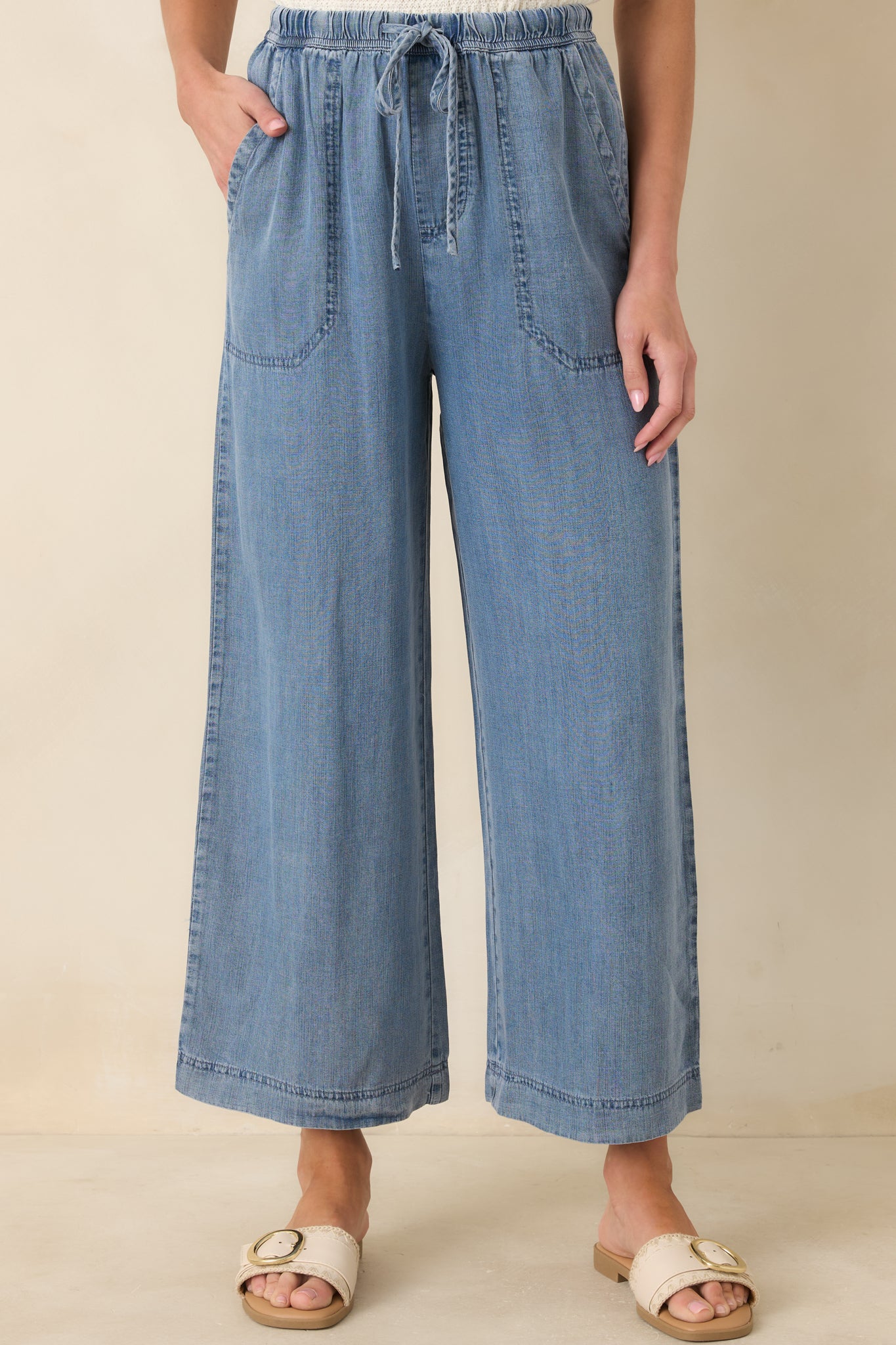 Wherever You're Going Medium Wash Denim Wide Leg Drawstring Pants