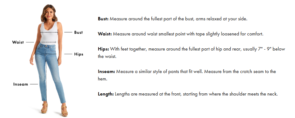 Wearing a bra and panties, place the measuring tape comfortably around the bust, waist and hips. To determine the most accurate measurements, ensure that the tape is placed evenly around and parallel to the floor.