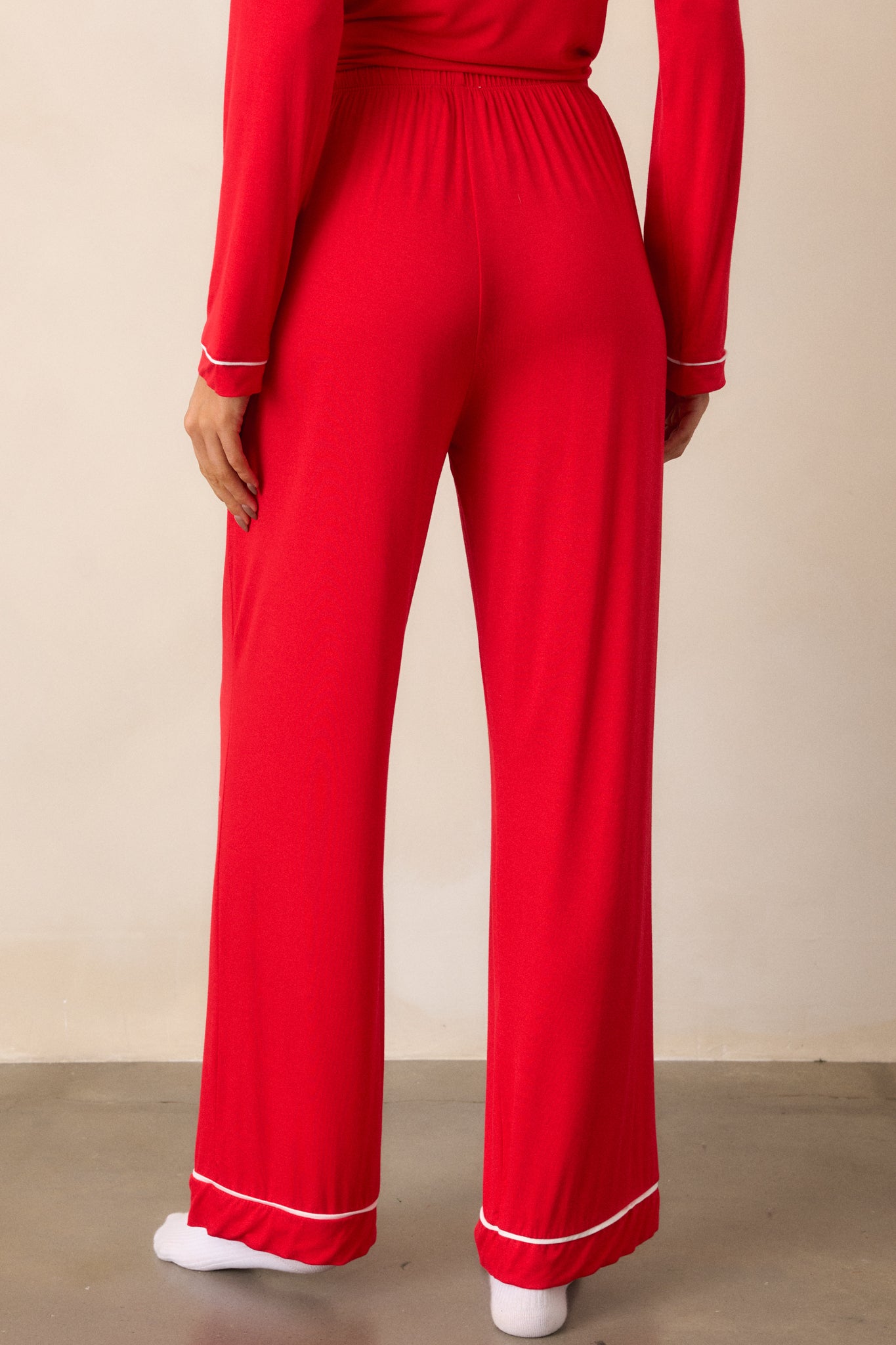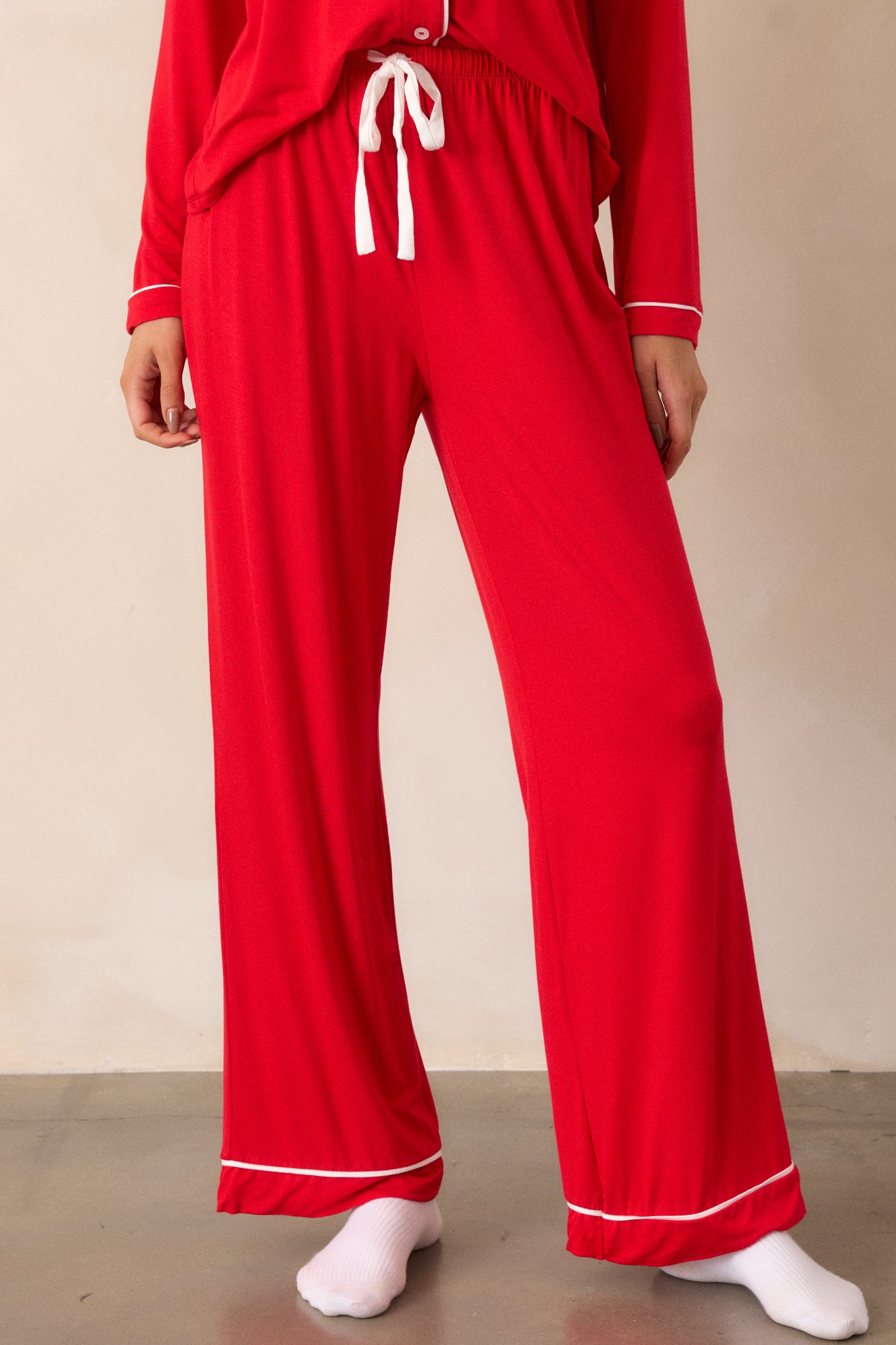 Cozy up in these A Glimpse into Tomorrow Red Pajama Pants. Made with super soft fabric. these pants are perfect for a restful night's sleep. The beautiful forest green color adds a pop of color to your wardrobe. Relax and recharge in style with these comfortable and stylish pajama pants. These red Pajama Pants feature an elastic drawstring waistband with a white string. white trim detailing and long relaxed pant legs.