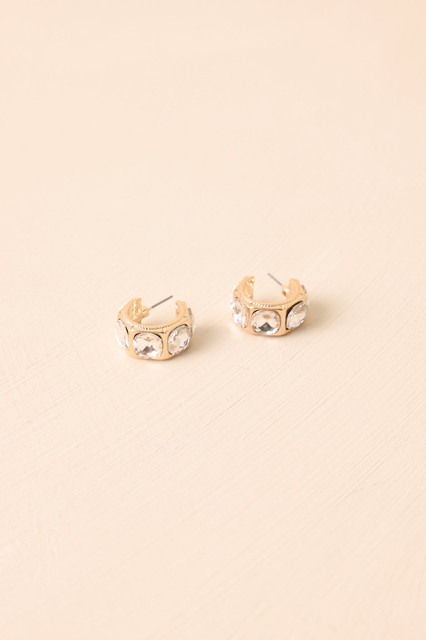 The A Promise Kept Gold Rhinestone Embellished Hoop Earrings add a lasting sparkle. made to stay with you through every moment worth holding on to. These gold earrings feature an open hoop design. a chunky silhouette. bezel-set clear rhinestones along the outer curve. and secure post back closures.
