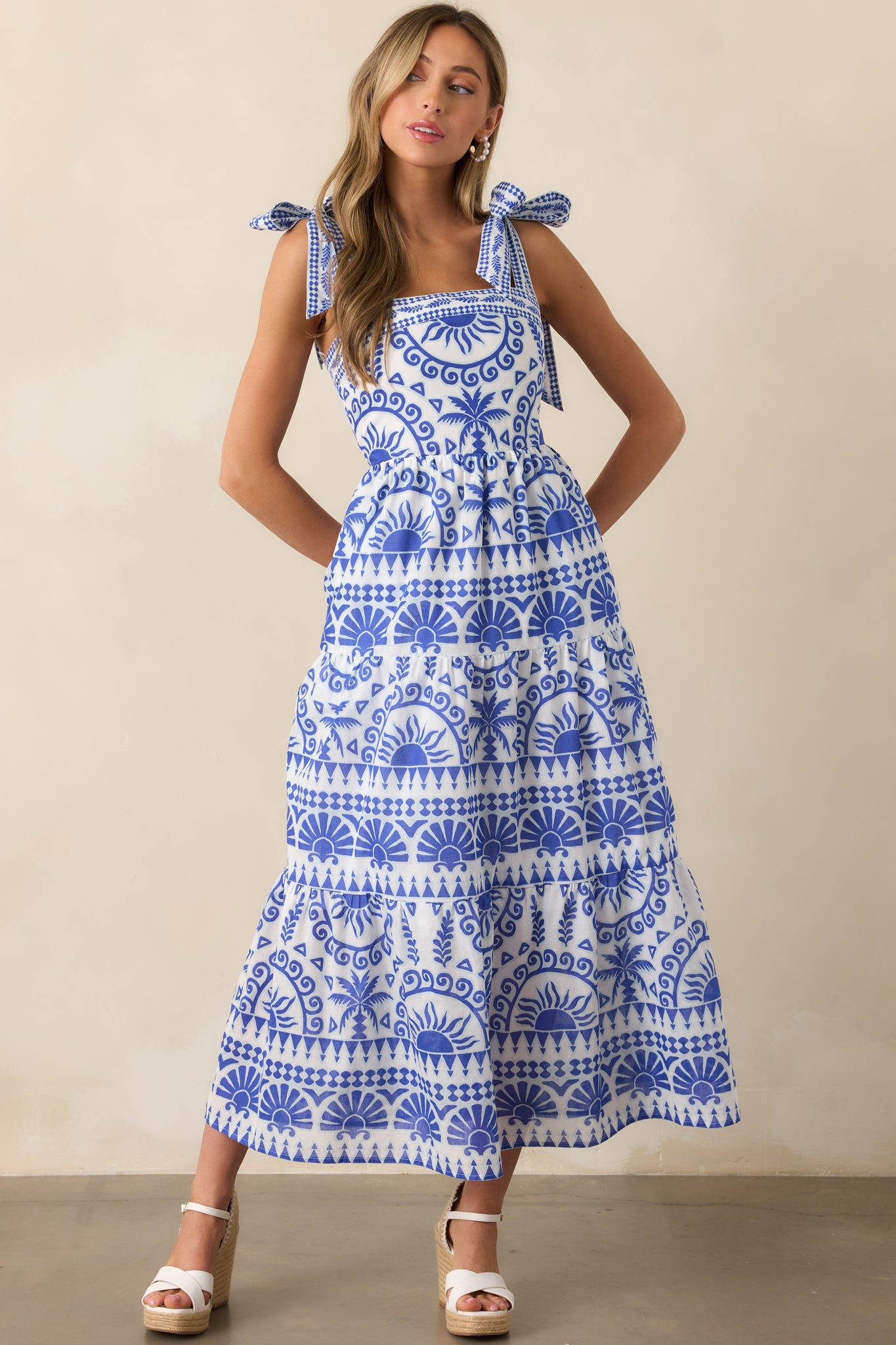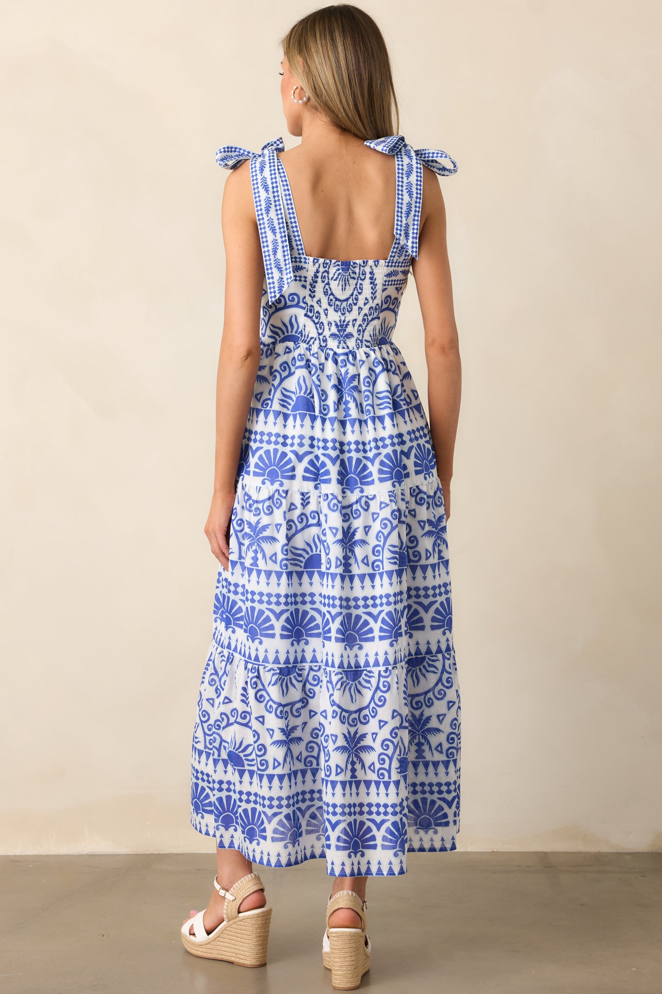 Unwind and enjoy your afternoon in our comfortable Afternoon Sips Cotton Blue Tropical Print Maxi Dress. Perfect for any summer day. this dress is made with soft cotton and features a vibrant tropical print. Stay stylish and cool with this must-have dress. This dress features a straight neckline. a beautiful tropical print throughout. maxi length. smocked back and self-tie shoulders.