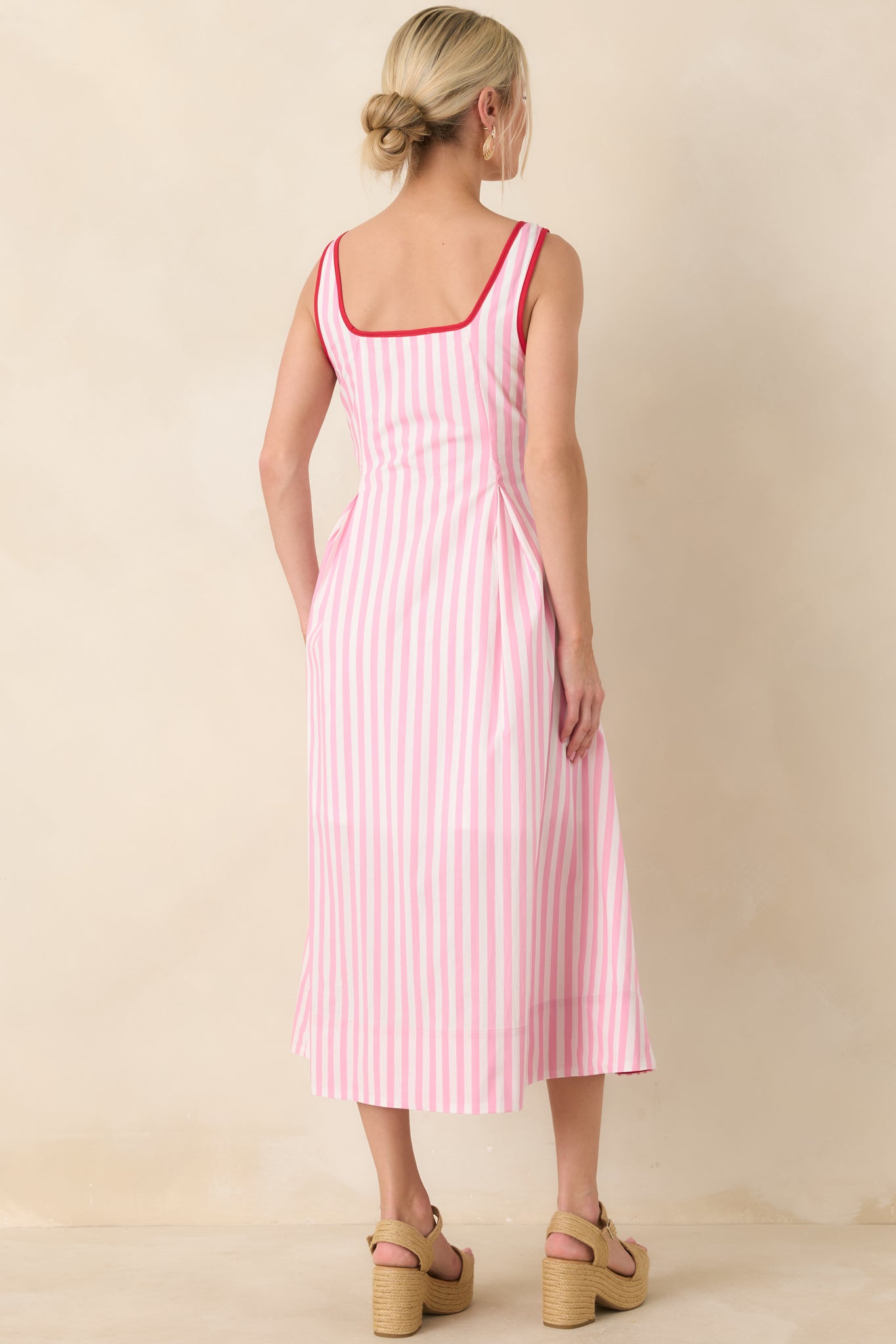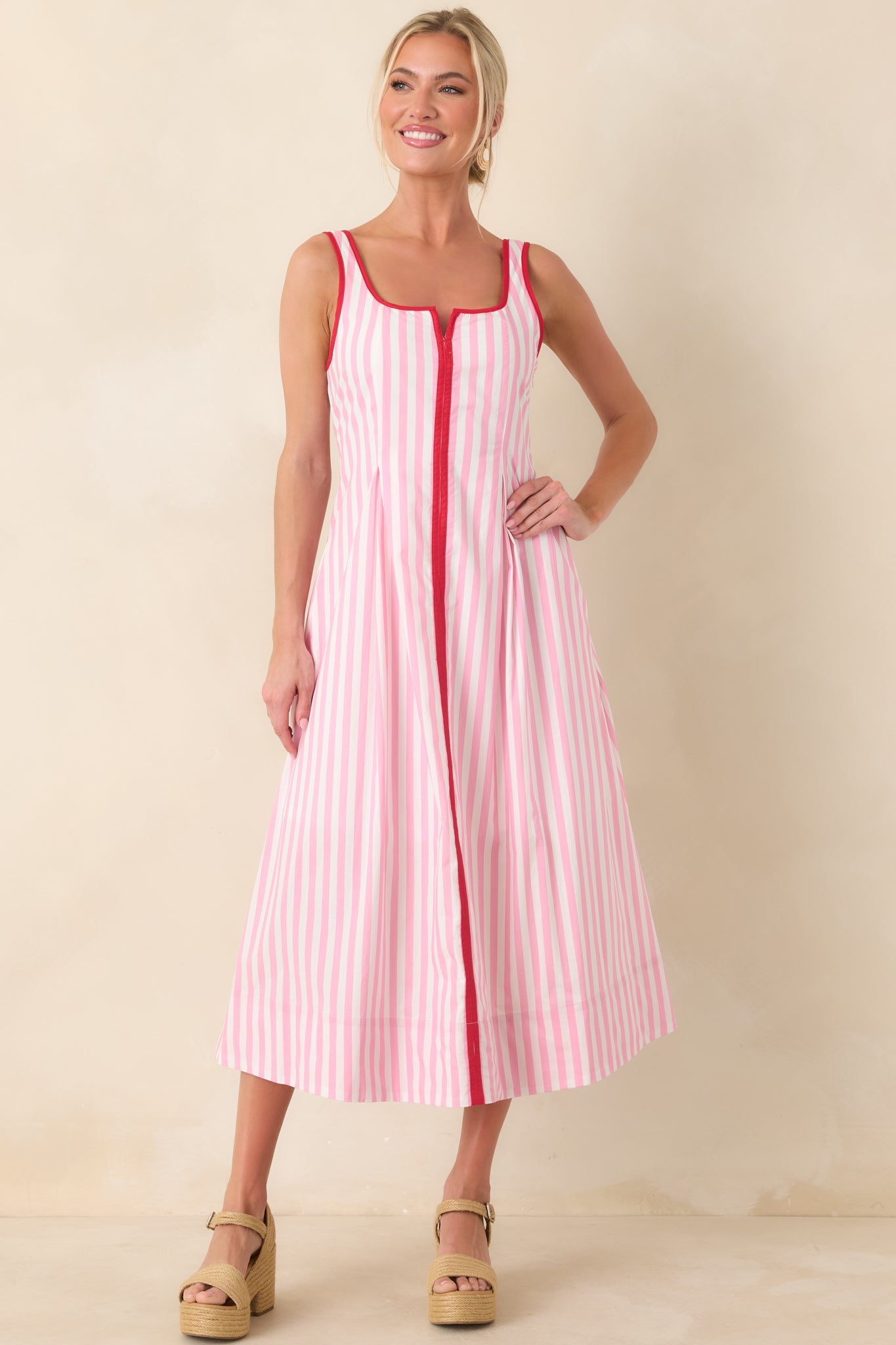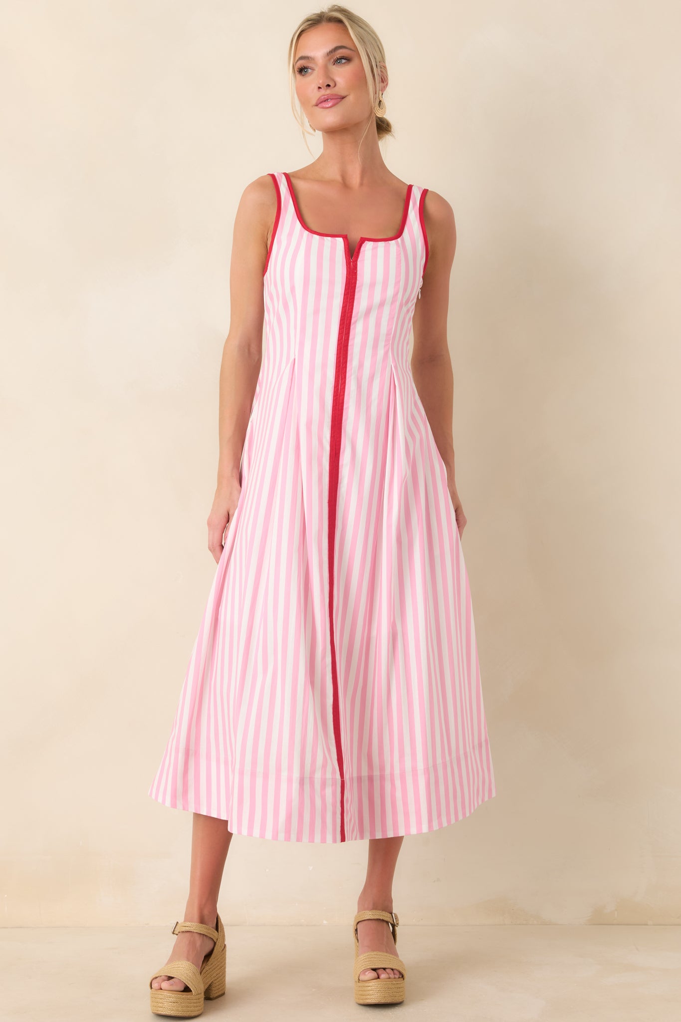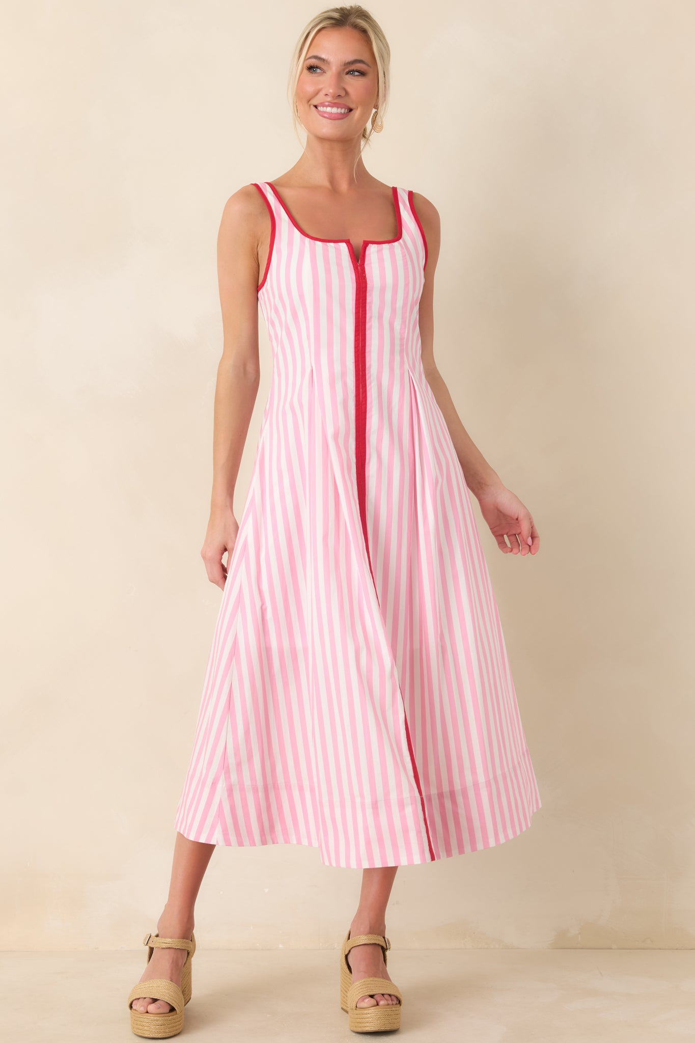Step into sunshine-ready style with our All Smiles Pink & White Stripe Midi Dress. Featuring soft pink and white vertical stripes with bold red trim details. this flattering midi dress creates a beautifully elongating silhouette. The fitted bodice flows into a breezy. feminine skirt. making it perfect for everything from brunch dates to warm-weather events. Designed with a hidden side zipper for a seamless fit. this dress combines structure and comfort for an effortlessly polished look. This pink and white striped midi dress features vertical stripes. red trim accents. a fitted bodice. a flowy midi-length skirt. and a hidden side zipper closure.