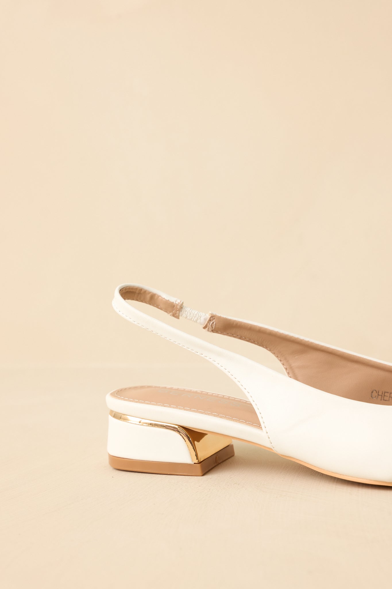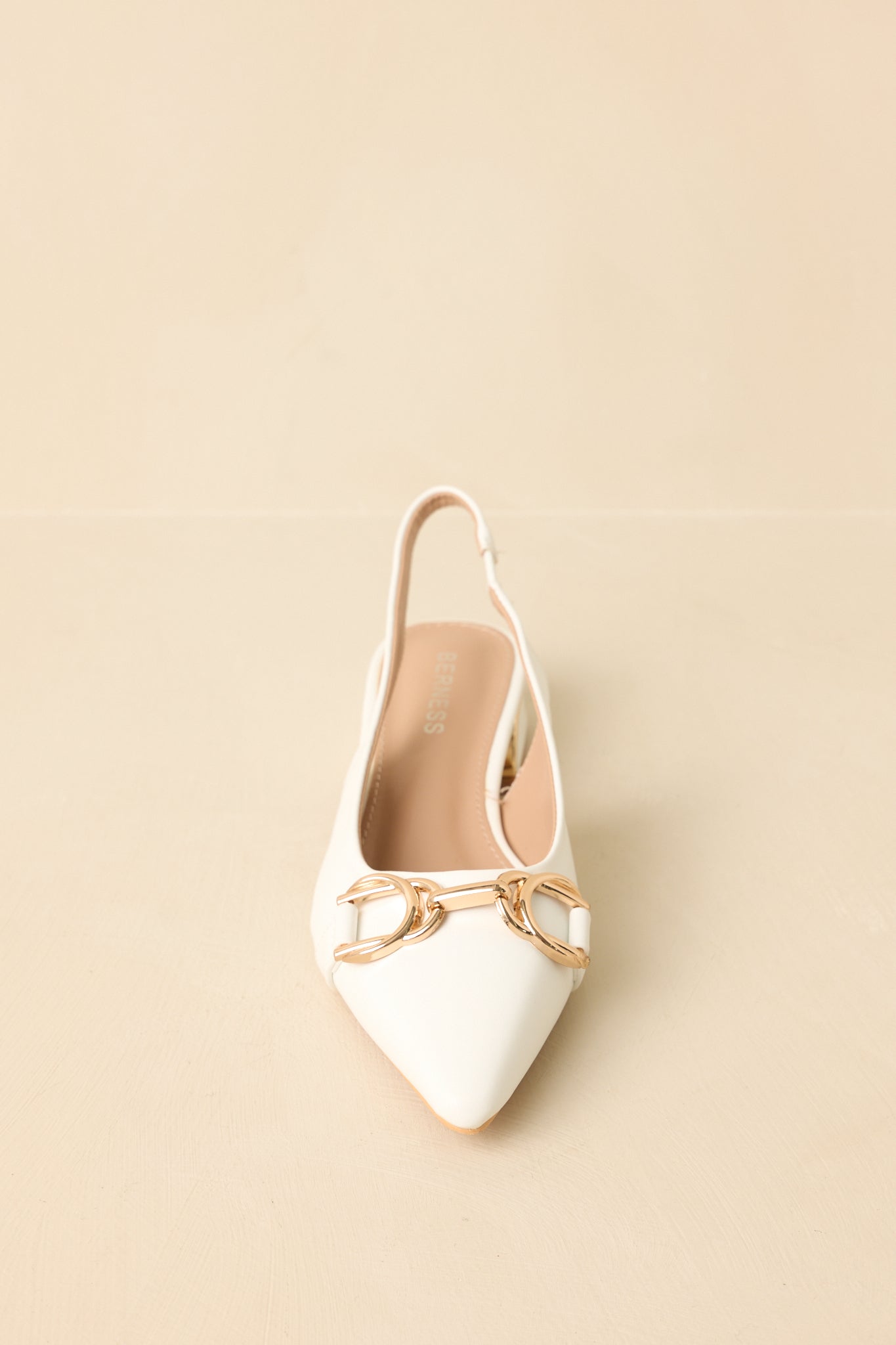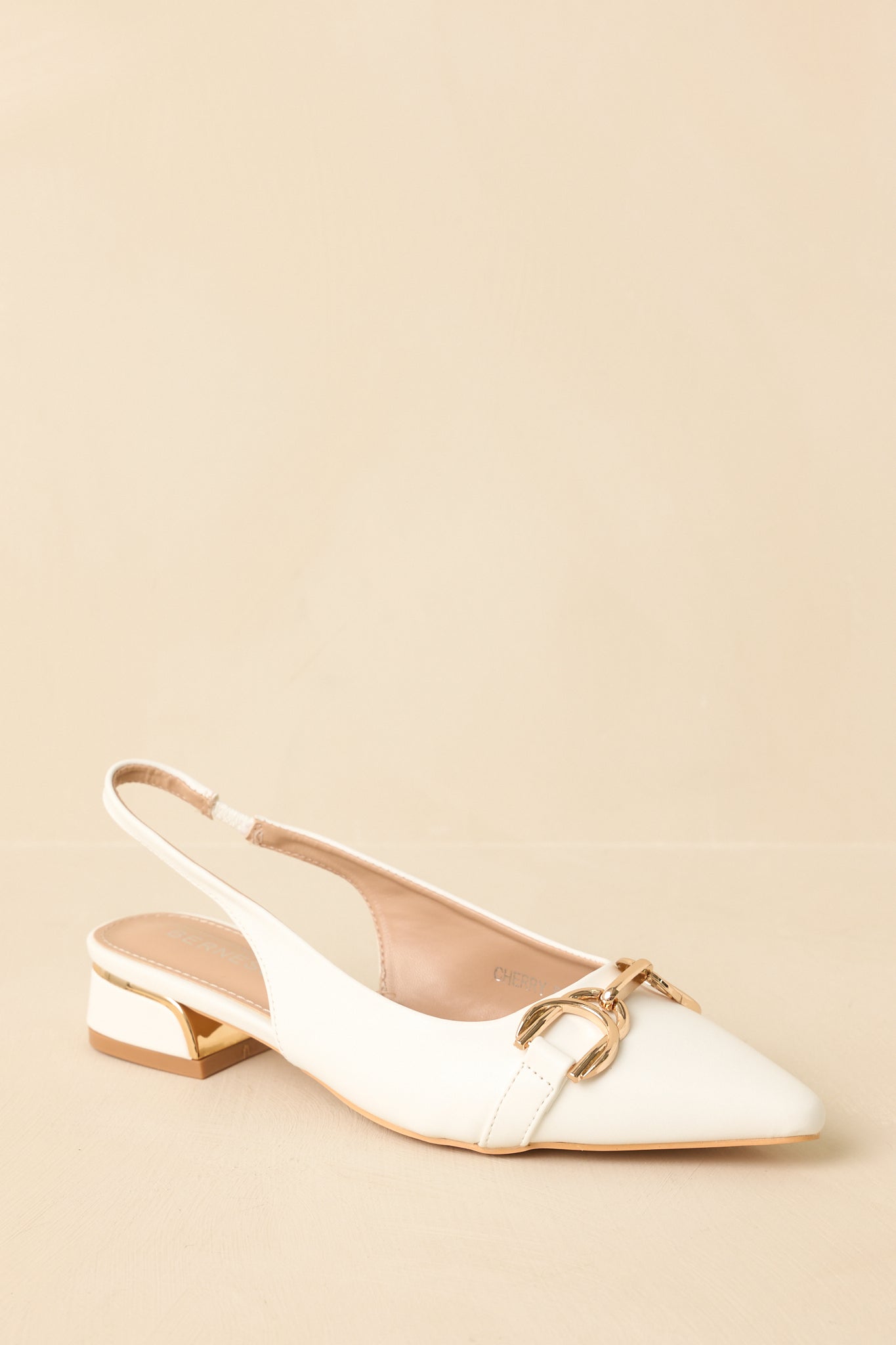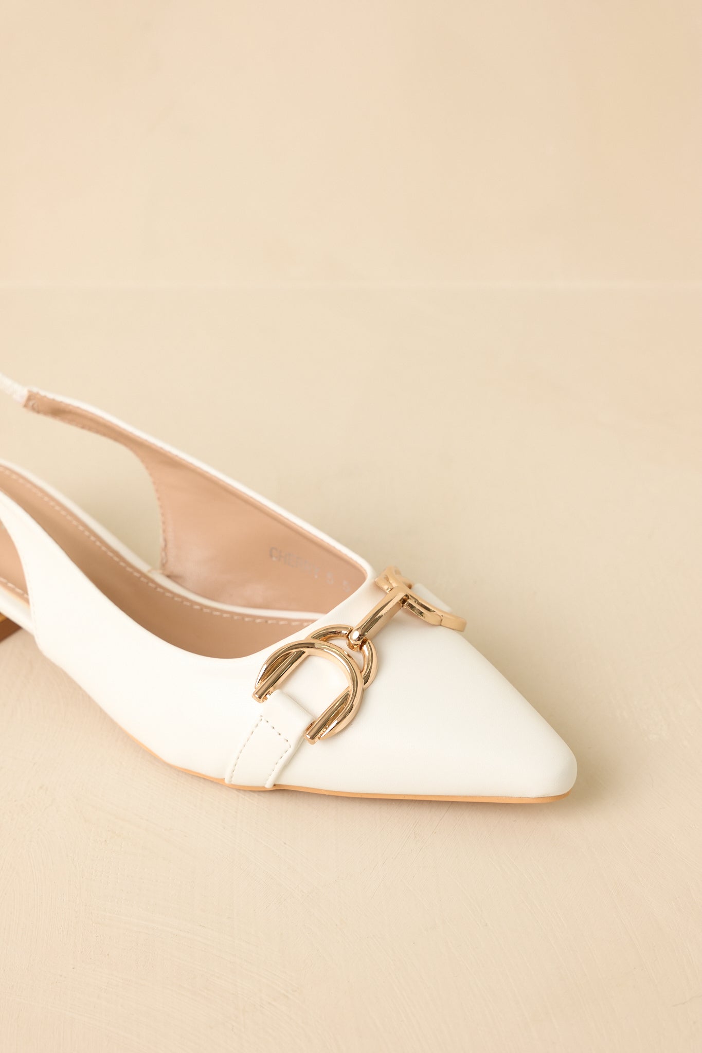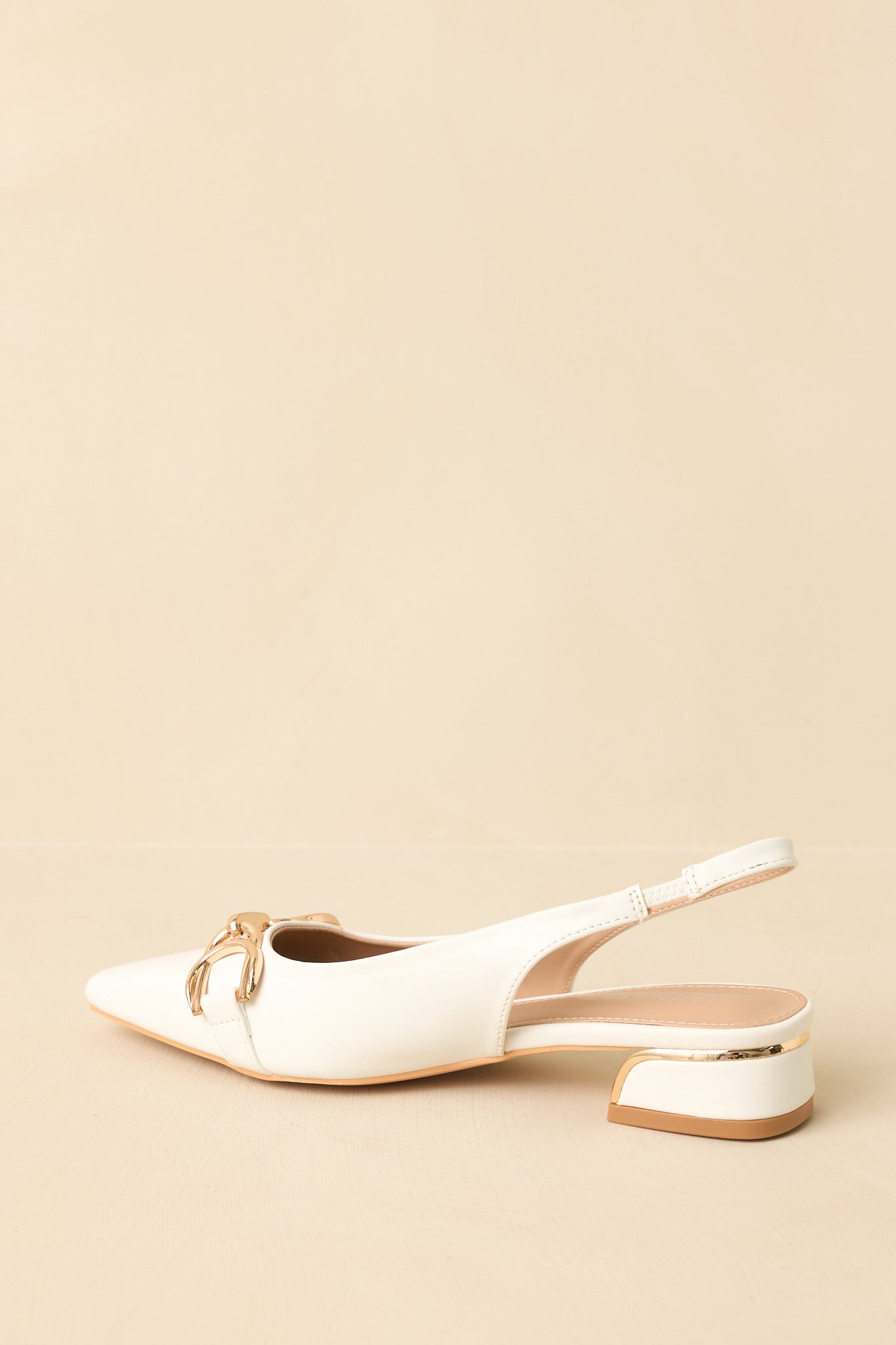 Classic with a modern edge. the Always Everything White Pointed Toe Slingback Low Block Heels are the kind of shoe you'll reach for again and again. The pointed toe gives them a polished look. while the gold hardware detail adds just the right amount of interest without feeling overdone. Easy to slip on and comfortable enough for all-day wear. they're perfect for everything from workdays to weekend plans when you want to look put-together with minimal effort. These white flats feature a faux leather upper with a pointed toe silhouette and a sleek slingback strap for a secure fit. A decorative gold-tone hardware accent sits at the front. adding subtle structure and visual interest. The low-profile sole provides easy. comfortable wear. while the slip-on slingback design allows for flexibility and movement.