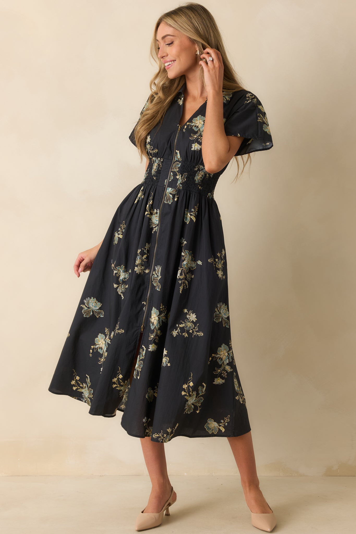 The Always Welcome Navy Multi Floral Print Cotton Smocked Waist Midi Dress fits right in wherever you go. an easy. flattering style that feels perfectly at home for any occasion. This navy midi dress features a multicolor floral print. a collared v-neckline. functional front zipper closure. short sleeves. a wide smocked waistband. and functional pockets.