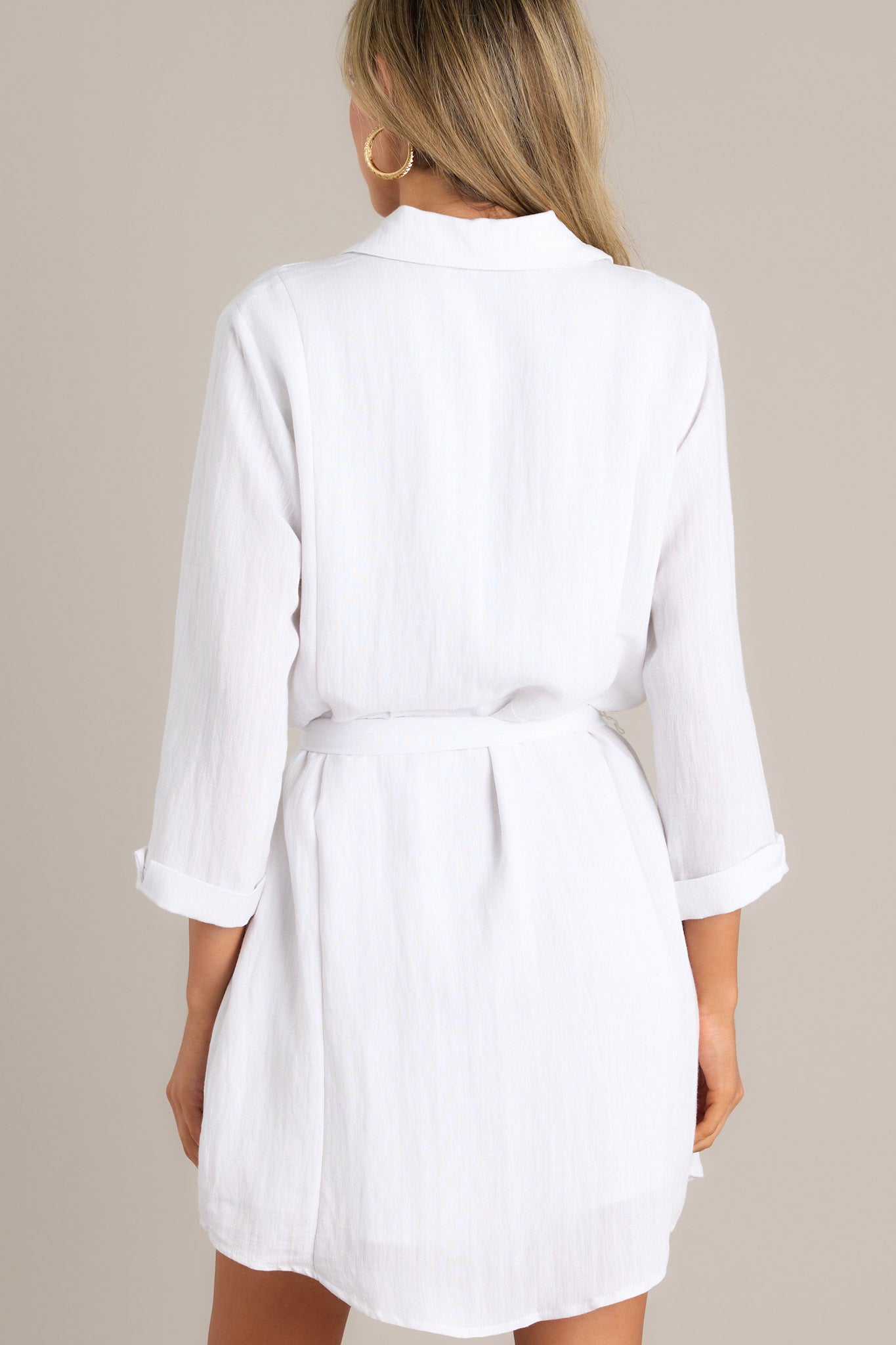 Get ready to turn heads with the Angel's Kiss White Belted Mini Dress! This flirty and feminine dress features a delicate white color and a playful mini length. The belted waist accentuates your curves. while the lightweight fabric ensures comfort and breathability. A must-have addition to any fashionista's wardrobe! This white mini dress features a collared v-neckline. a functional pull-through belt. functional hip pockets. and cuffed quarter length sleeves.