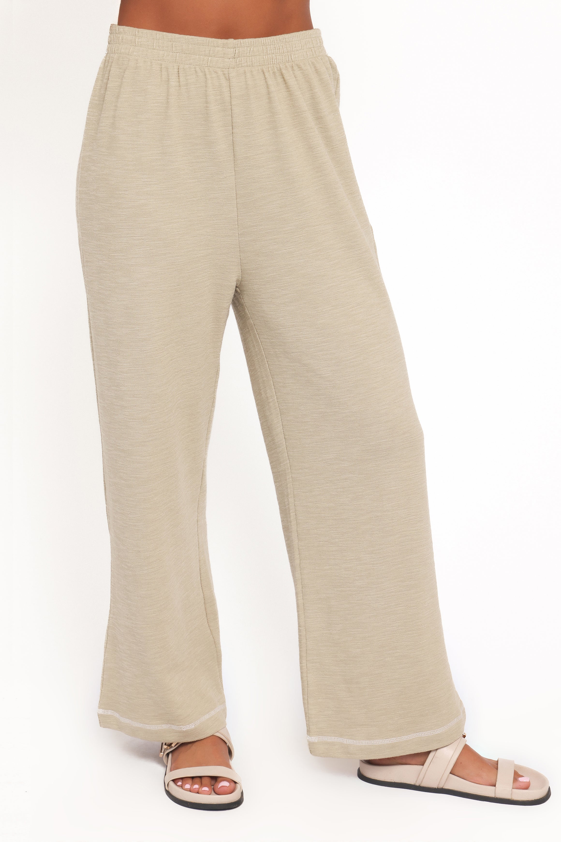 Featuring a soft knit fabric. this chic two-piece set includes a relaxed-fit top with a rounded neckline and short sleeves. perfect for layering or wearing solo. The high-rise pants come with an elasticised waistband for all-day ease and a timeless straight-leg silhouette. finished with contrast stitching for added flair.