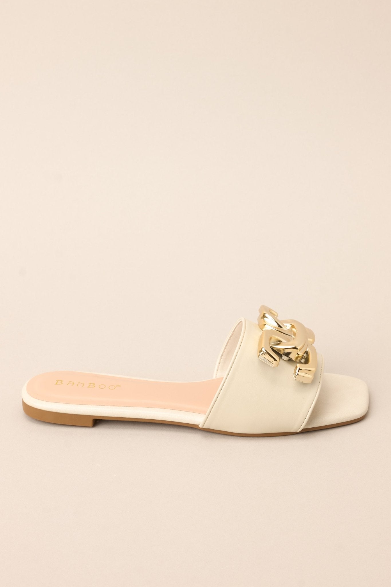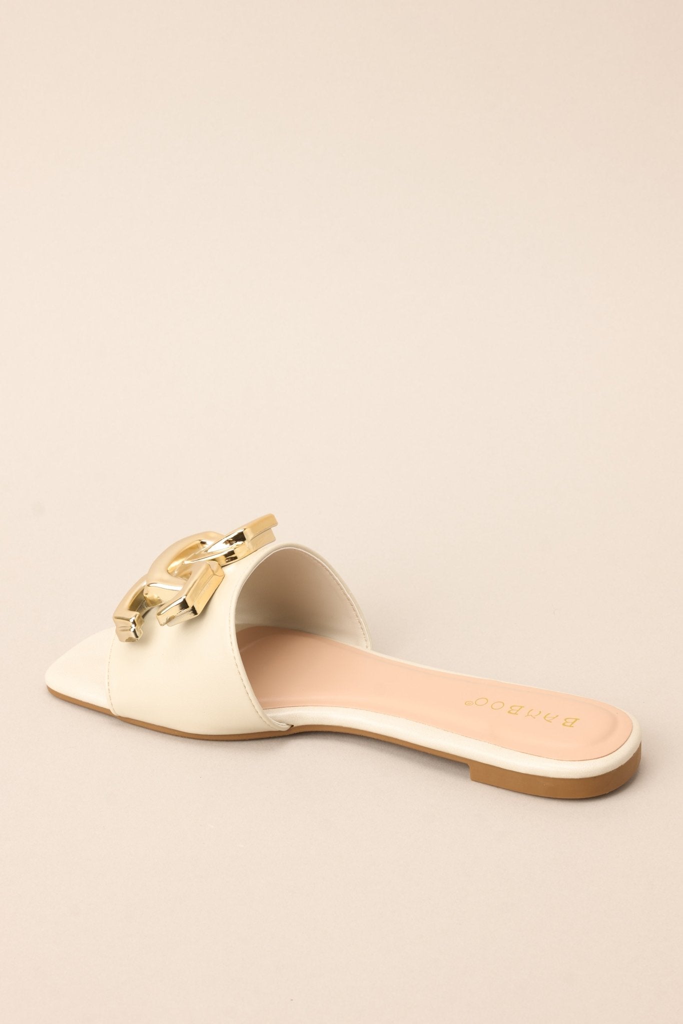 Step into style with our Another One Down Ivory Sandals! These sleek and chic sandals will elevate any outfit with their trendy design and comfortable fit. So kick back. relax. and let your feet do the talking (in a sassy and stylish way. of course). These sandals feature a slip on style. and a large gold buckle-like design.
