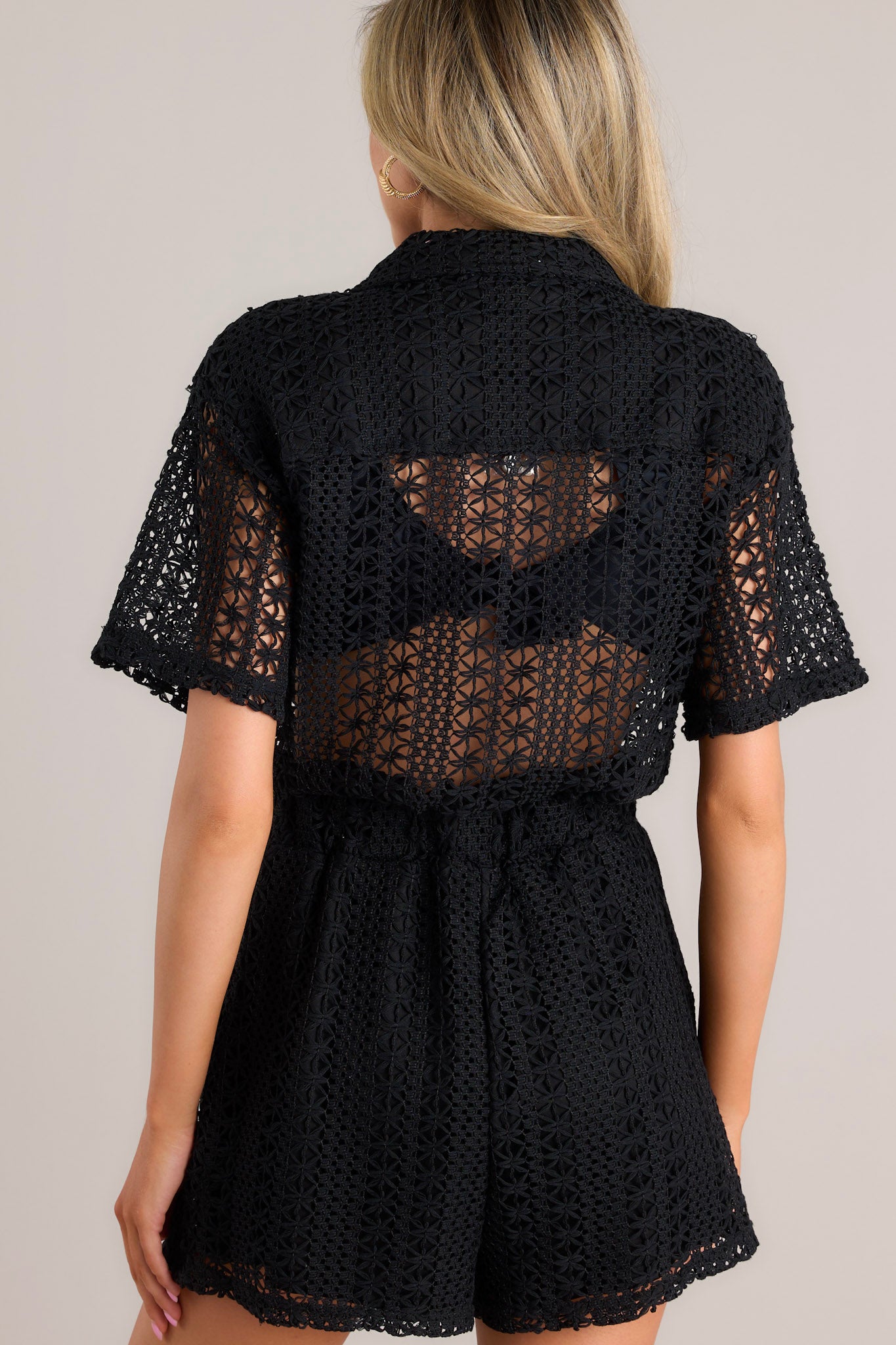 Elevate your summer style with our Barefoot On The Beach Black Open Knit Cover Up Romper. This black. open knit design is perfect for showing off your swimwear while providing coverage. Embrace that carefree. beachy vibe with this must-have piece. This black open knit romper features a collared neckline. functional buttons. faux breast pockets. an open knit design. a fitted waistband. and functional hip pockets.