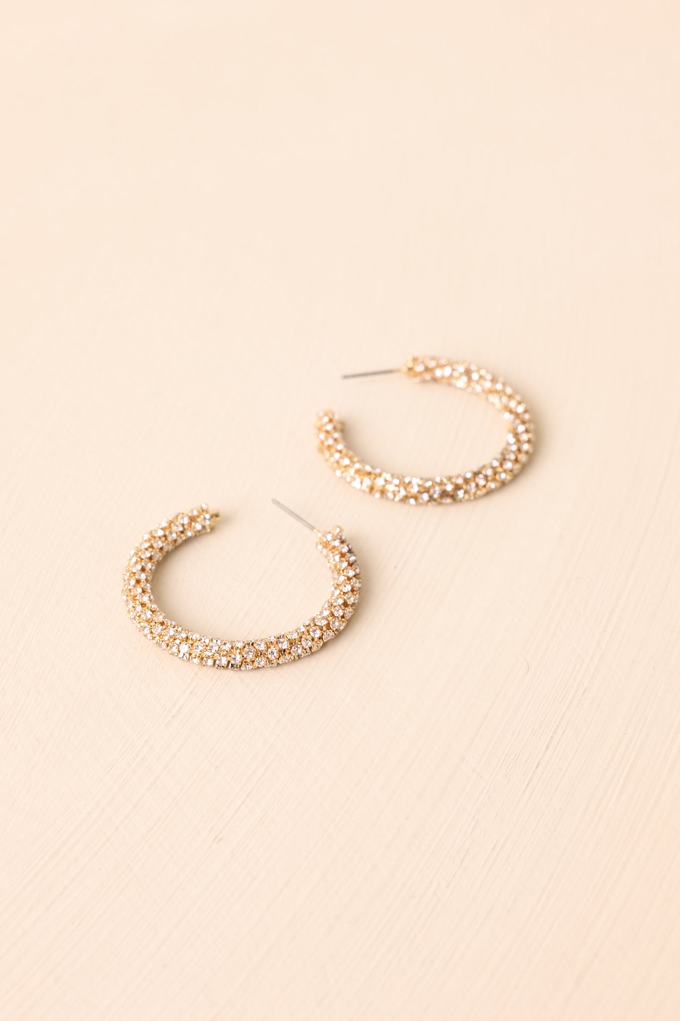 The Been A Long Time Coming Gold Rhinestone Hoop Earrings are made for those well-deserved moments. bringing just the right sparkle when it's finally your time to shine. These hoop earrings feature a medium-sized hoop design. gold metal frames fully encrusted in clear rhinestone pavé. finished with a standard post back closure.