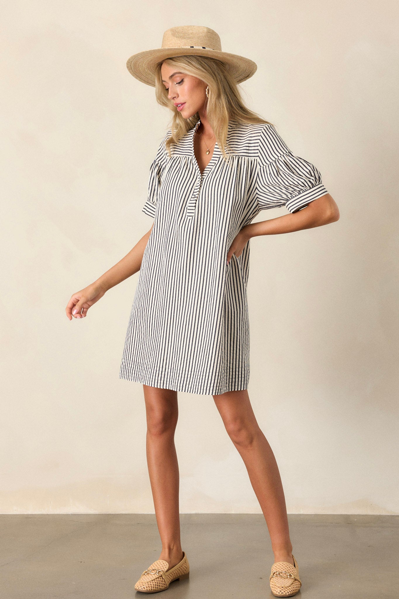 Look effortlessly chic in our Bitter Sweet Symphony Navy Stripe Mini Dress. Made with a classic navy and white stripe pattern. this dress is perfect for any casual occasion. The lightweight fabric and flattering silhouette provide both comfort and style. Elevate your wardrobe and feel confident in this versatile dress. This mini dress features a v-neckline. a button up bust. a relaxed fit. a vertical navy and white stripe design. and short sleeves.