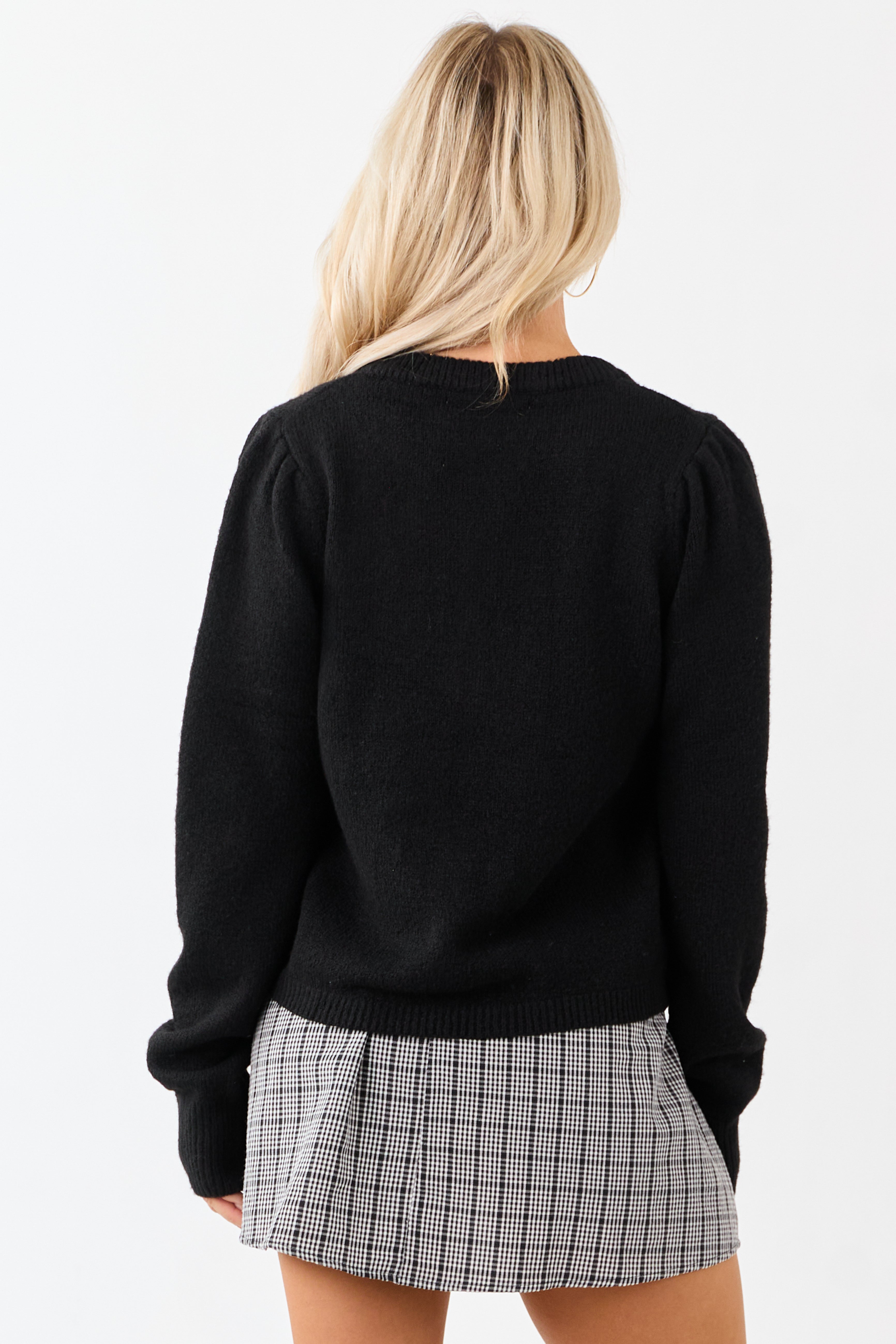 - This warm cardigan is made in classic black. perfect for layering with any outfit.