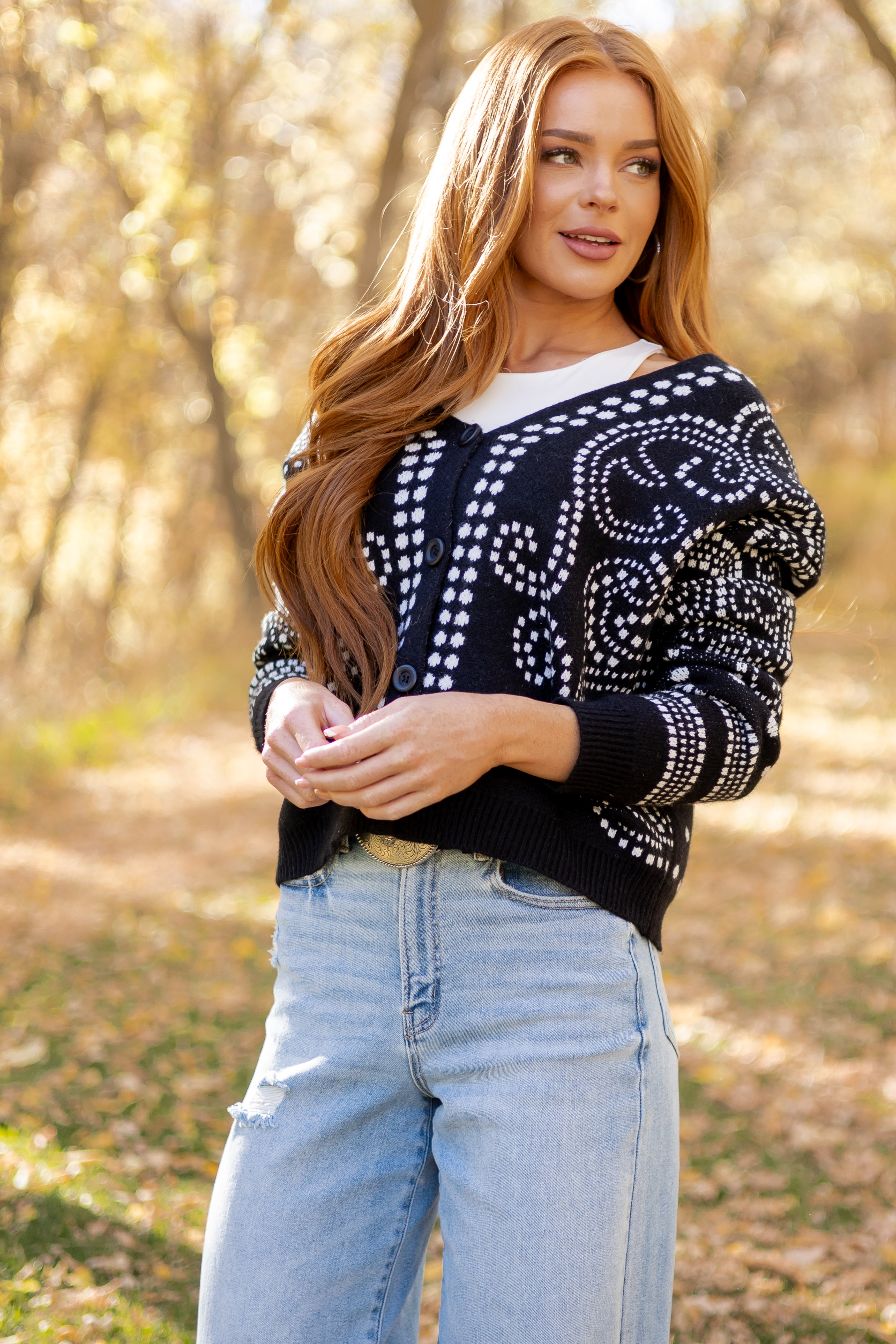 - Elevate your knitwear with this Western paisley bandana printed cardigan—classic button down style with a vibrant twist.