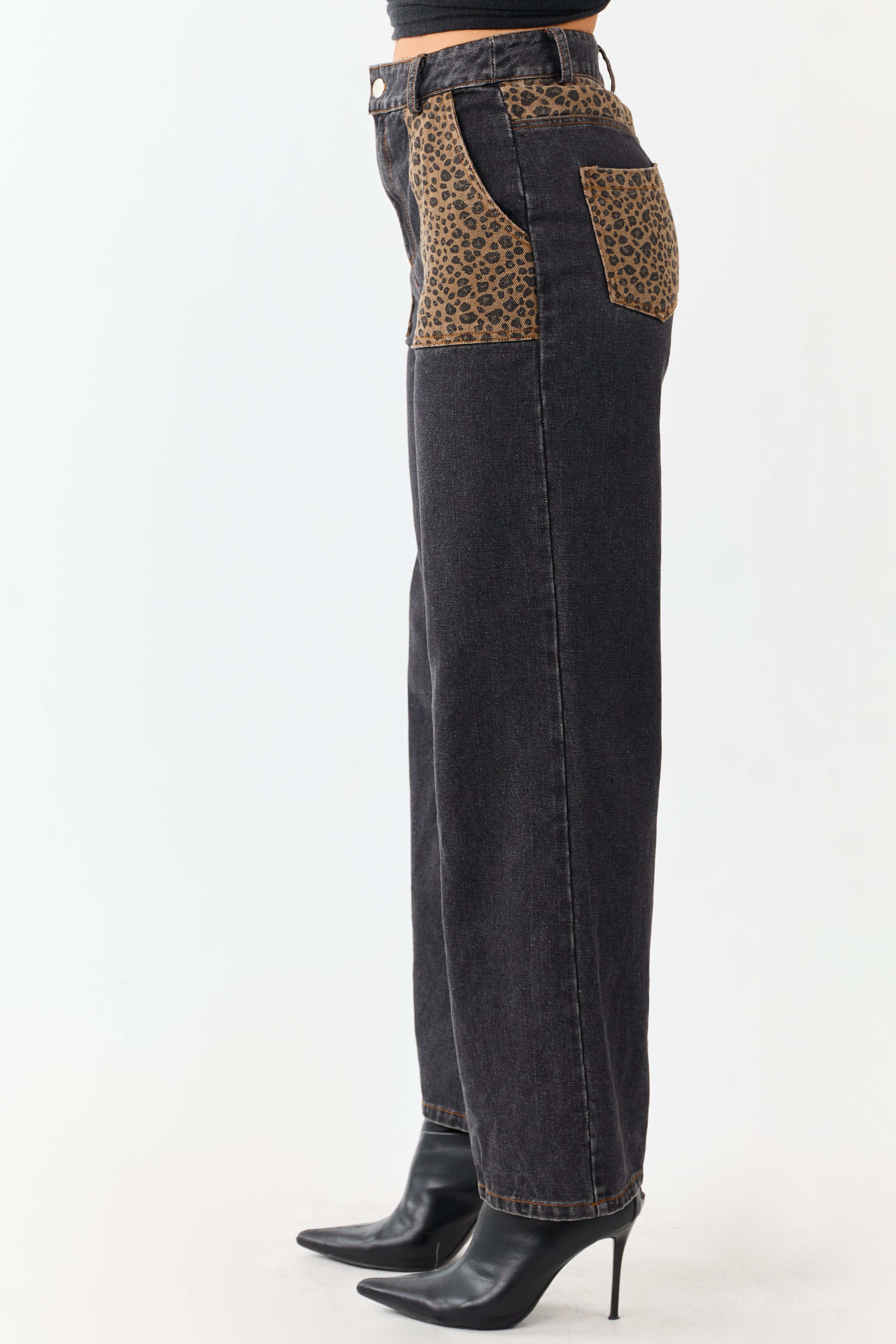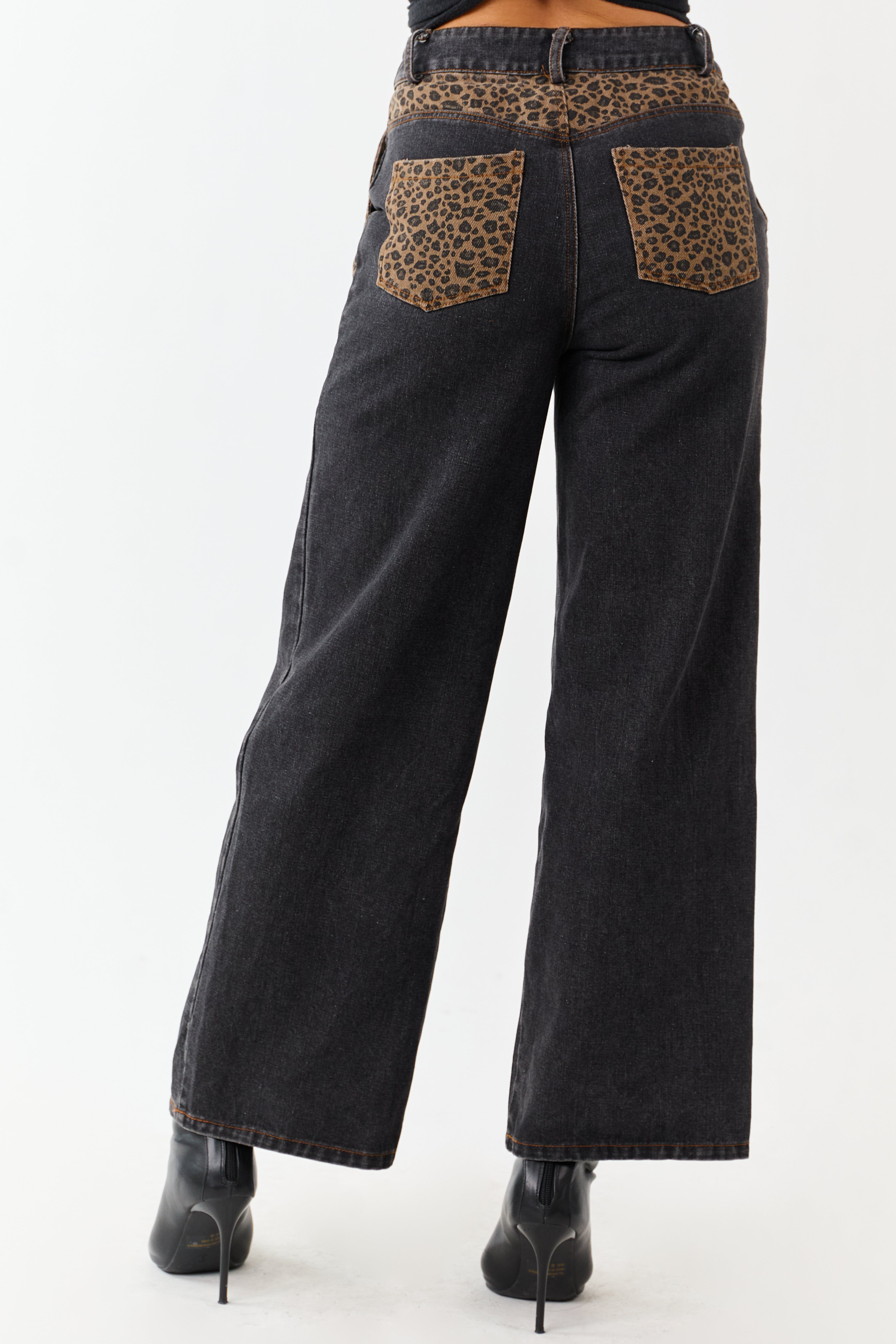 - Step out in fierce style with these high-rise jeans featuring bold leopard print paneling and a flattering wide-leg silhouette.