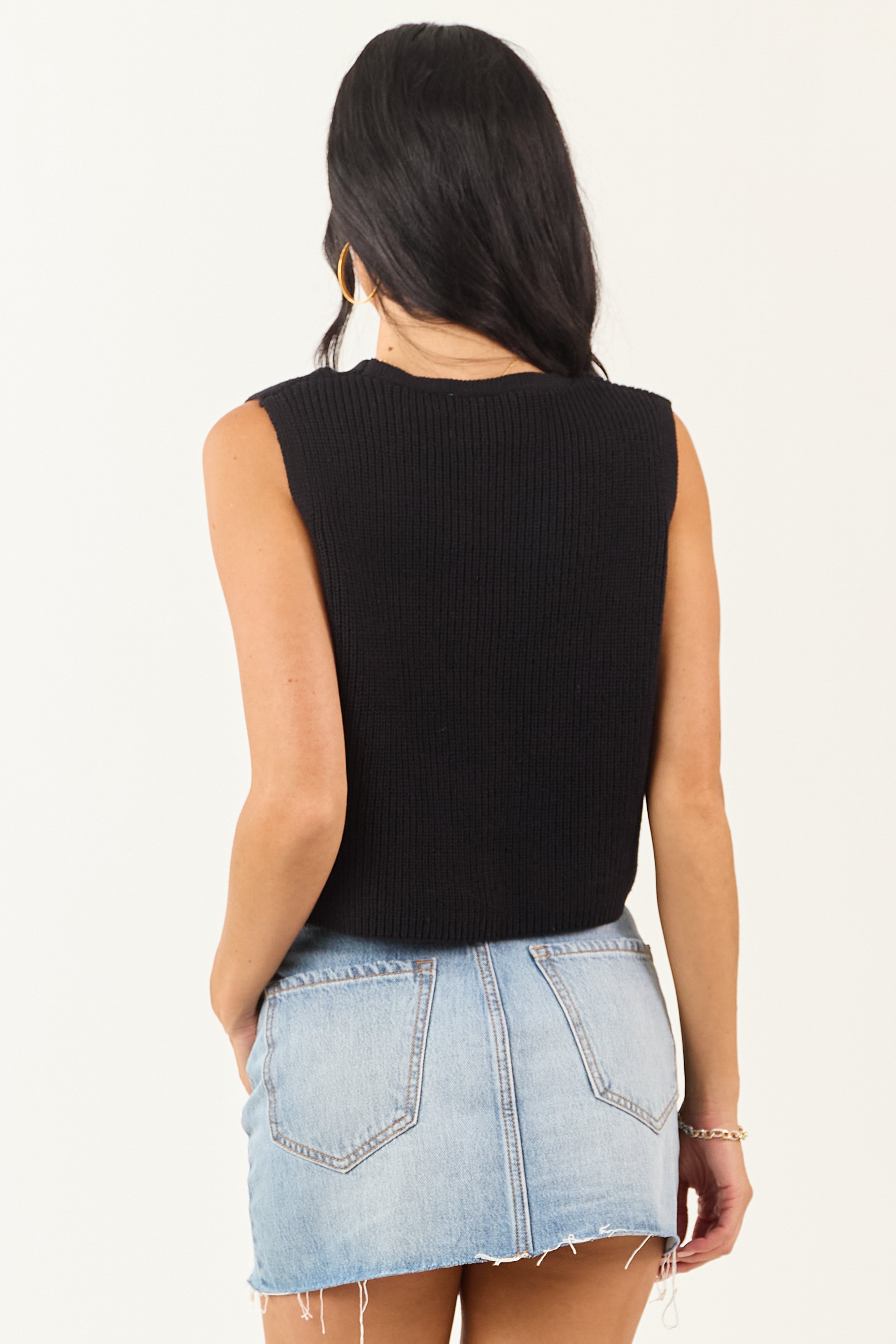 Black Ribbed Knit Cropped Button Up Sweater Vest