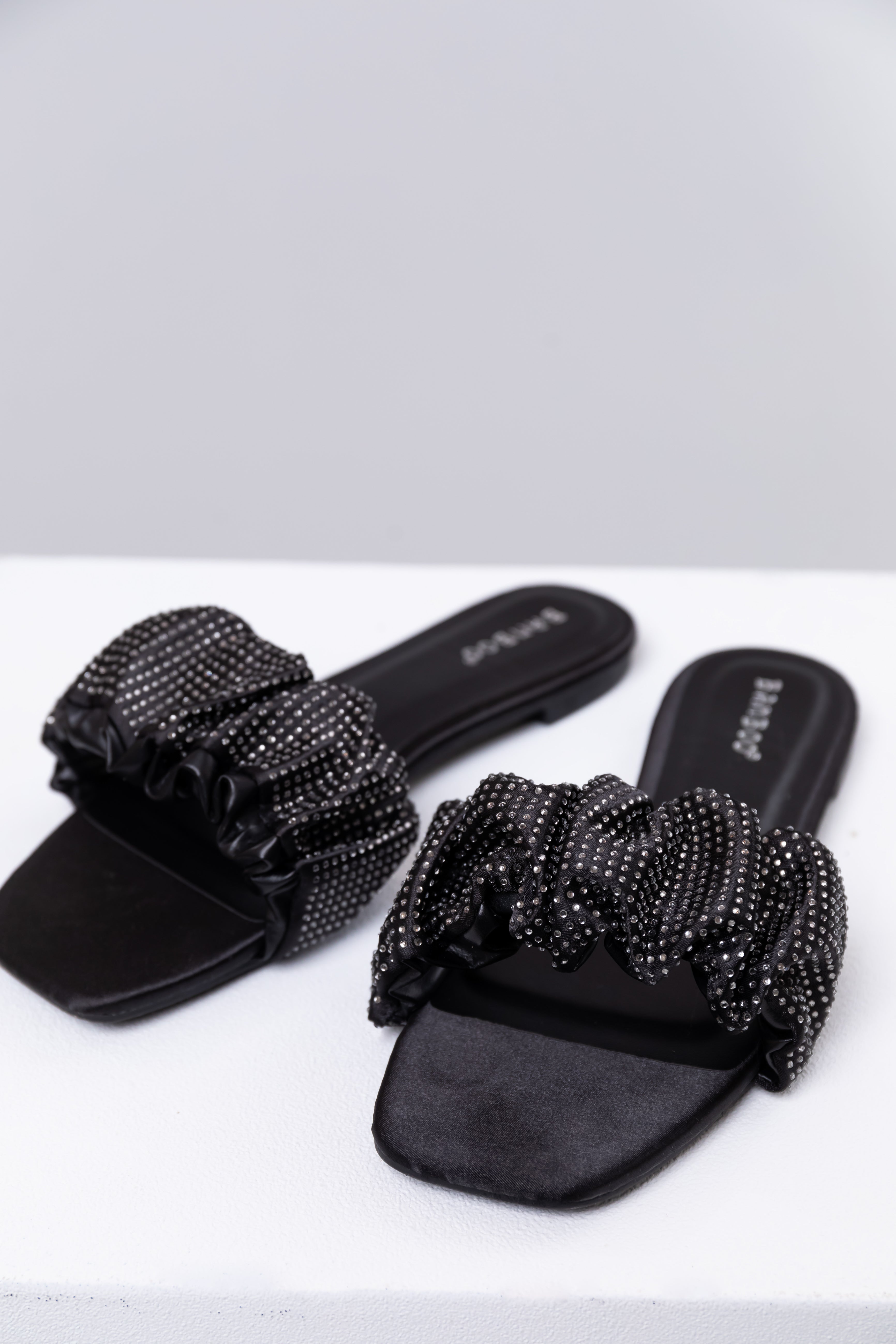 Black Satin Ruched Rhinestone Strap Sandals