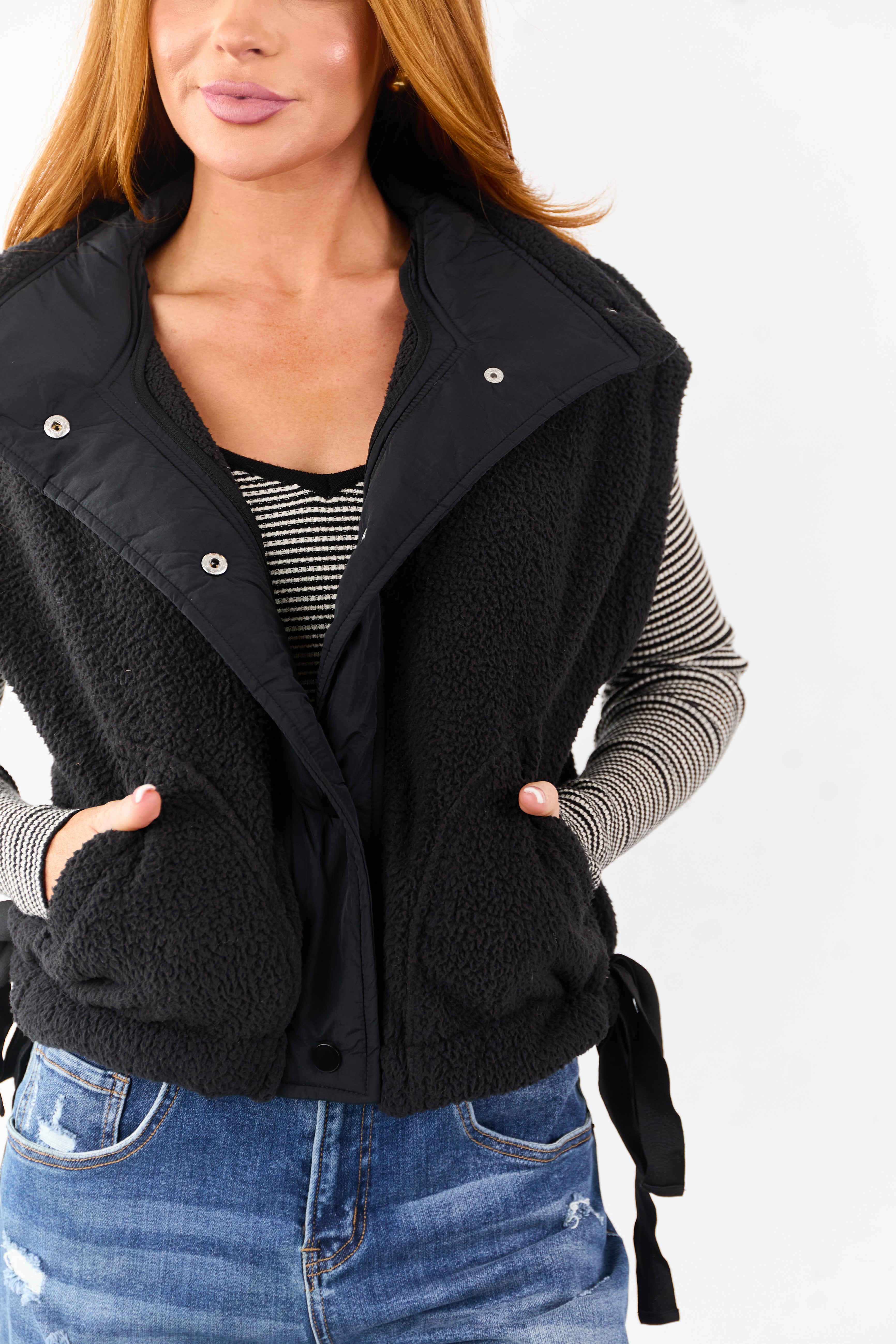 - Soft sherpa fabric and a relaxed oversized fit make this button-down vest a versatile layering piece with a adjustable side-tie hem.