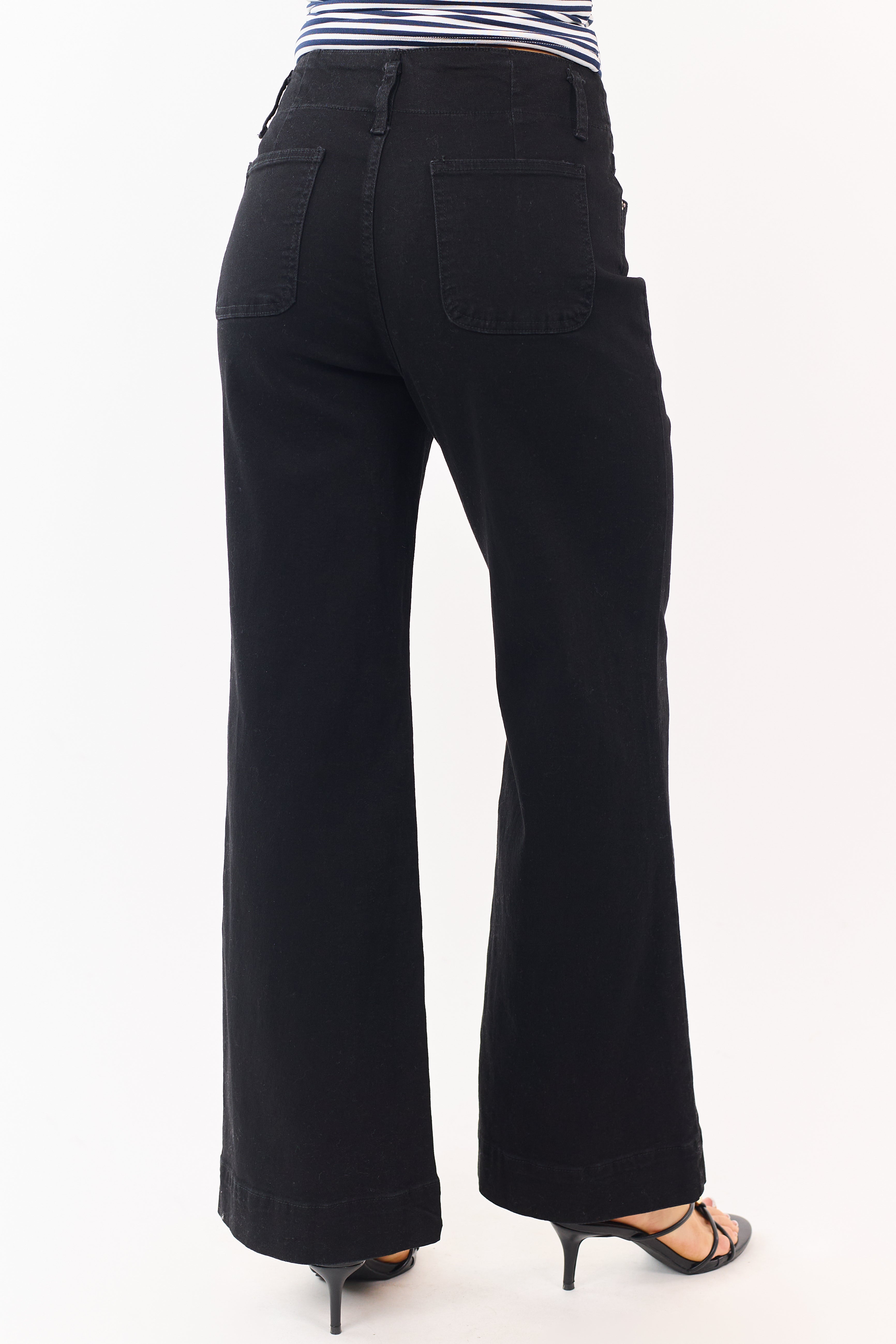 - A wardrobe essential. these black high-rise jeans feature a wide leg cut. stretchy denim. and double-button detail