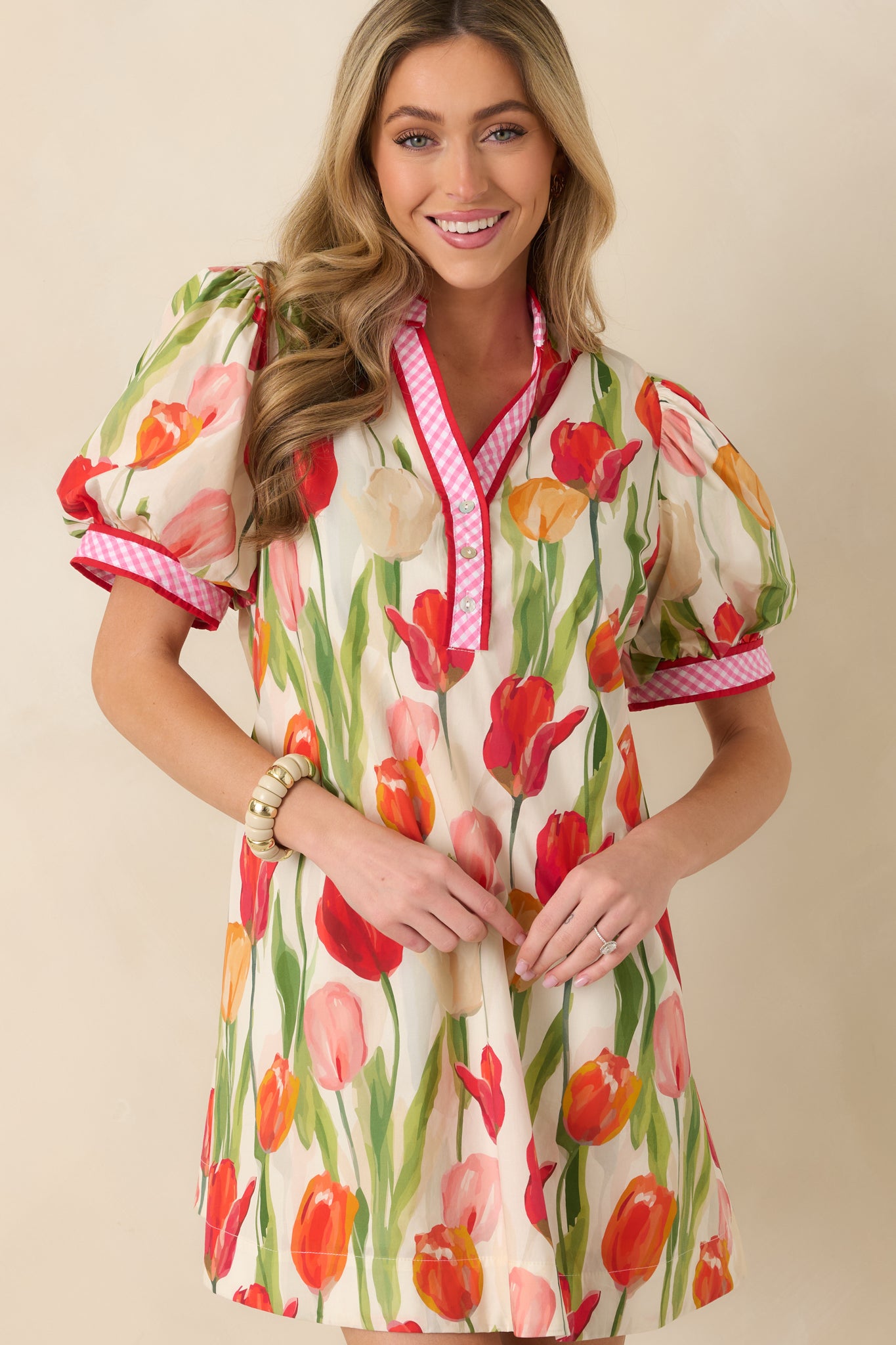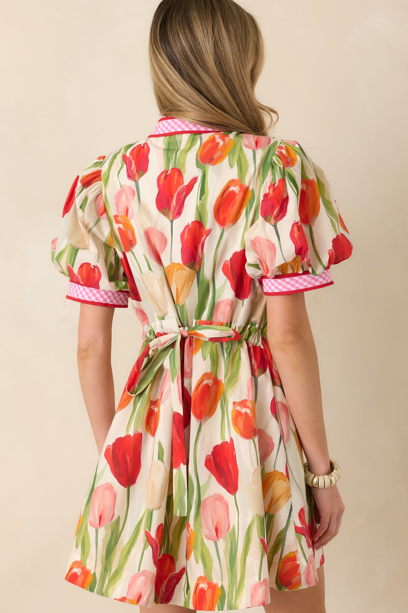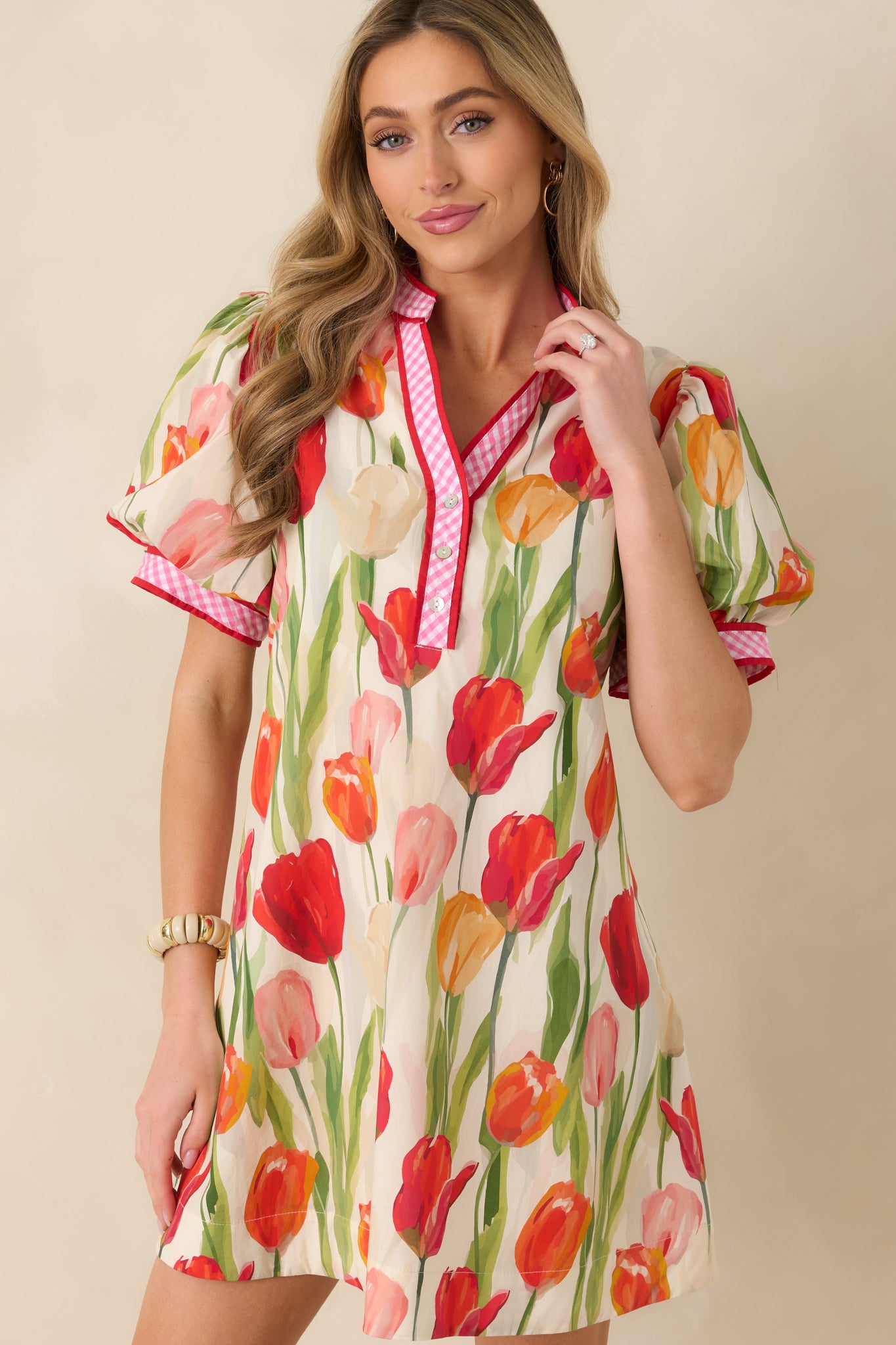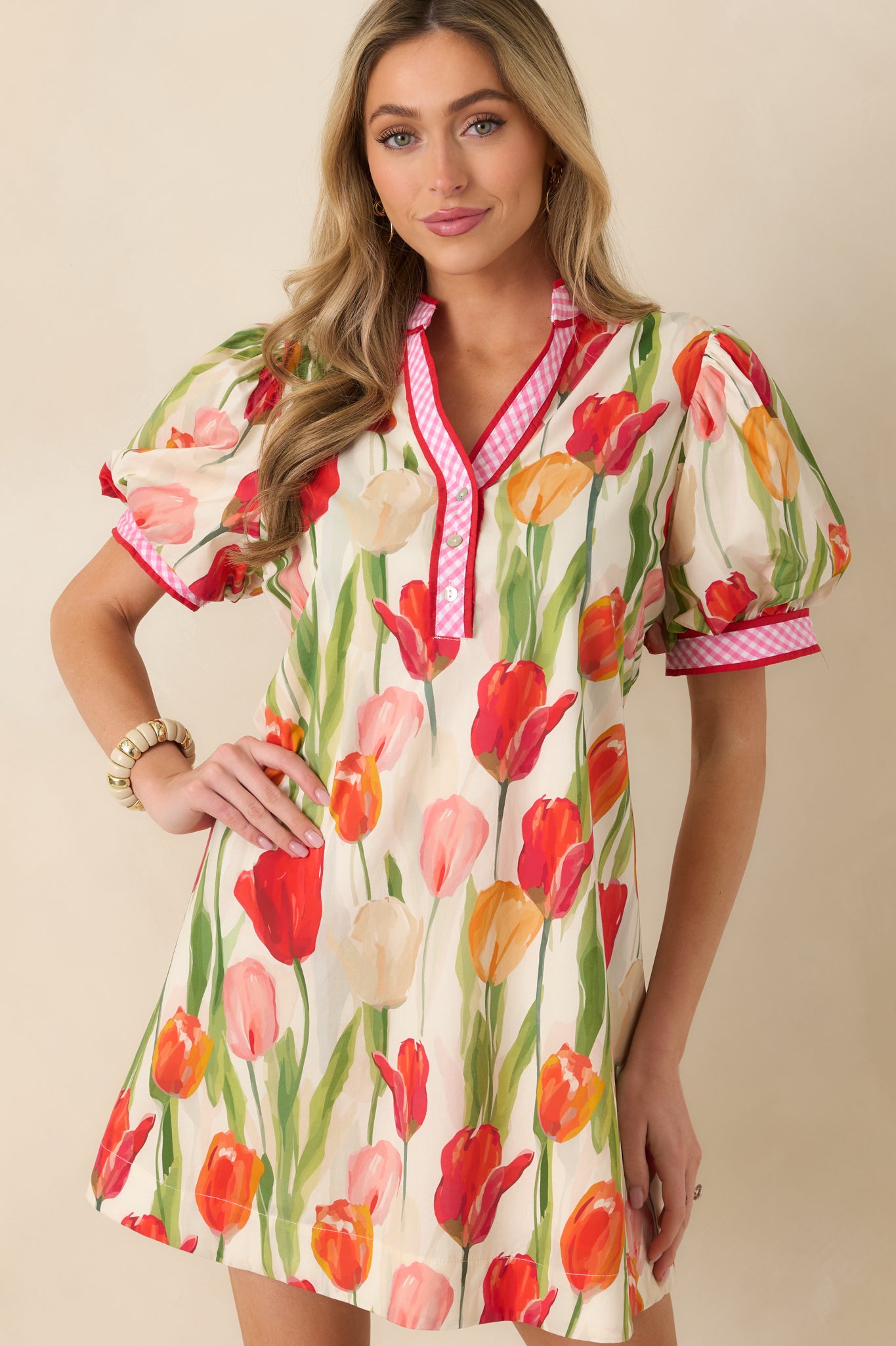 Celebrate vibrant style with this cheerful red tulip print mini dress. crafted from soft. breathable cotton for all-day comfort. The classic short sleeve design offers effortless versatility. perfect for casual outings. weekend brunches. or spring gatherings. Featuring a flattering cut that moves with you. this dress brings a pop of botanical charm to your wardrobe. Whether you're dressing it up with accessories or keeping it relaxed. this timeless piece delivers both confidence and joy with every wear. This Summer Lucy features a beautiful tulip print throughout. a V-neckline with a contrast red and pink gingham trim detail. a puff short sleeve design. two functional side pockets. and a matching fabric tie-back that cinches the waist.