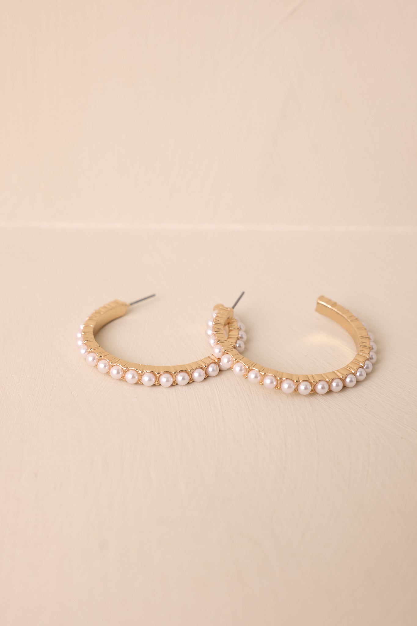 Add a touch of elegance to any outfit with our Bright Moments Ivory Faux Pearl Hoop Earrings. Made with faux pearls and a classic hoop design. these earrings are perfect for both casual and formal occasions. Elevate your style and brighten up your day with these beautiful and versatile earrings. These gold and ivory hoop earrings feature an incomplete hoop design. textured gold hardware. small ivory pearls decorating the outer ring. and secure back postings.