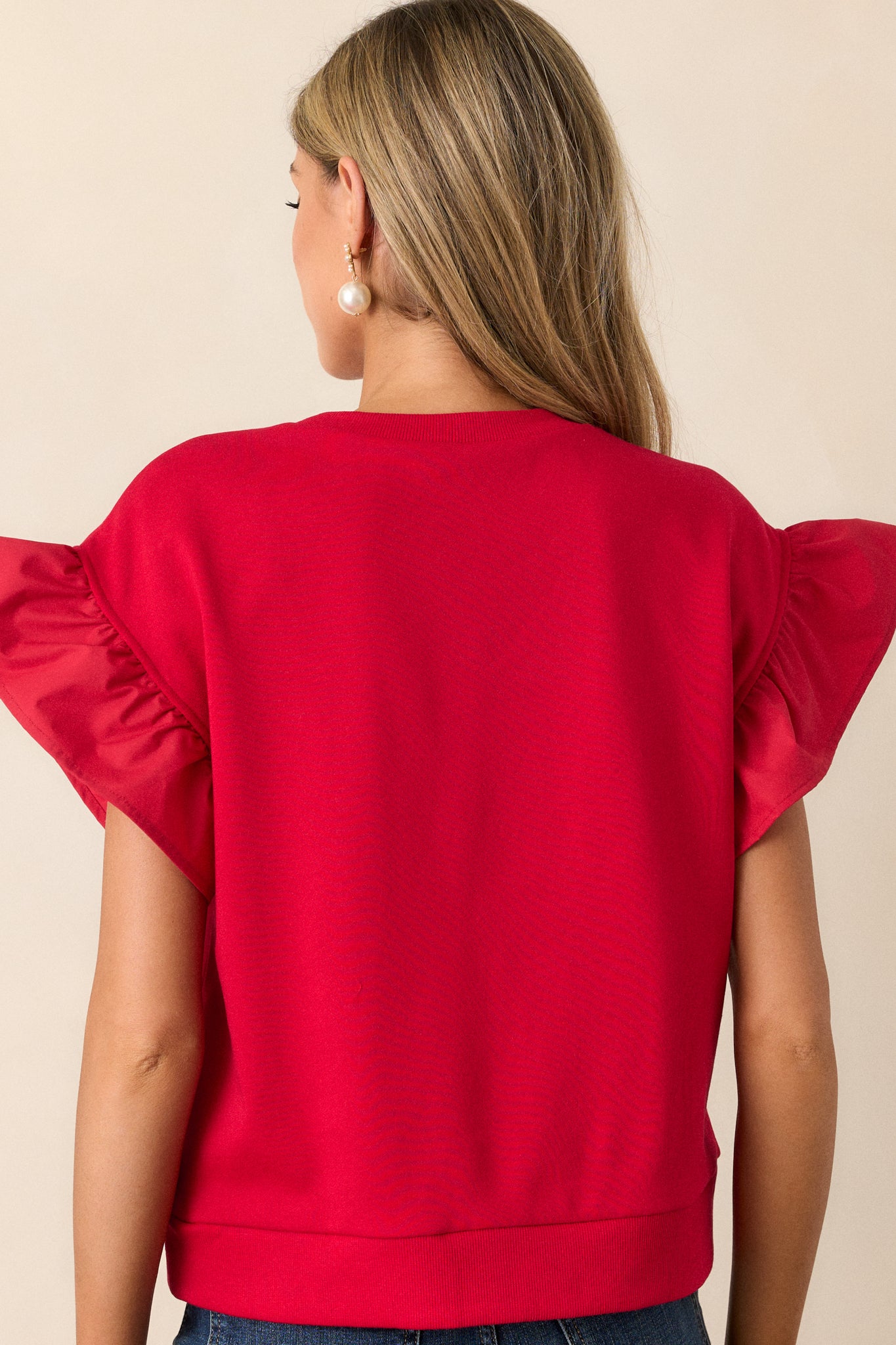 Unleash your unstoppable style with our Can't Stop Me Red Ruffle Sleeve Bow Top! Featuring playful ruffled sleeves and a charming bow. this top will add a touch of flair to any outfit. Don't let anyone get in the way of your fashion statements! This red top features a crew neckline. ruffle short sleeves. a bow accent on the front. and a ribbed bottom hem.