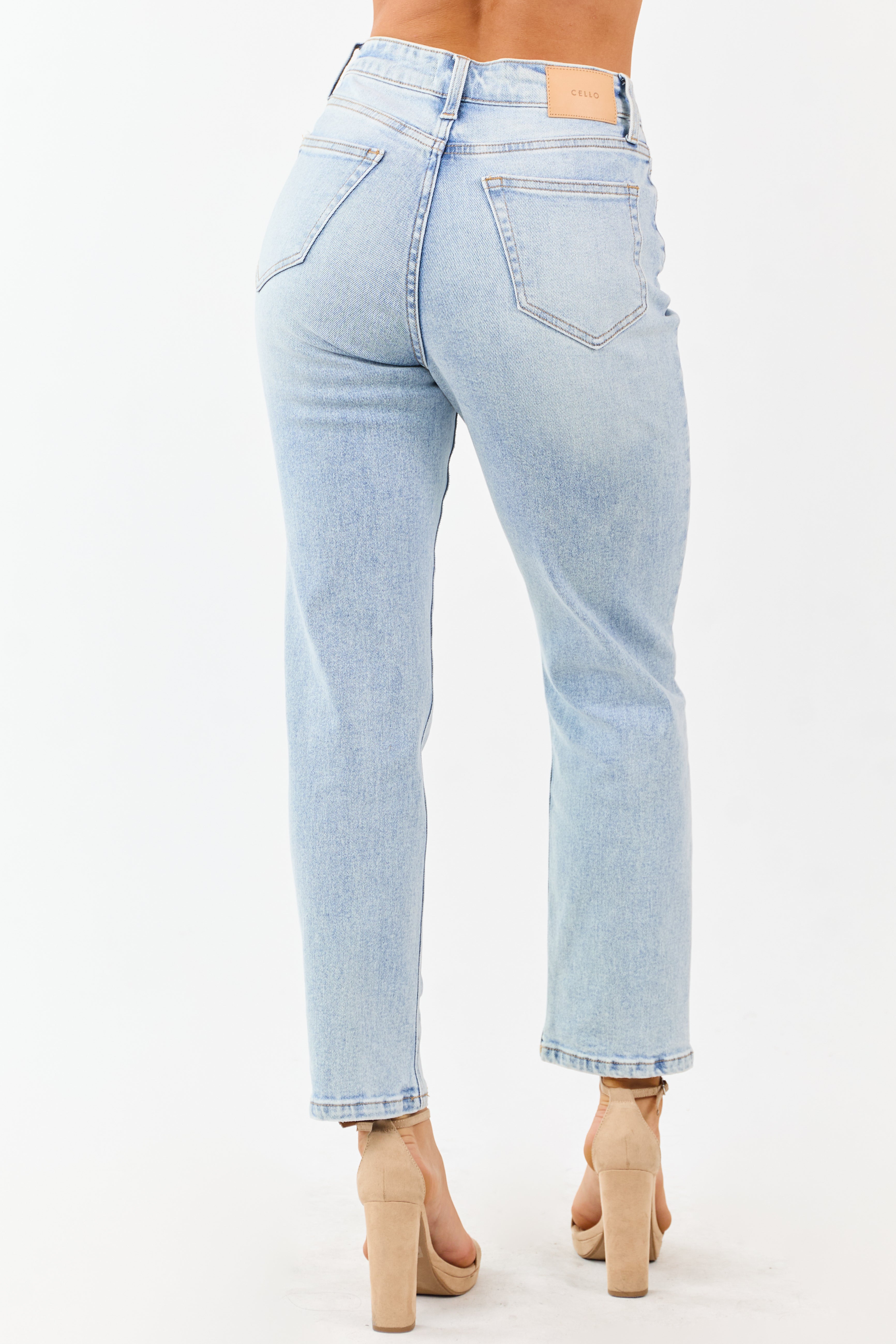 - Add retro vibes to your style with these light wash jeans. featuring a high rise fit. ankle length cut. and stretchy straight leg silhouette.
