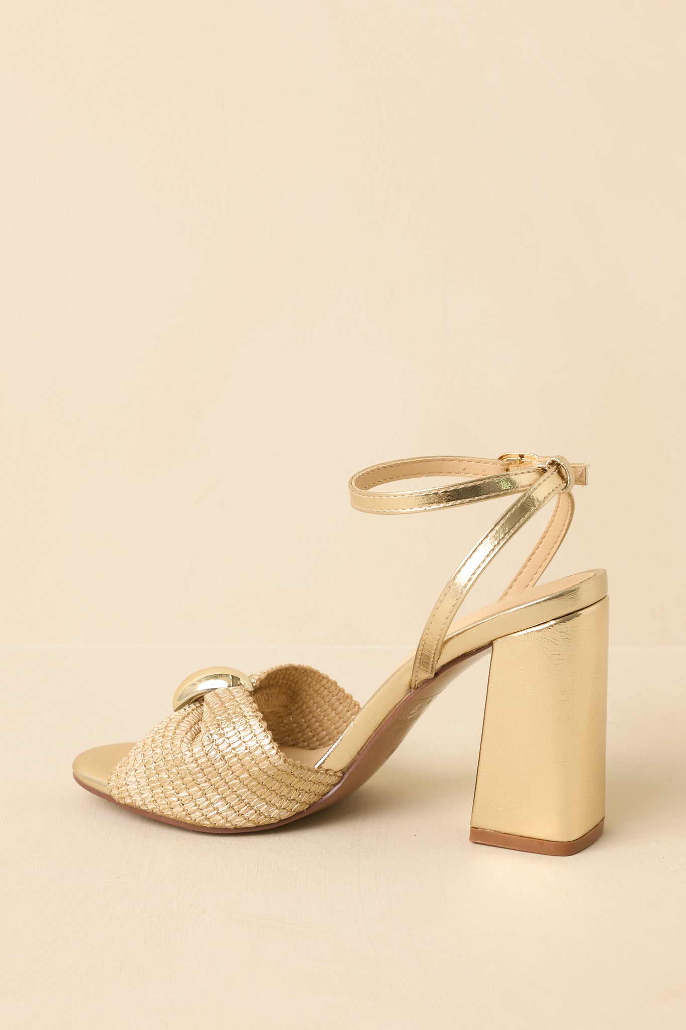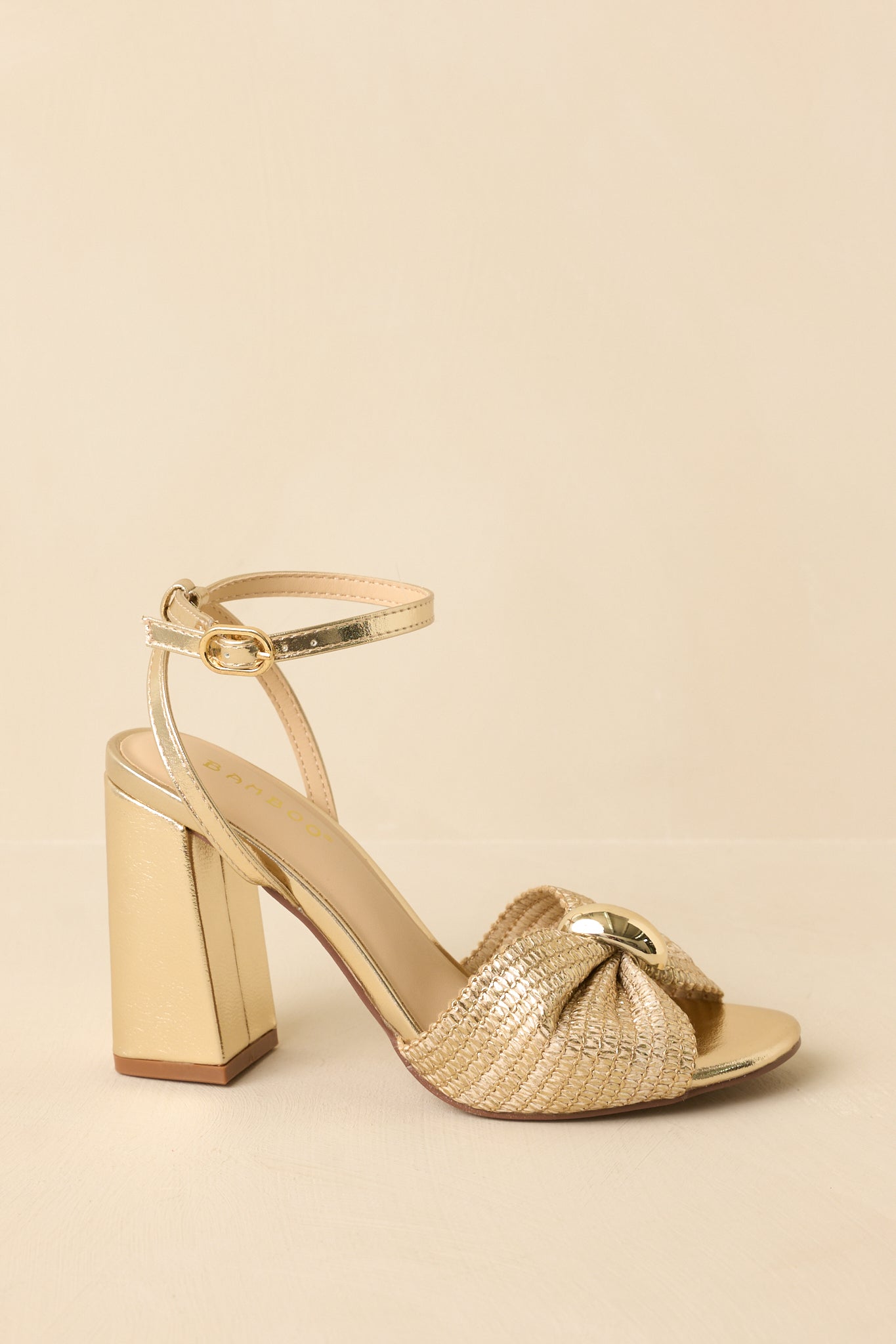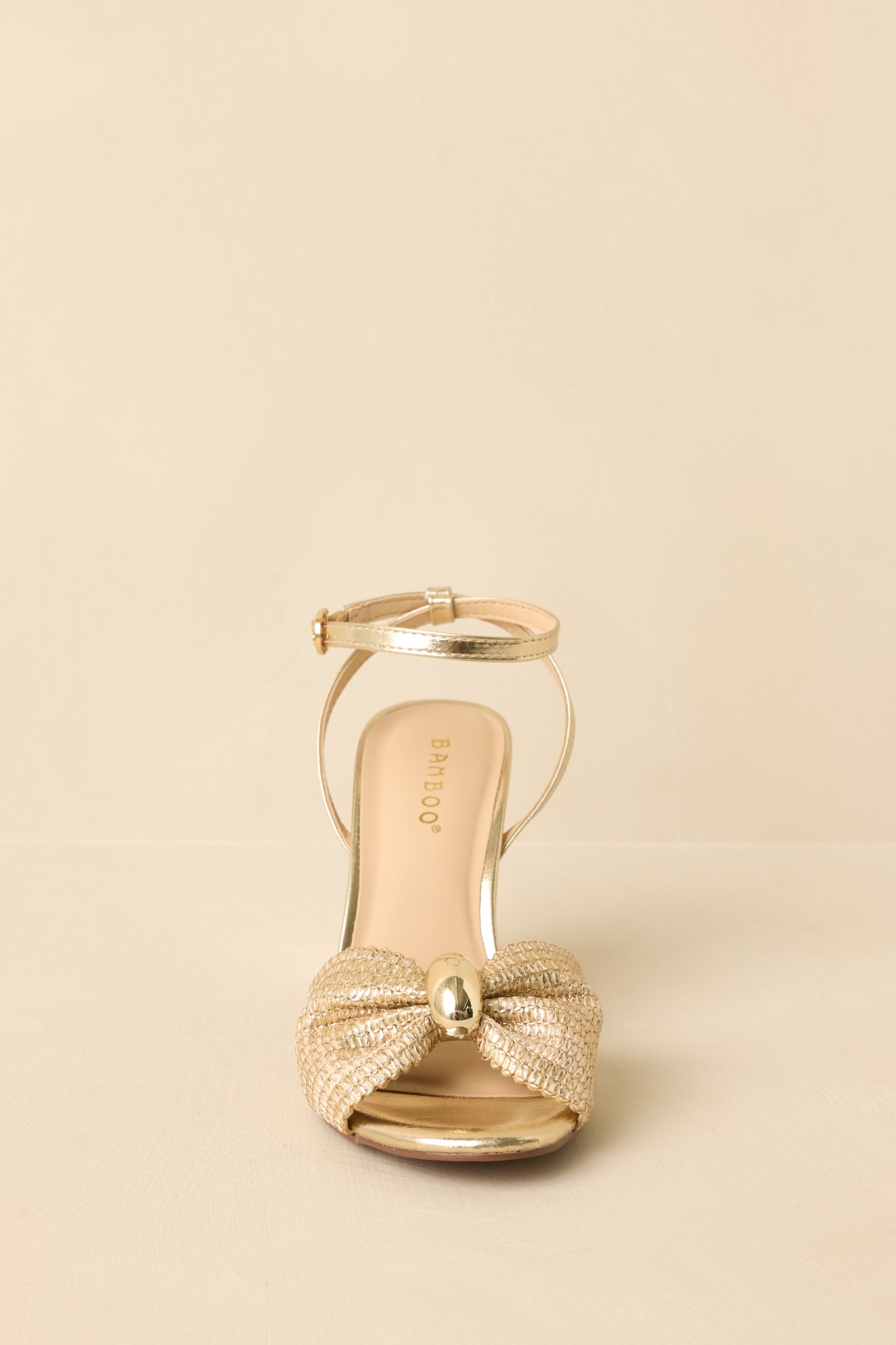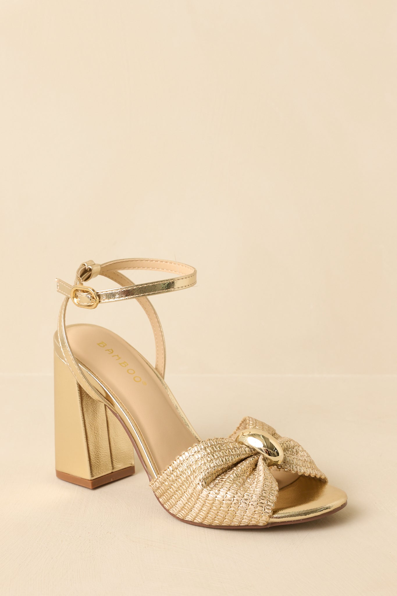 Charmed I'm Sure Gold Woven Bow Block Heel Sandals bring a subtle glow to every step. The woven texture paired with a polished gold finish creates an elevated look that still feels wearable and warm-weather ready. With a hint of shine and a timeless silhouette. these heels are perfect for dressier days. summer events. or anytime your outfit could use a little extra radiance. These gold woven sandals feature an open toe with a textured strap formed into a bow and accented by a gold-tone detail at the center. Designed with an adjustable ankle strap and buckle closure for a secure fit. they're finished with a sturdy metallic block heel for comfortable wear. A smooth sole and luminous gold finish make them an easy choice for both daytime and evening looks.