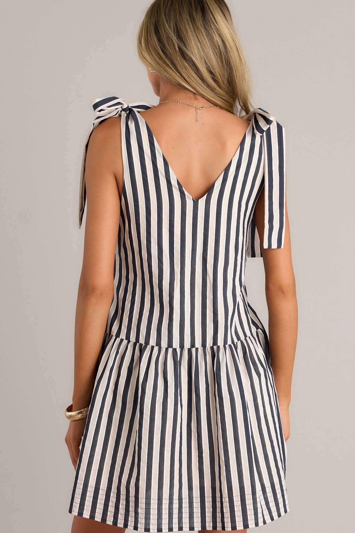Dazzle everyone in this chic black stripe mini dress. With its sleek design and alluring stripes. this dress will make you stand out in any crowd. Perfect for a night out or a special occasion. Don't miss out on this must-have addition to your wardrobe! This black stripe mini dress features a v-neckline. self-tie straps. a single tier. functional hip pockets. and a relaxed fit.