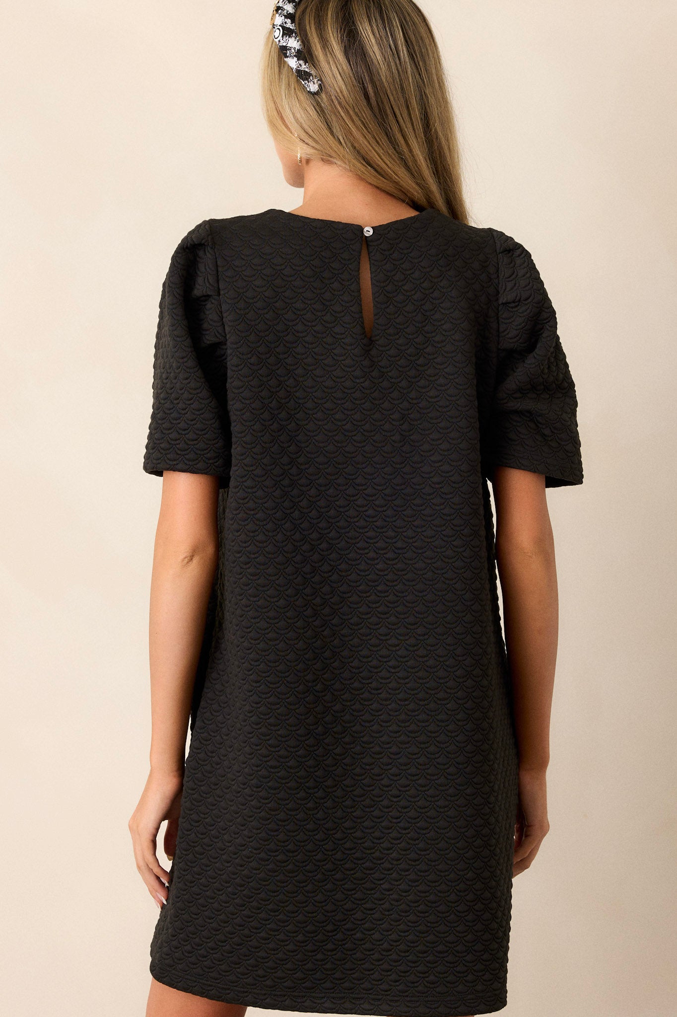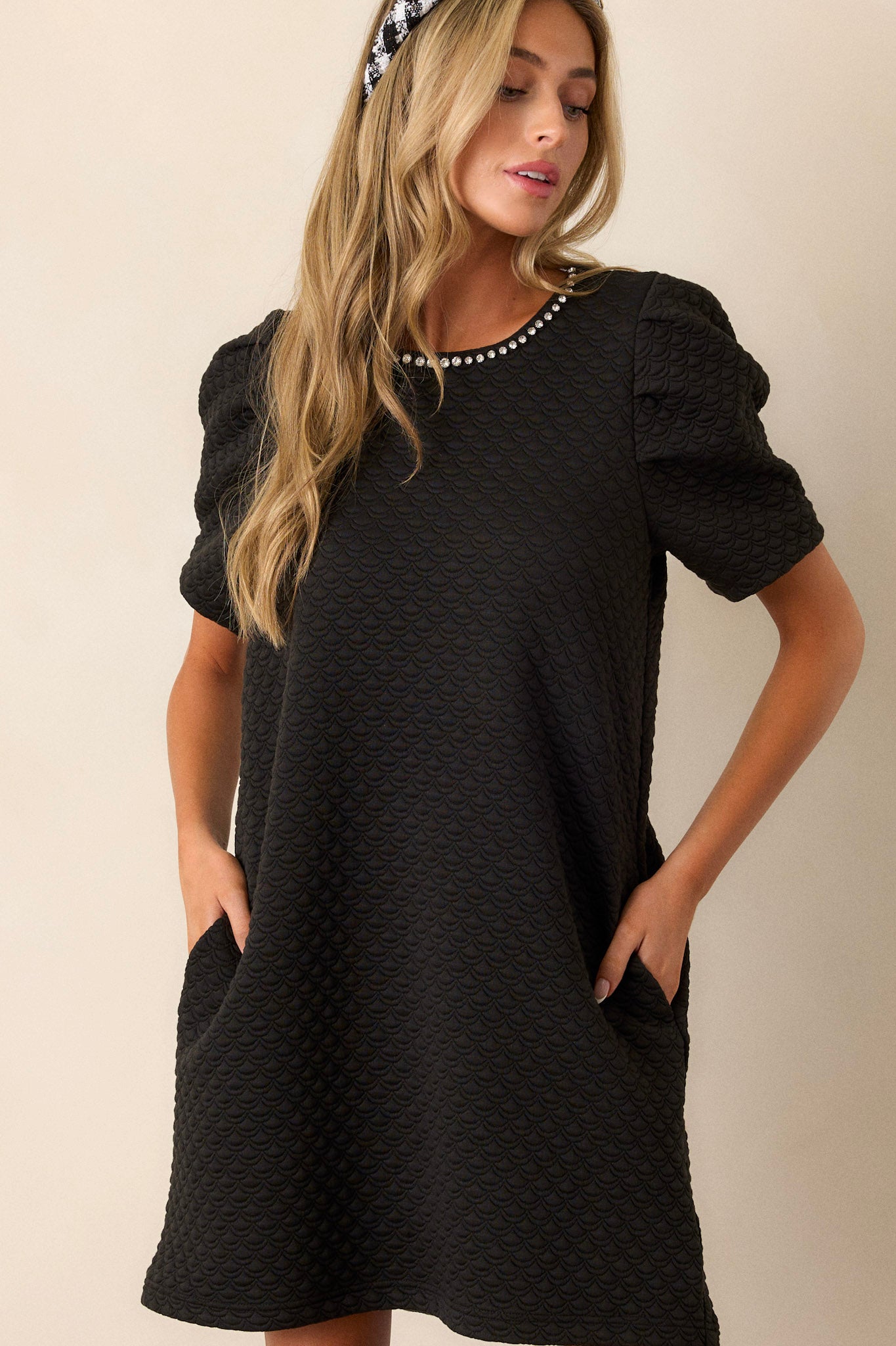 Get ready to elevate your style with our Chic Simplicity Black Short Sleeve Mini Dress. This dress features a sleek and modern design. perfect for dressing up or down. The lightweight fabric allows for comfortable wear all day. while the short sleeves add a touch of sophistication. Step out in style and confidence with this must-have dress! This black dress features a crew neckline. rhinestone embellishments around neckline. puff sleeves. a textured material. and a back cutout with loop closure.