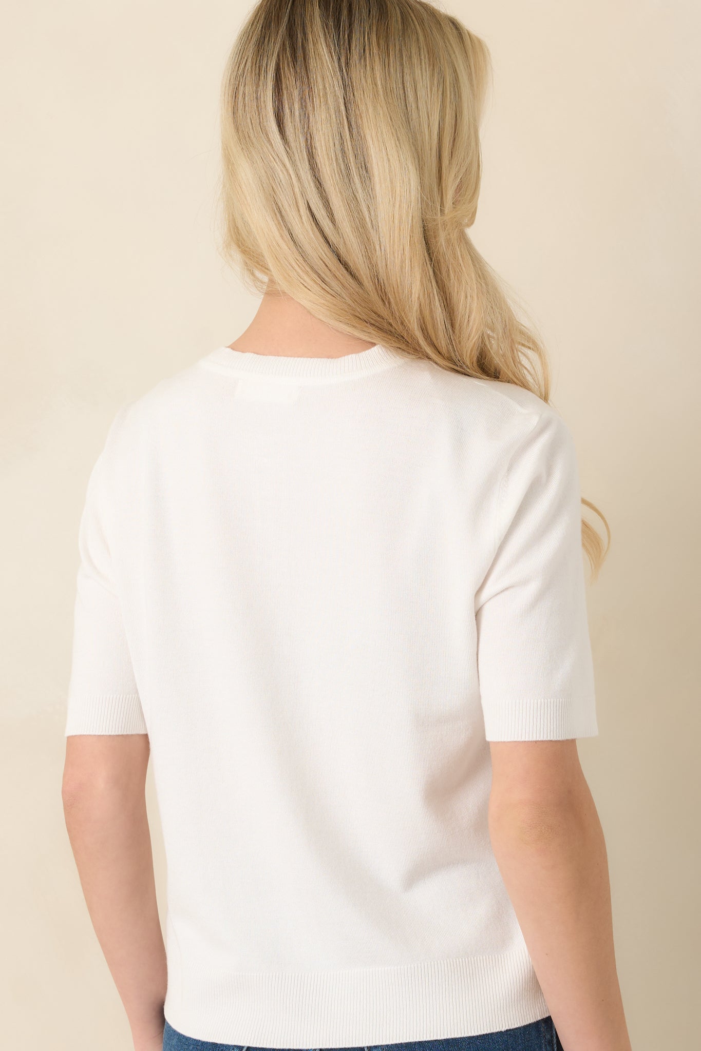 A timeless staple you'll reach for again and again. the Classic Choice Ivory Knit Button Front Short Sleeve Top is the definition of effortless style. Designed with a soft knit fabric. short sleeves. and a clean button-front silhouette. this versatile piece pairs beautifully with everything from tailored trousers to your favorite denim. The polished yet simple design makes it perfect for layering or wearing on its own for an easy. put-together look.