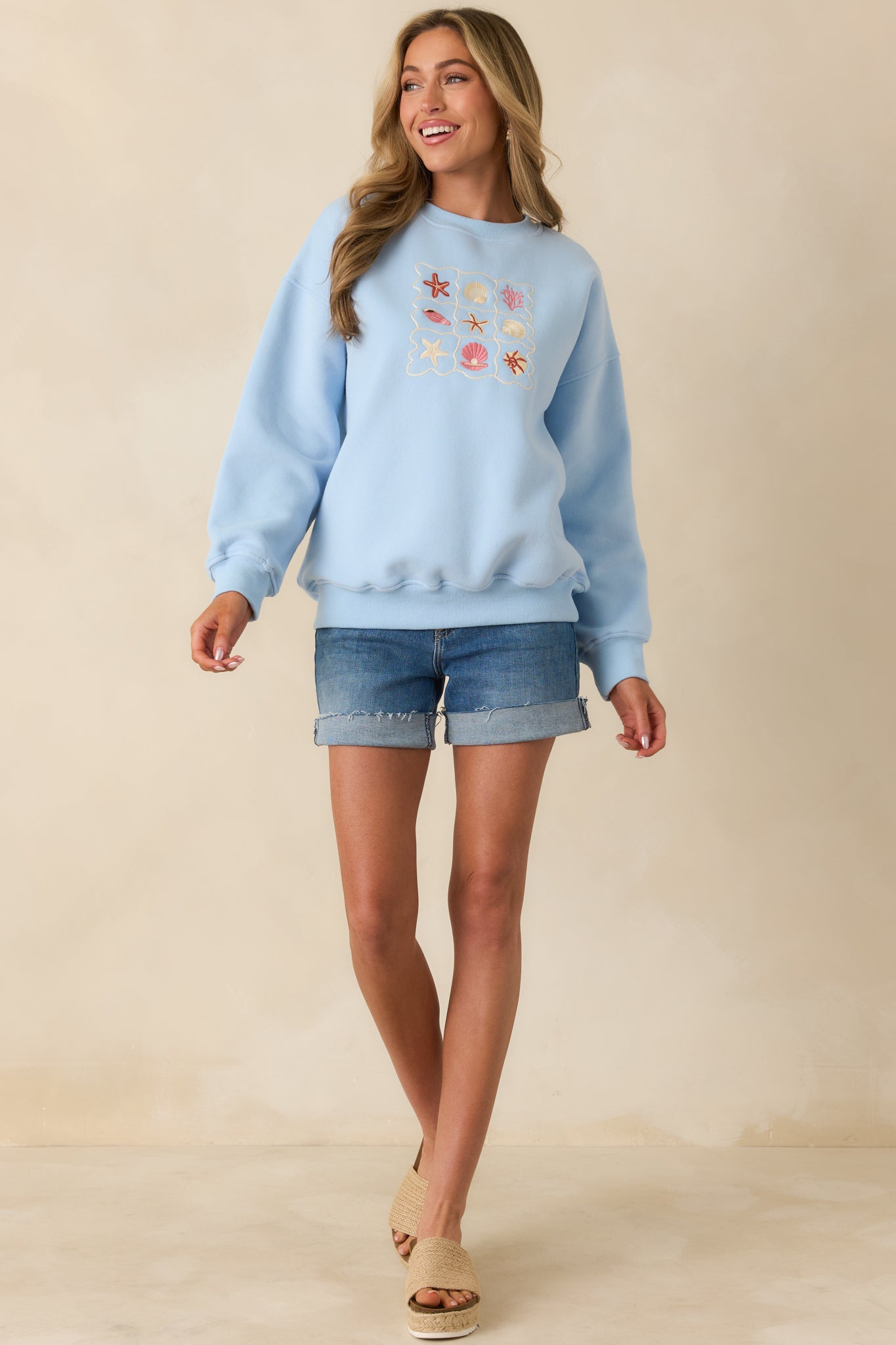 Collected Moments Light Blue Embroidered Crewneck Sweatshirt brings a touch of whimsy to your everyday layers. Set in a soft light blue. the embroidered details feel like little coastal charms—easy. cheerful. and just unexpected enough to make you smile. It's relaxed and comfortable with a personality that shines through. perfect for days when you want something cozy that still feels fun and thoughtfully styled. This light blue sweatshirt features a classic crew neckline. long sleeves. and ribbed trim at the neckline. cuffs. and hem. Designed with a relaxed fit. it's finished with a centered embroidered patch detail for a subtle statement.