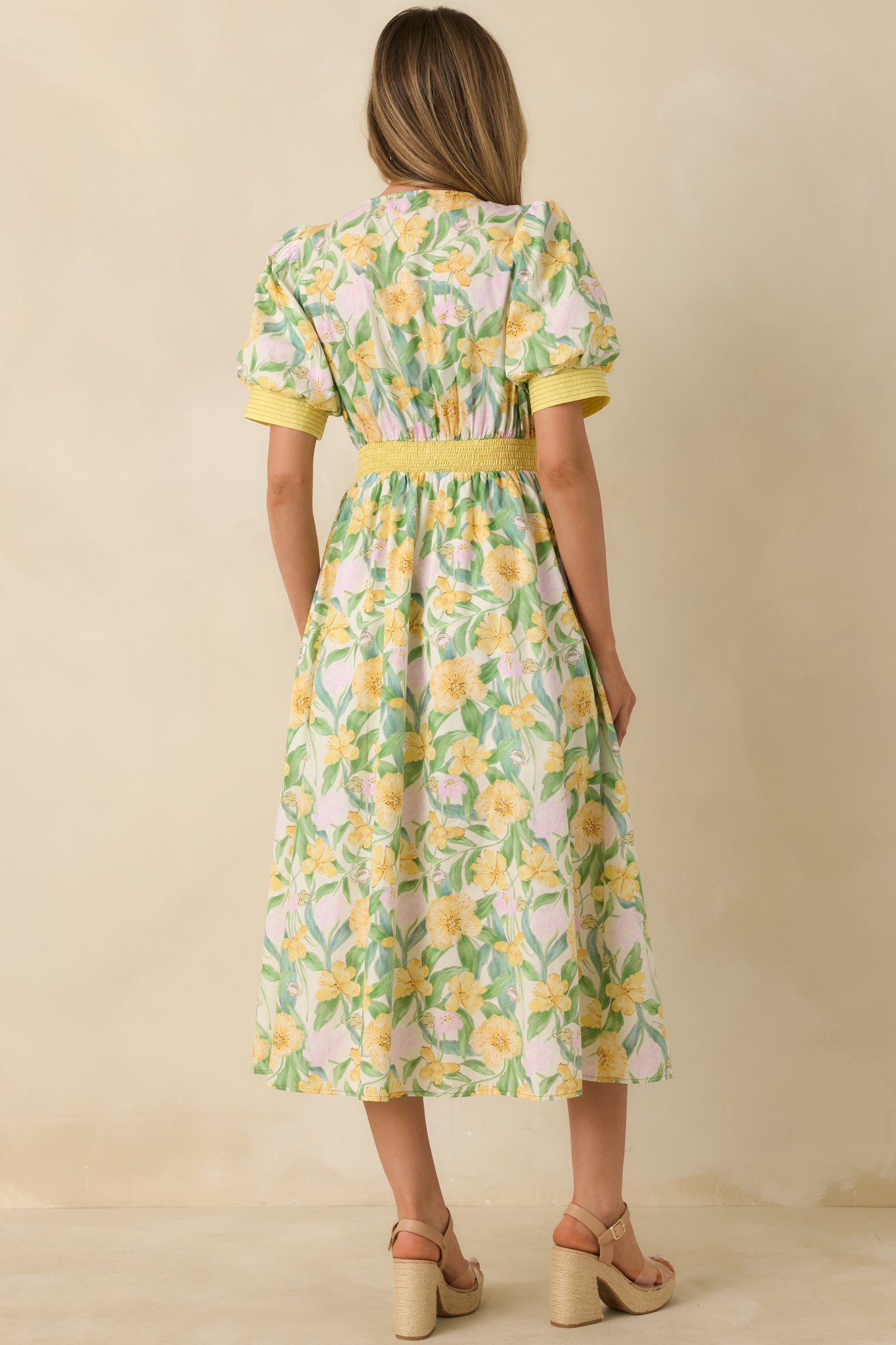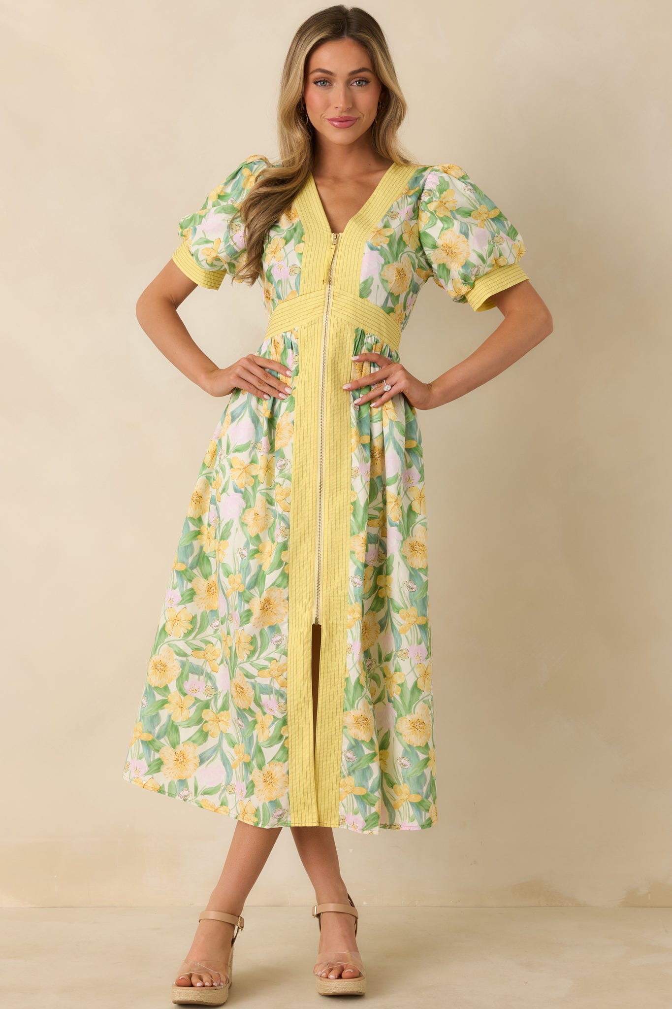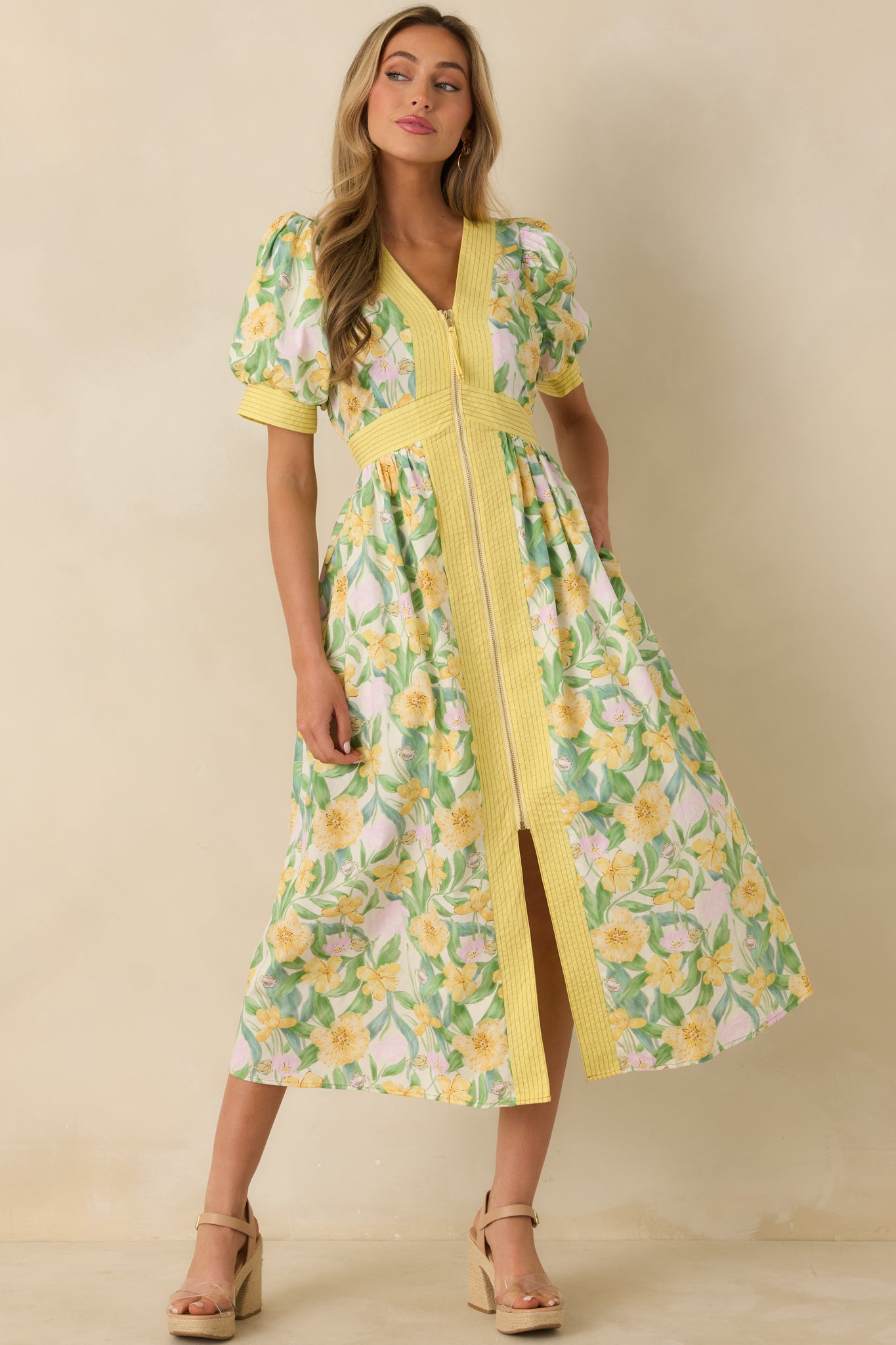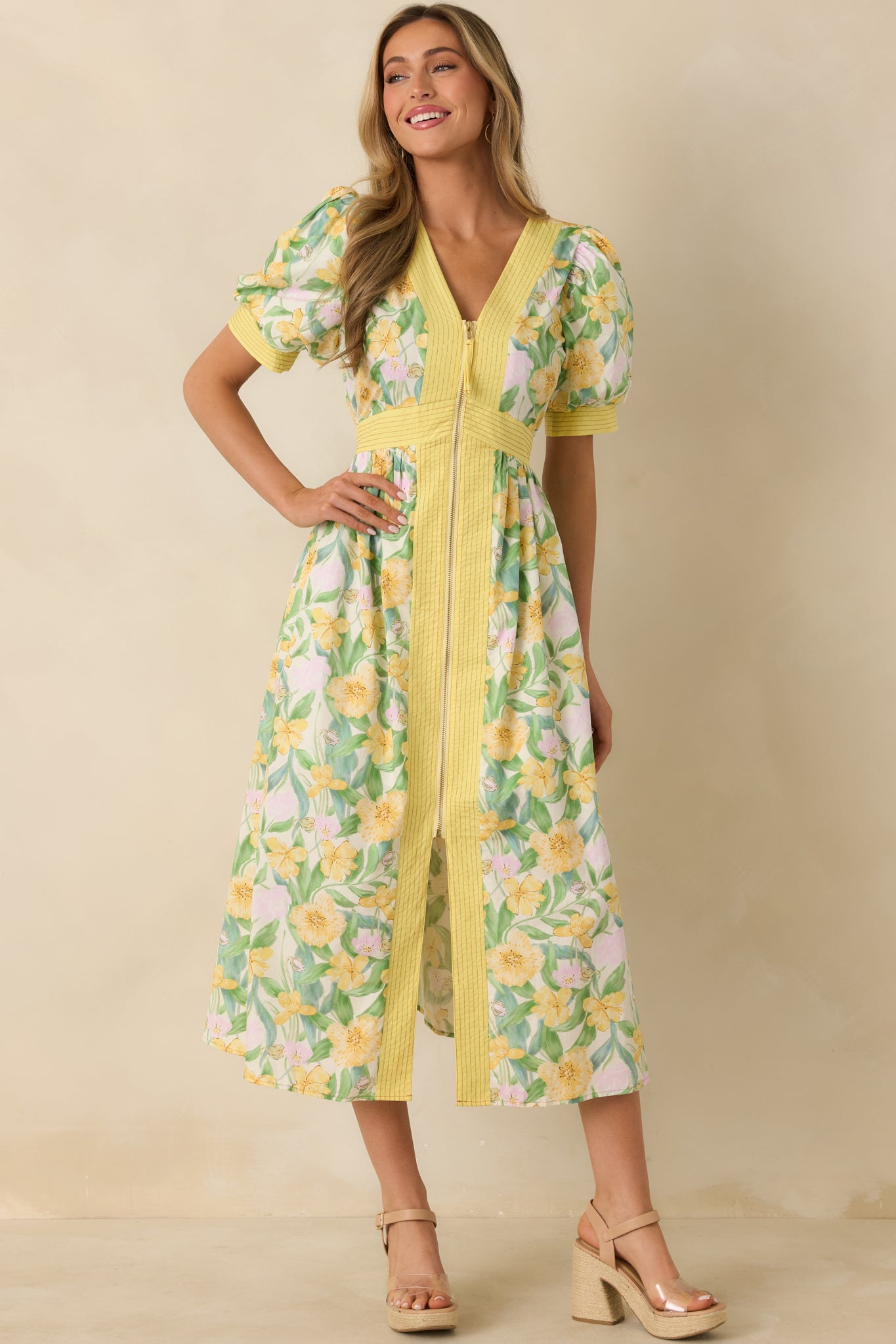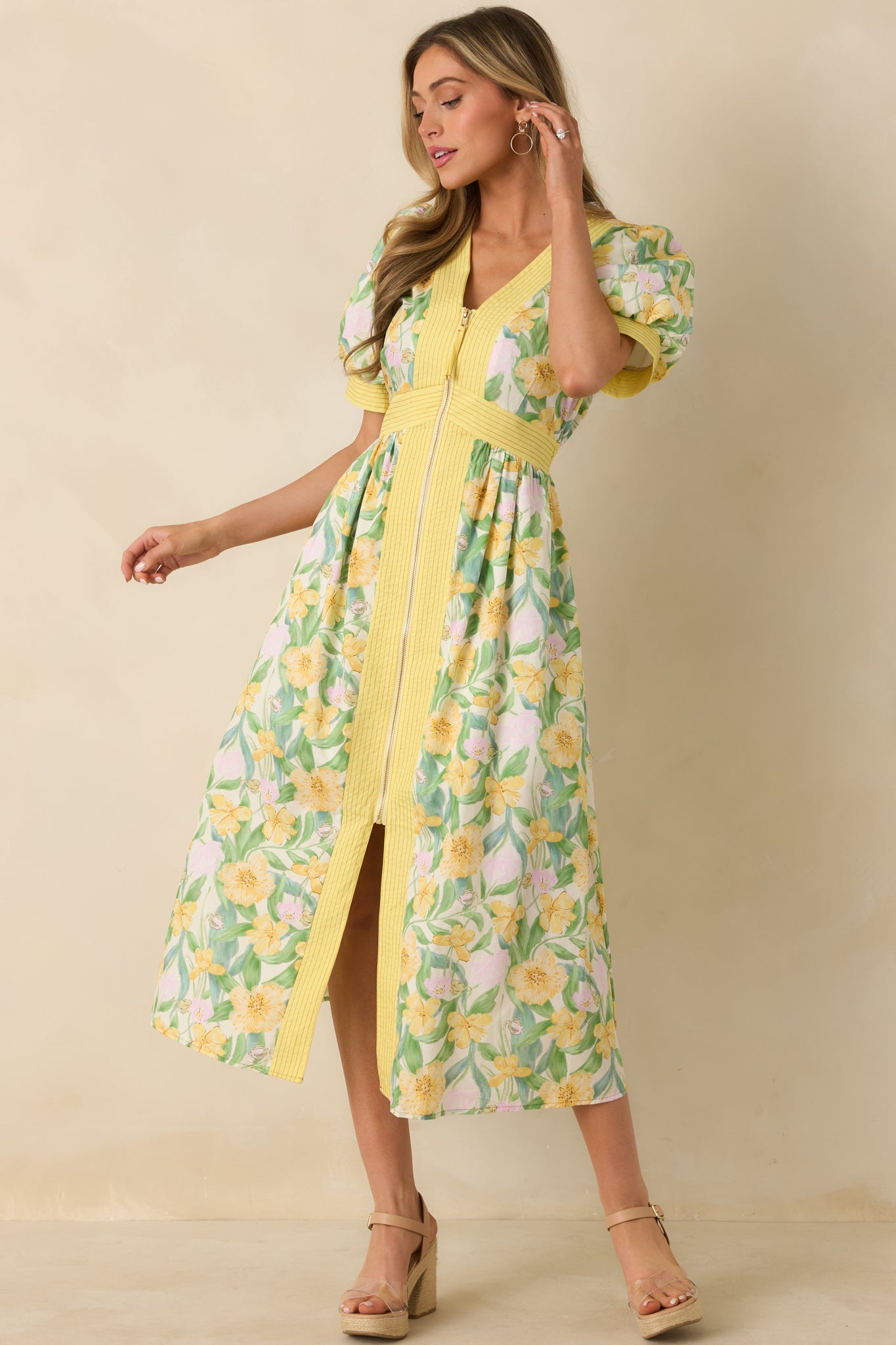 Bright. cheerful. and ready for sunny plans. the Color Me Floral Yellow Multi Floral Print Cotton Zip Front Midi Dress is the kind of piece that instantly lifts your mood. The fresh yellow floral print paired with soft green leaves feels playful yet put-together. while the zip-front detail adds a modern. easy-to-wear touch. Puff sleeves and a defined waist give it a flattering shape without feeling fussy. making this dress perfect for brunch dates. showers. and spring events where you want to feel confident and comfortable. This yellow midi dress is made from a lightweight cotton fabric featuring a yellow and green floral print throughout. It has a V-neckline with a functional zip-front closure that allows for adjustable coverage. The short puff sleeves include cuffed hems. and a fitted waistband creates a defined silhouette before flowing into a midi-length skirt with a subtle front slit for ease of movement.