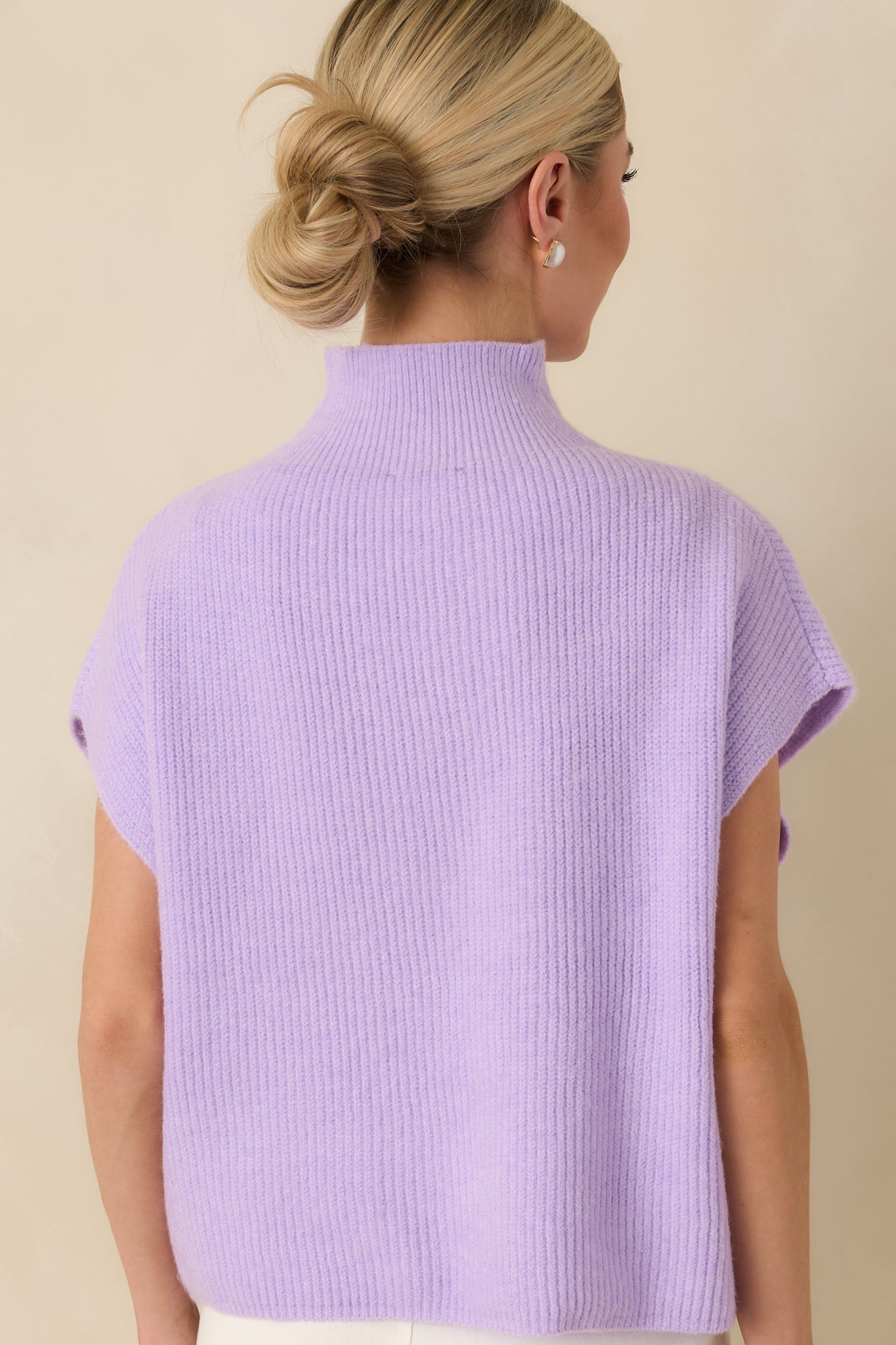 Cool Intentions Lavender Ribbed Knit Mockneck Cap Sleeve Sweater captures that effortless. refined feeling that makes an outfit feel instantly complete. The lavender shade brings a soft. fresh feel to the clean lines. while the subtle texture adds just enough interest. It's polished without being fussy and feels right for both dressed-up days and easy everyday moments. This lavender sweater is made from a ribbed knit fabric and features a mock neckline with cap sleeves. Designed with a relaxed yet refined fit. it includes subtle knit detailing at the chest and a clean hemline for a smooth finish. The sleeveless silhouette makes it ideal for layering or wearing on its own during transitional seasons.