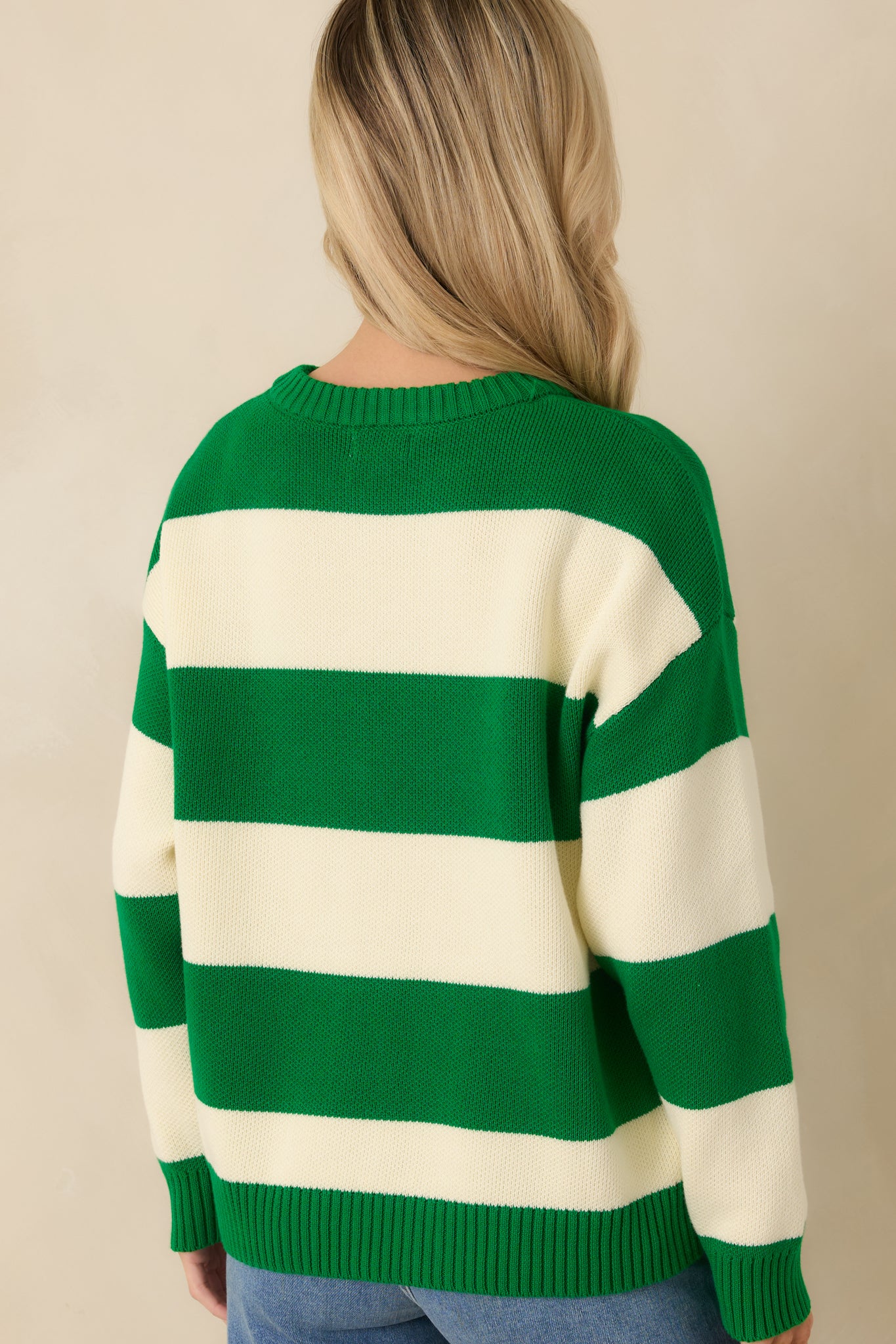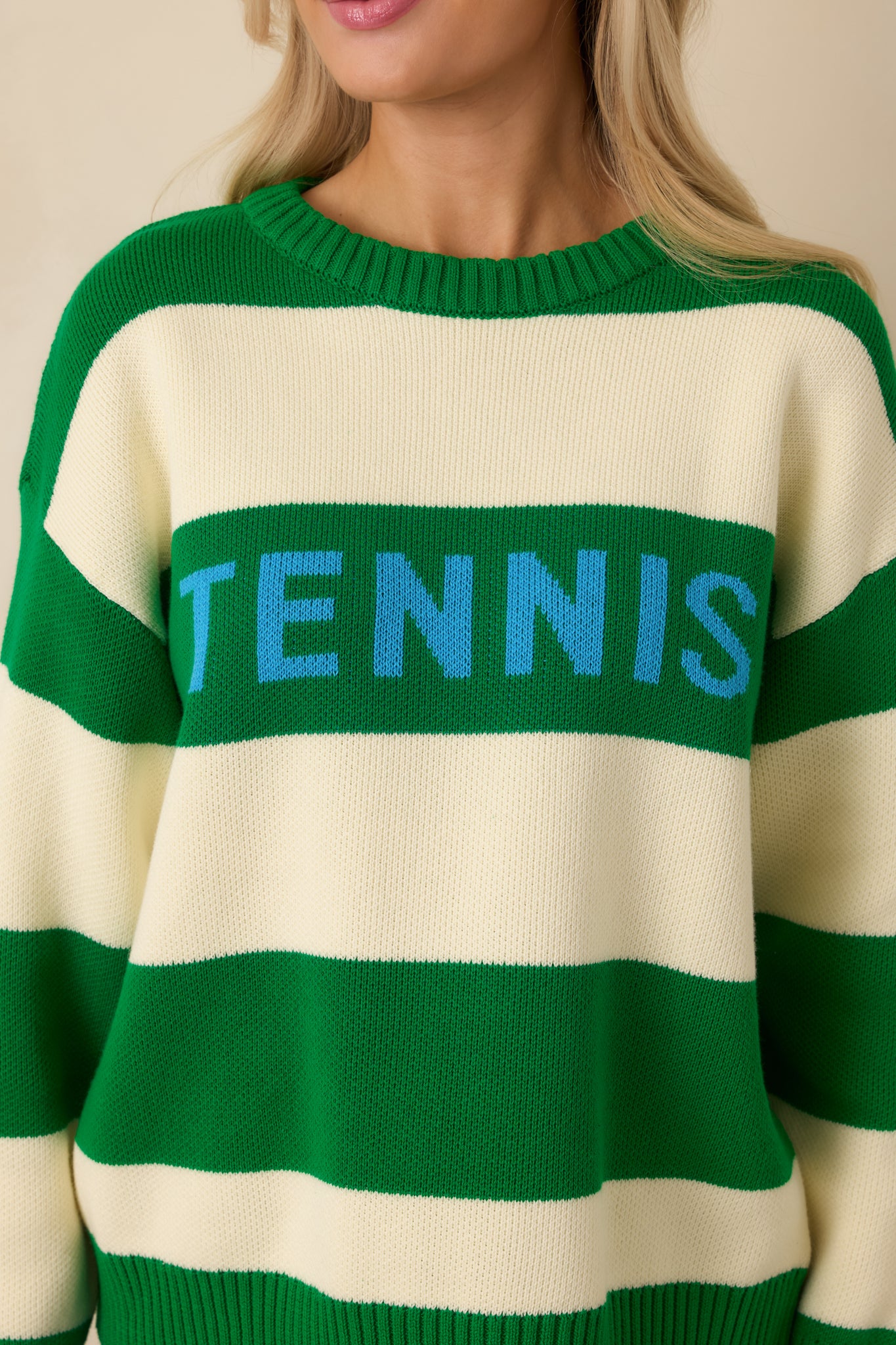 The Courtside Classic Kelly Green Stripe Cotton Knit Tennis Sweater brings a playful nod to classic country club style with a fresh. everyday feel. The bold green and cream stripes paired with the “TENNIS” lettering give it that sporty. preppy charm that's easy to style but still stands out. It's the kind of knit you throw on with denim for a casual day or dress up with tailored bottoms when you want your look to feel polished. fun. and effortlessly cool. This bold green and ivory stripe knit sweater features contrast “TENNIS” lettering across the front. Designed with a ribbed crew neckline. cuffs. and hem. it offers a relaxed fit with comfortable stretch throughout. Finished in a midweight knit fabric that's easy to layer and wear season to season.