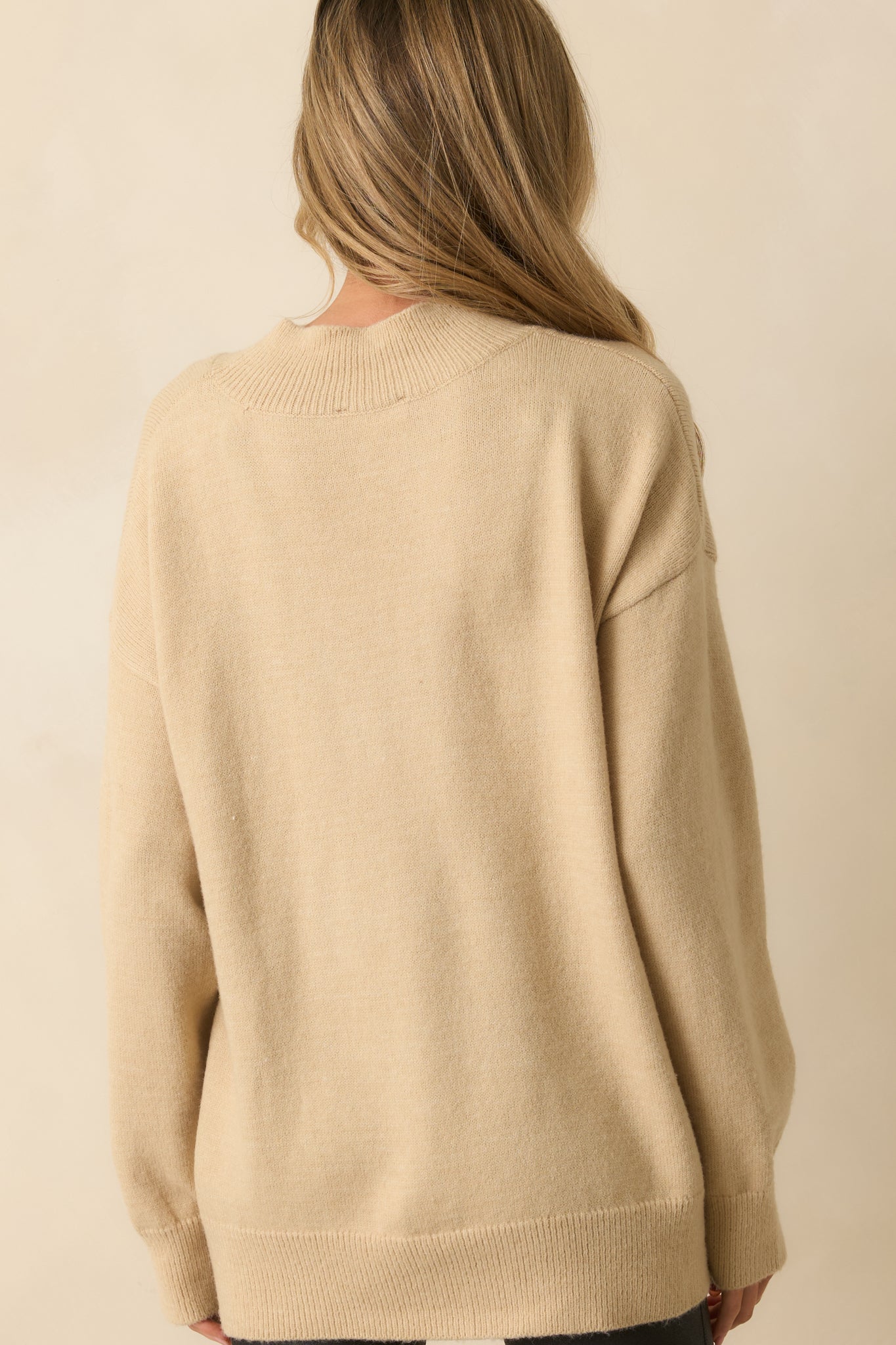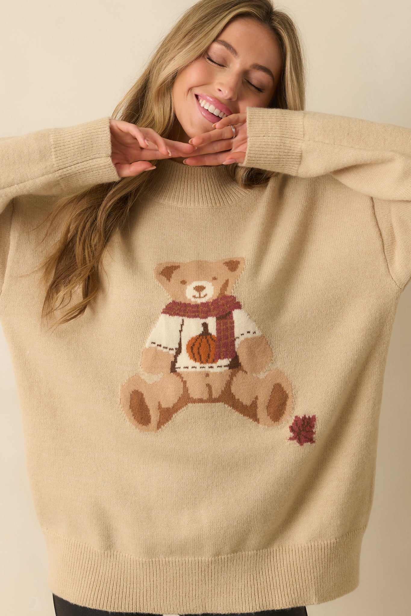 The Cozy As Can Be Beige Teddy Bear Knit Long Sleeve Oversized Sweater lives up to its name. a soft. relaxed layer made for laid-back days and cozy nights. This beige sweater features an intarsia knit teddy bear graphic at the front wearing a scarf and pumpkin sweater. a classic crew neckline. long sleeves. ribbed hems. and an oversized fit.
