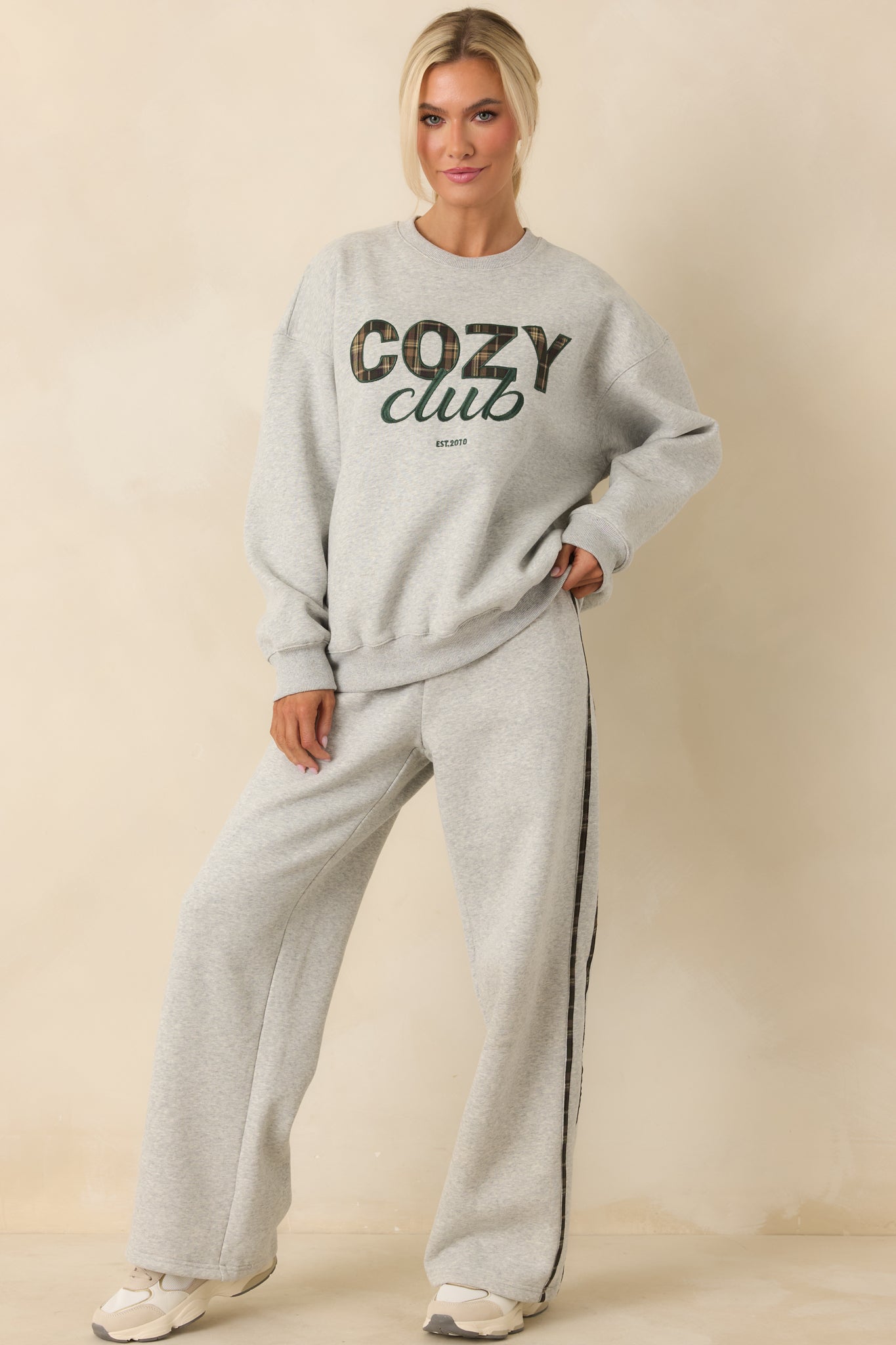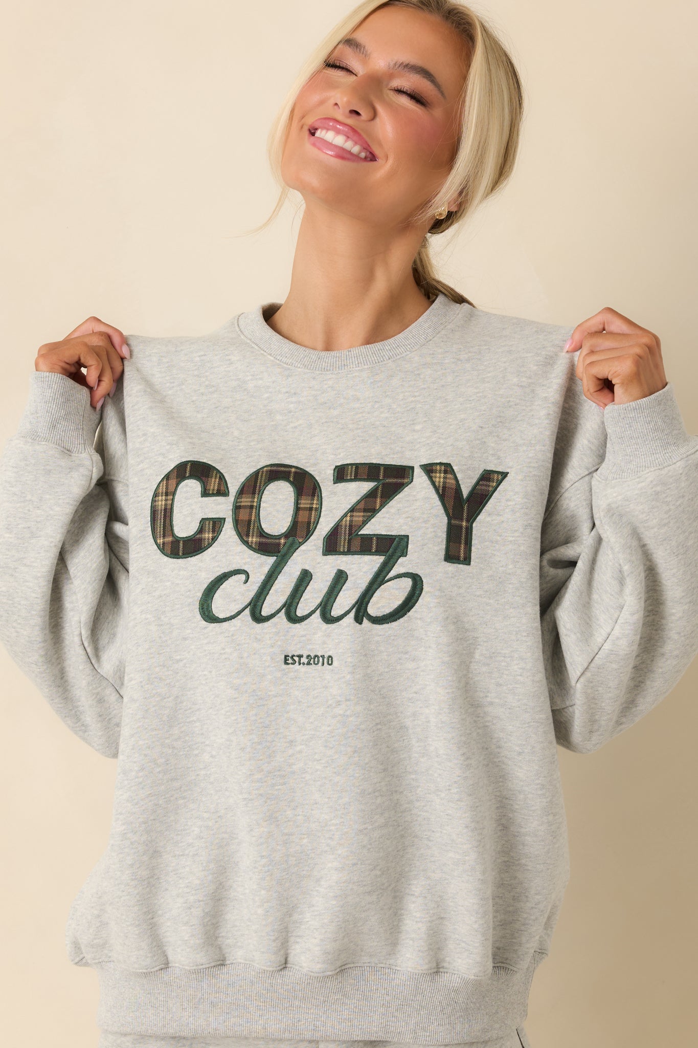 Welcome to the club. This Cozy Club Heather Grey Crewneck Sweatshirt is all about laid-back comfort with a classic. collegiate feel. The plaid lettering adds a touch of texture and charm. making it the kind of sweatshirt you'll keep reaching for on slow mornings. casual errands. and cozy nights in. This heather grey sweatshirt features a classic crew neckline. long sleeves. and a relaxed. easy-to-wear fit. Designed with ribbed trim at the neckline. cuffs. and hem. it's finished with a plaid “Cozy Club” graphic across the front and subtle embroidered details.