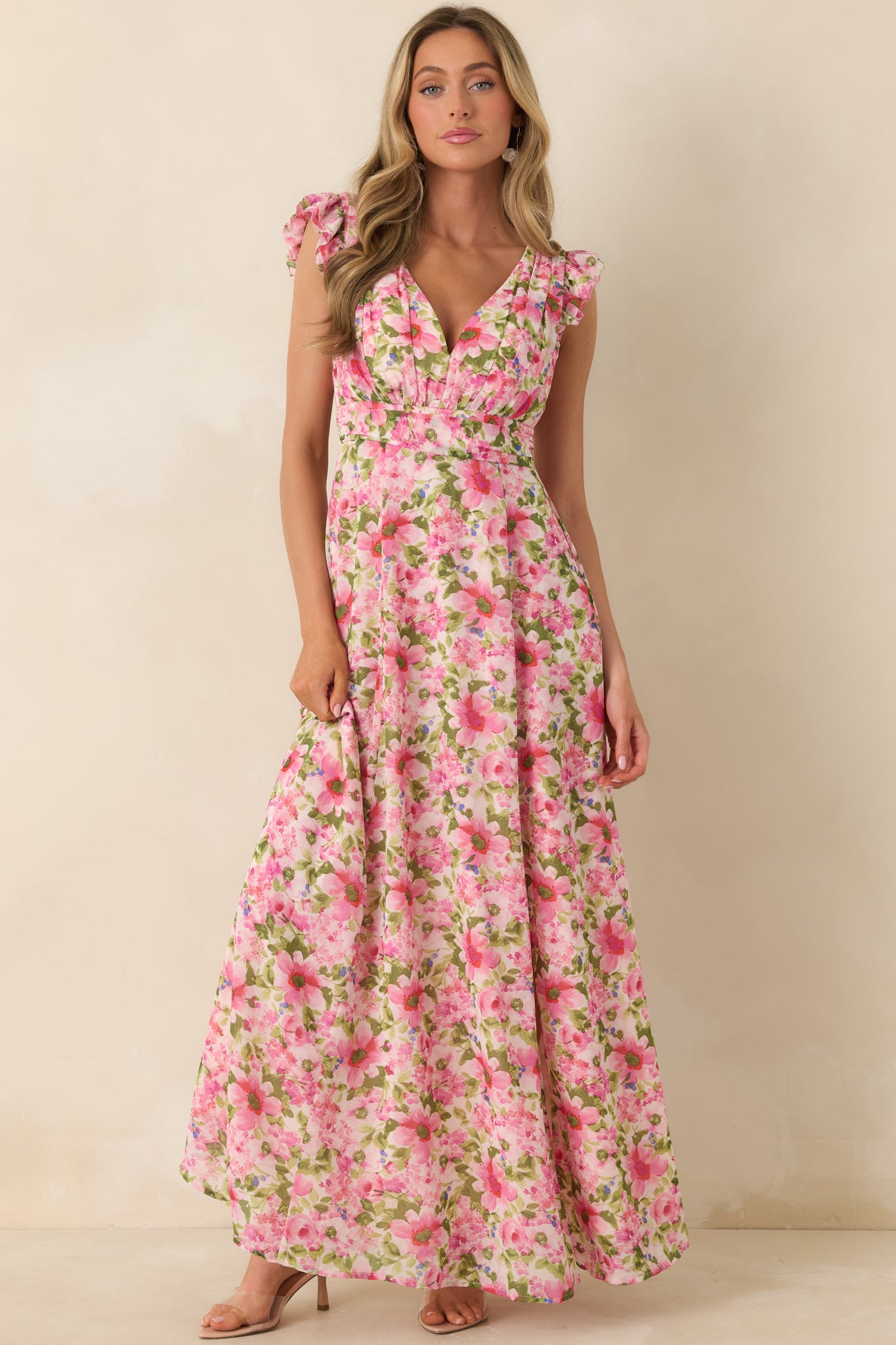 The Dancing In The Sun Pink Floral Sleeveless Maxi Dress is a joyful choice for embracing the happiness of life's carefree moments. It's perfect for those times when you want to feel lively and radiant. with a sense of freedom that makes every day feel like a celebration. This pink dress features a multicolor floral tulle overlay. light pink lining. pleated waist & bust detailing. a smocked back waist panel. small flutter shoulders. and a hidden back zipper.