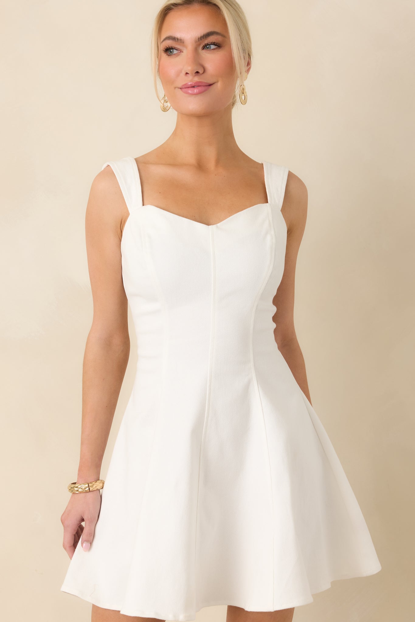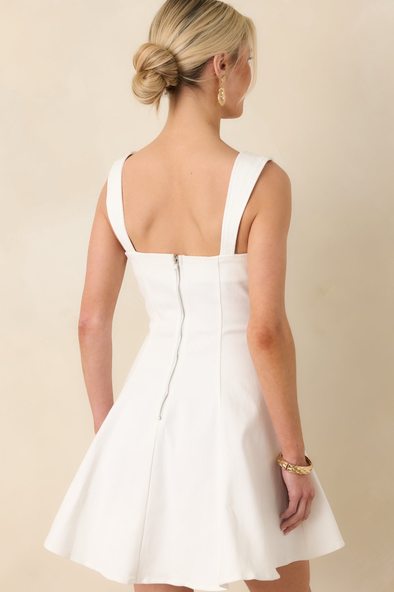 Effortlessly chic and undeniably versatile. this white cotton sleeveless denim mini dress is your go-to piece for warm-weather style. The crisp denim fabric offers structure and durability. while the sleeveless silhouette keeps you cool and comfortable. Perfect for layering with a jacket or wearing solo. this mini dress transitions seamlessly from casual daytime looks to evening outings. The timeless white wash pairs with everything in your wardrobe. making it an essential investment piece that works harder than you'd expect. This white dress features a silver hardware back zipper. a flattering fit and flare silhouette. a sleeveless design. and a paneled design that creates a more tailored look.