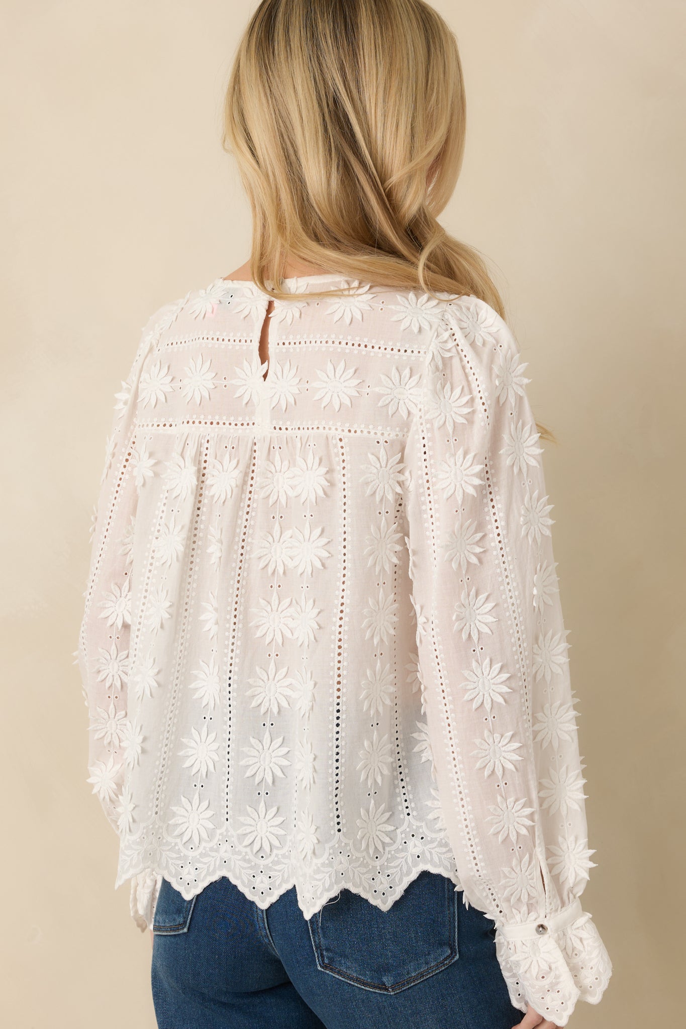 The Delicate By Design White Cotton Flower Appliqué Top is one of those pieces that instantly elevates your everyday denim. Soft floral appliqués add texture and charm. while the relaxed fit keeps it feeling easy and wearable. It's feminine without being fussy and perfect for when you want your outfit to feel special but still effortless. This white long sleeve top is crafted from lightweight cotton fabric and features raised floral appliqué detailing throughout for added texture and dimension. Designed with a relaxed silhouette. it includes a rounded neckline. long sleeves with subtle ruffle cuffs. and a straight hemline for easy styling.
