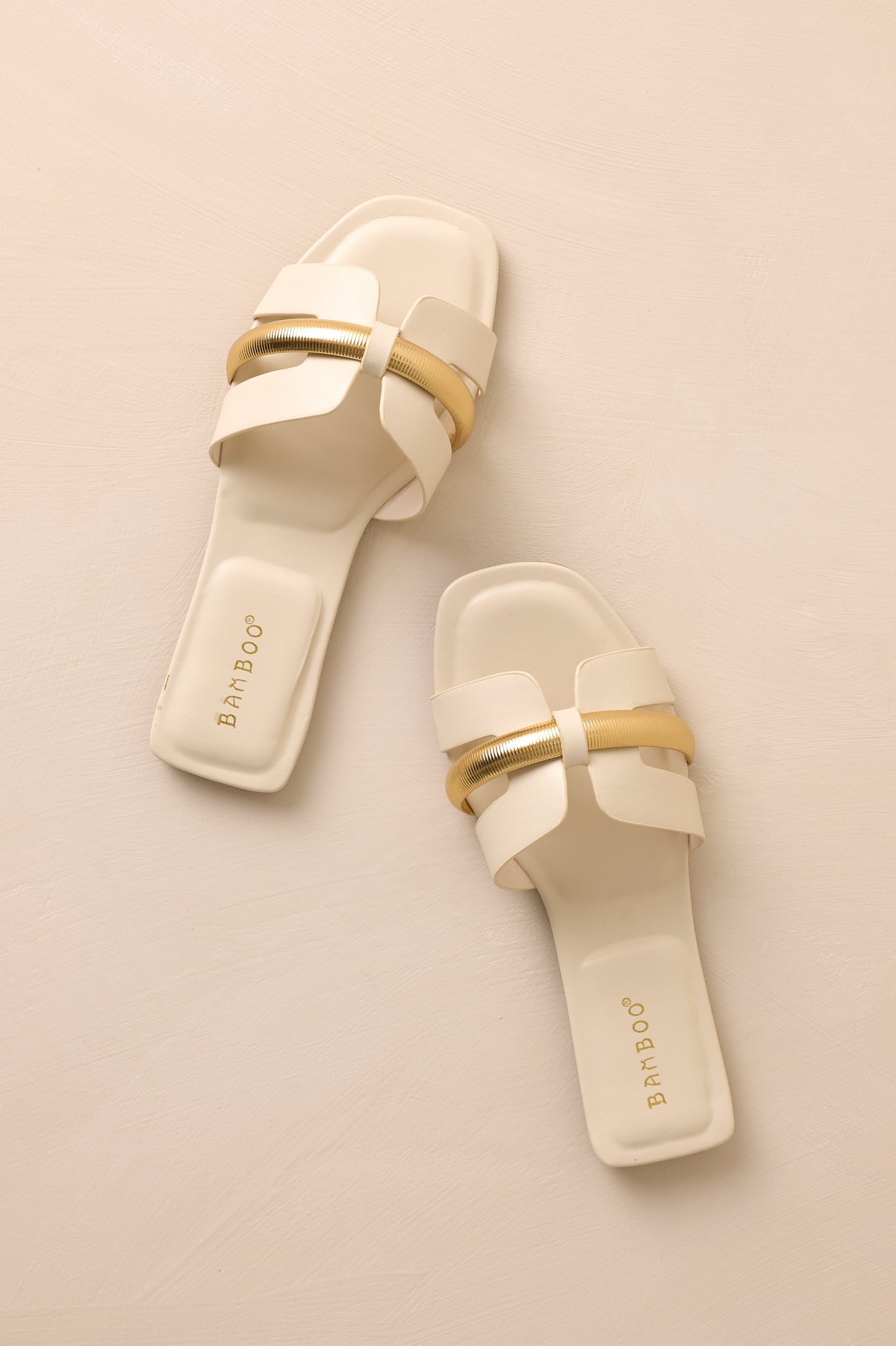 Step into style and comfort with our Easy Wander Ivory Sandals. These sandals feature a soft and durable sole for all-day wear. perfect for any adventure. With their easy slip-on design. you'll be ready to wander in no time. Say goodbye to uncomfortable shoes and hello to effortless fashion! These ivory sandals feature a square toe. an ivory & gold textured strap. a slip-on design. and a cushioned sole.