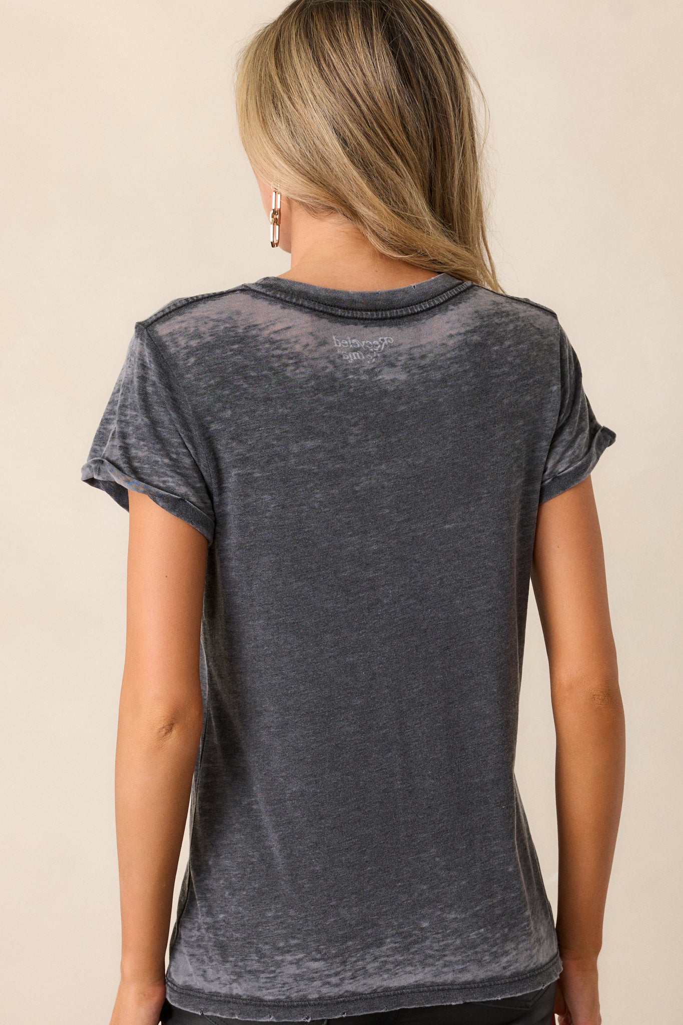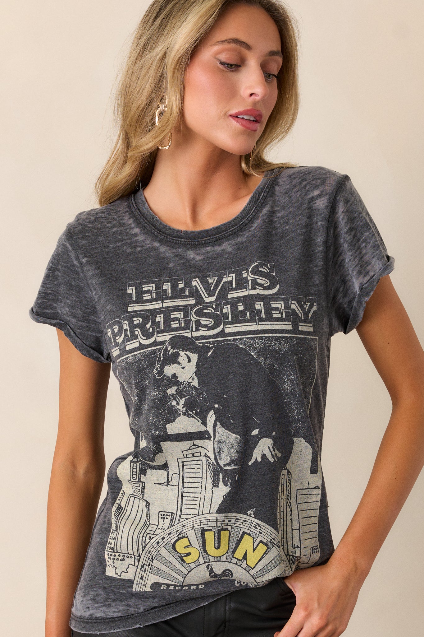 Get ready to rock and roll in style with our Elvis Presley Charcoal Acid Wash Tee. This stylish tee features a unique acid wash design and soft charcoal fabric for a vintage look and comfortable feel. Show off your love for the King of Rock and Roll with this must-have addition to your wardrobe. This charcoal tee features a crew neckline. Elvis Presley Design. acid wash detailing. distressed hem. and short cuffed sleeves.