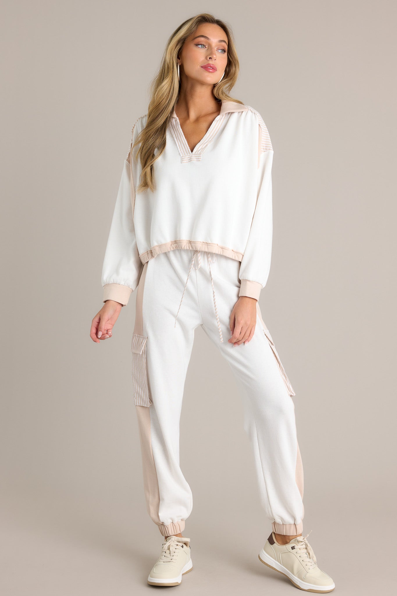 Introducing the Everyday Wonders Beige Cropped Oversized Sweatshirt - the perfect mix of style and comfort! Its cropped design and oversized fit make it ideal for everyday wear. while the beige color adds a touch of whimsy. Stay stylish and cozy in this sweatshirt! This beige cropped sweatshirt features a collared v-neckline. striped detailing. color blocking. an elastic waistband. an oversized fit. and cuffed long sleeves.