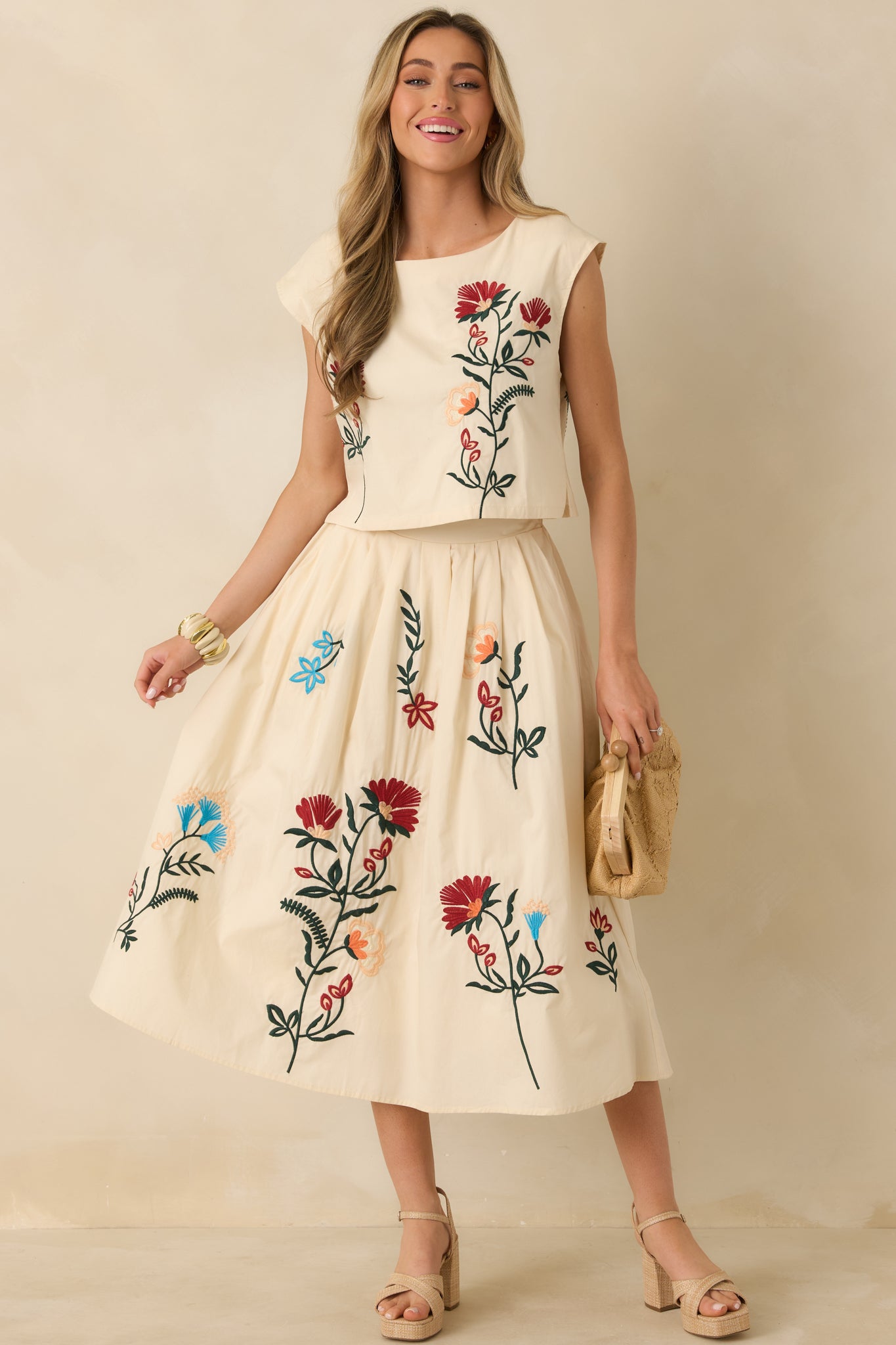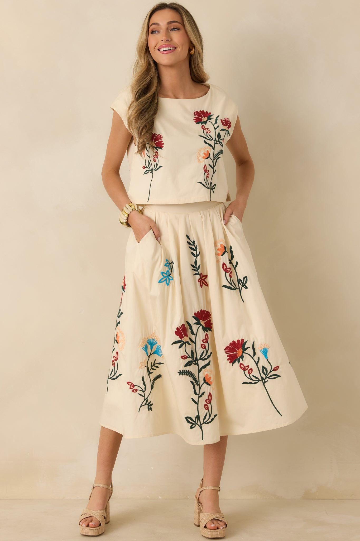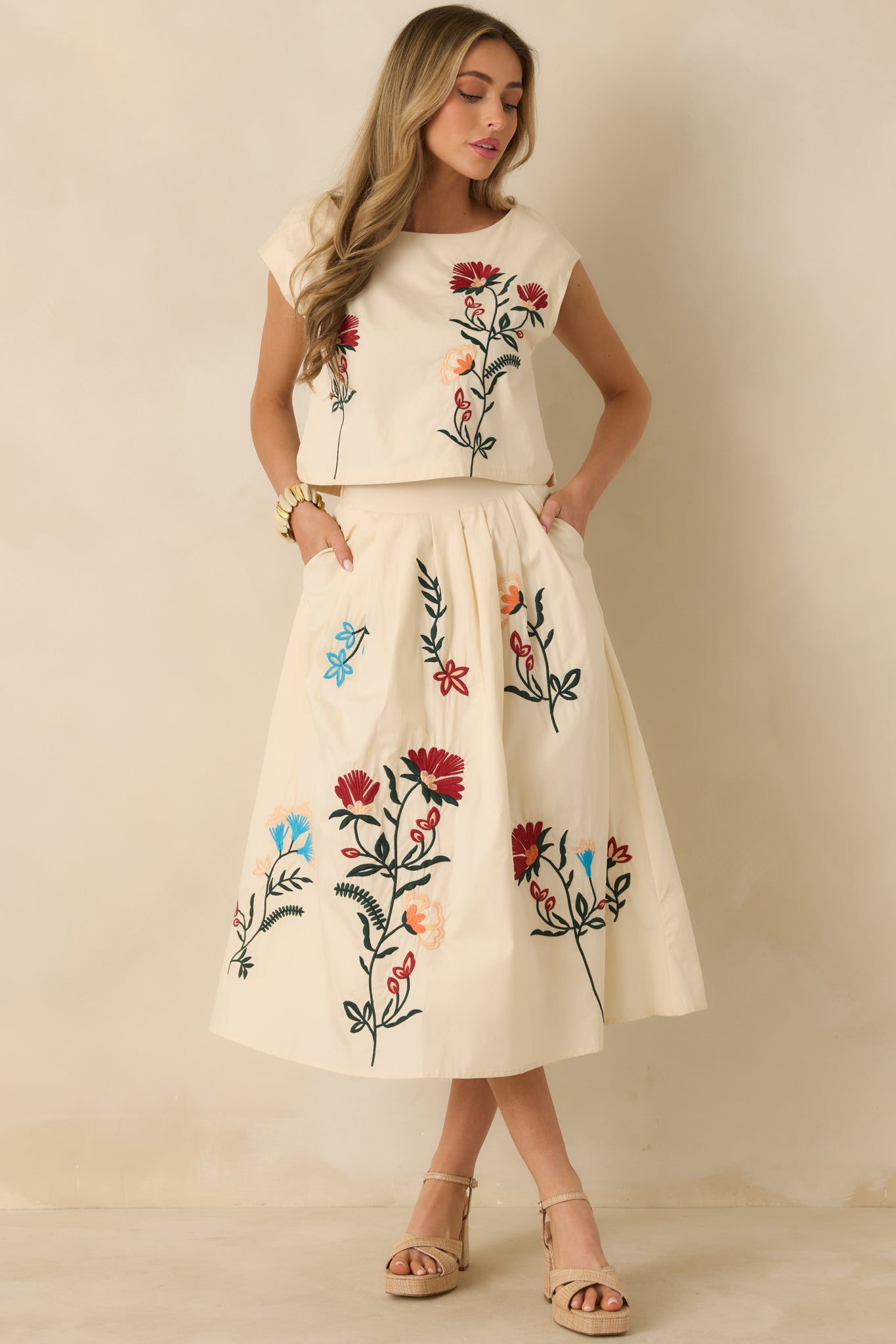 Found Treasures Natural Multi Floral Embroidered Midi Skirt is all about timeless beauty with an easy. wearable feel. Flowing embroidery winds across a soft natural base. giving the skirt movement and visual interest without feeling overdone. Designed to sit comfortably at the waist. it pairs effortlessly with the matching top or stands beautifully on its own for everyday styling that still feels elevated. This natural color skirt features floral embroidery throughout. Designed with a high-rise waist and a midi-length hem. it features soft pleating that allows for easy movement. Side pockets add everyday functionality. and the skirt is fully lined for comfortable wear.