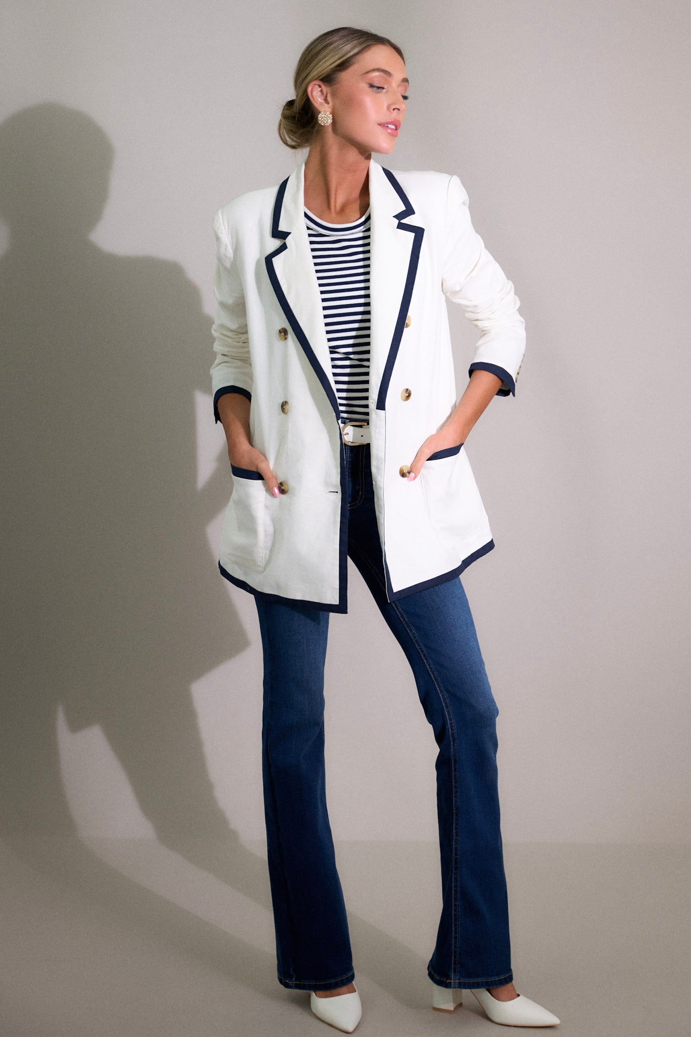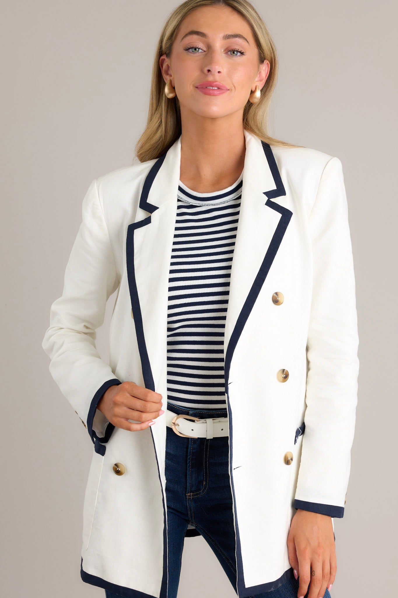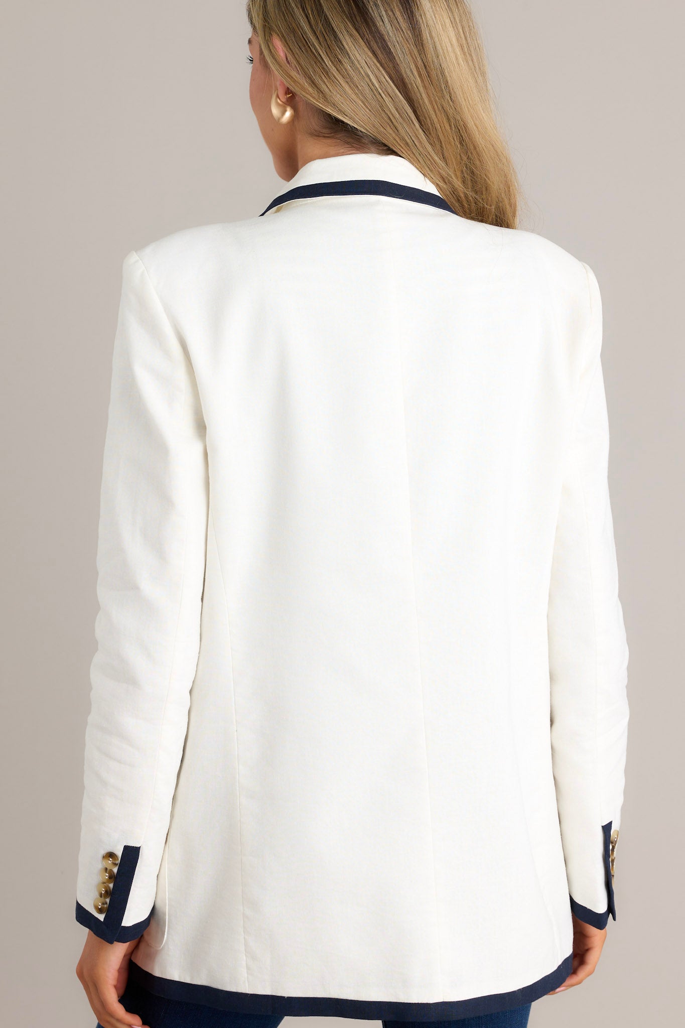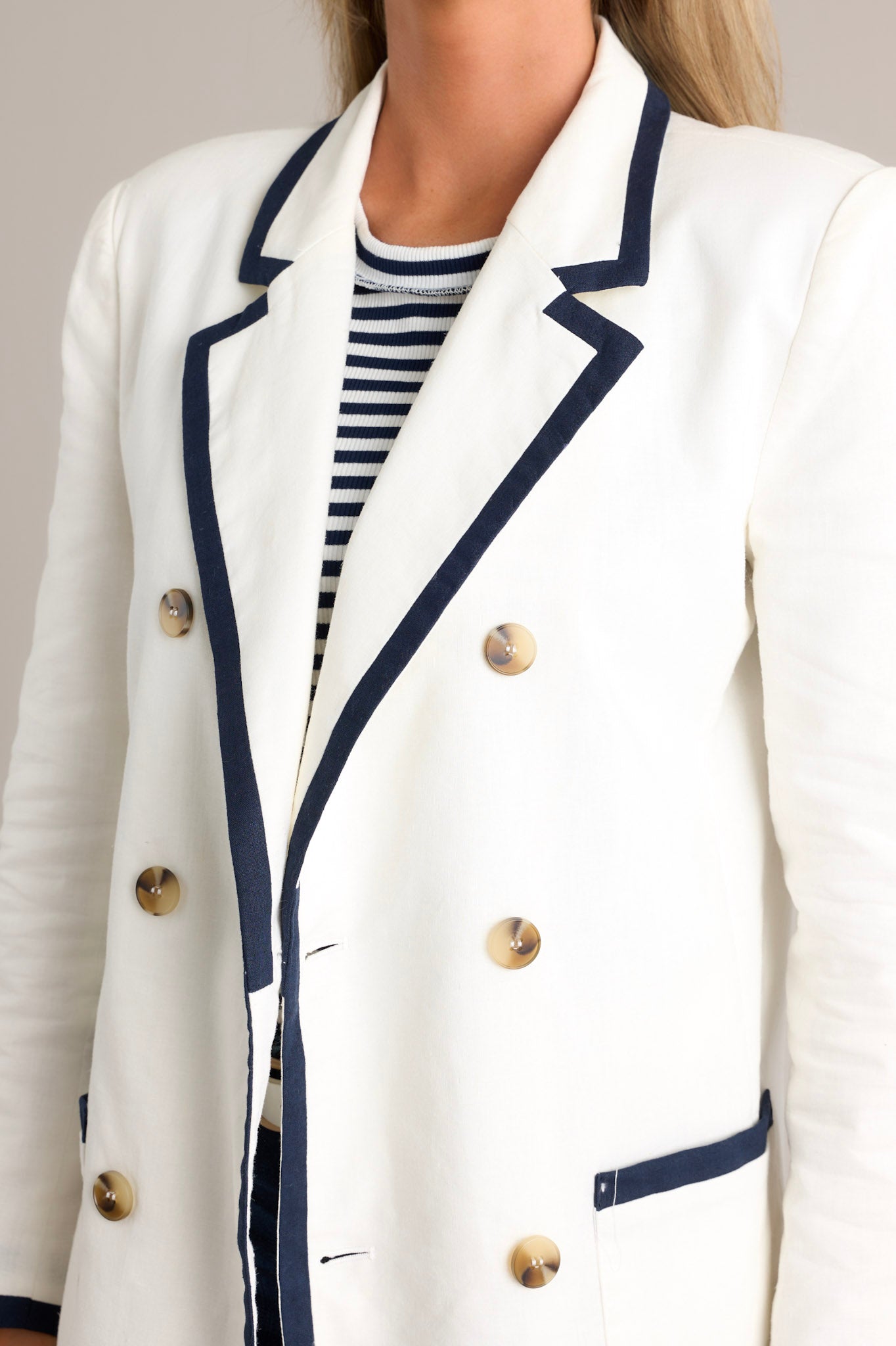 Unleash your inner fashionista with the Gleaming Grace White Double Breasted Blazer! This stunning blazer exudes elegance and style. perfect for any occasion. Made with high-quality materials. it offers both comfort and a sleek fit. Stand out with this unique and chic addition to your wardrobe. This white blazer features a notched lapel collar. shoulder padding. a double breasted design. functional buttons. functional pockets. and navy trim.