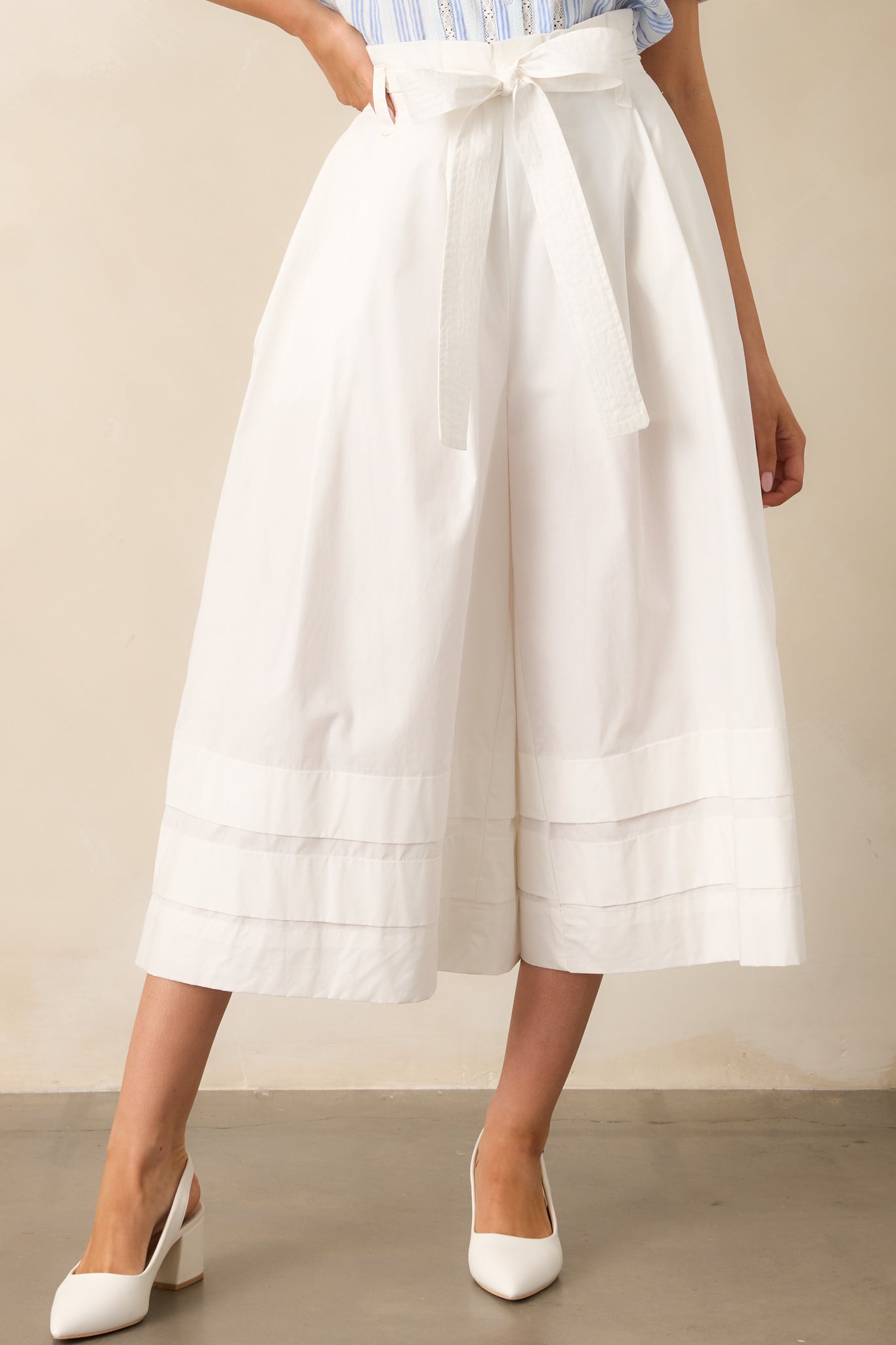 These Glimpse In Time 100% Cotton White Palazzo Pants are the perfect combination of style and comfort. With a wide leg design and cropped length. these pants will keep you looking stylish while also allowing for easy movement. The timeless white color is versatile and pairs well with any outfit. Stay in fashion with these unique and playful pants! These pants feature a high waisted design. a discrete side zipper. belt loops. a self-tie belt. functional pockets. a thick & folded hemline. and an extremely wide leg.