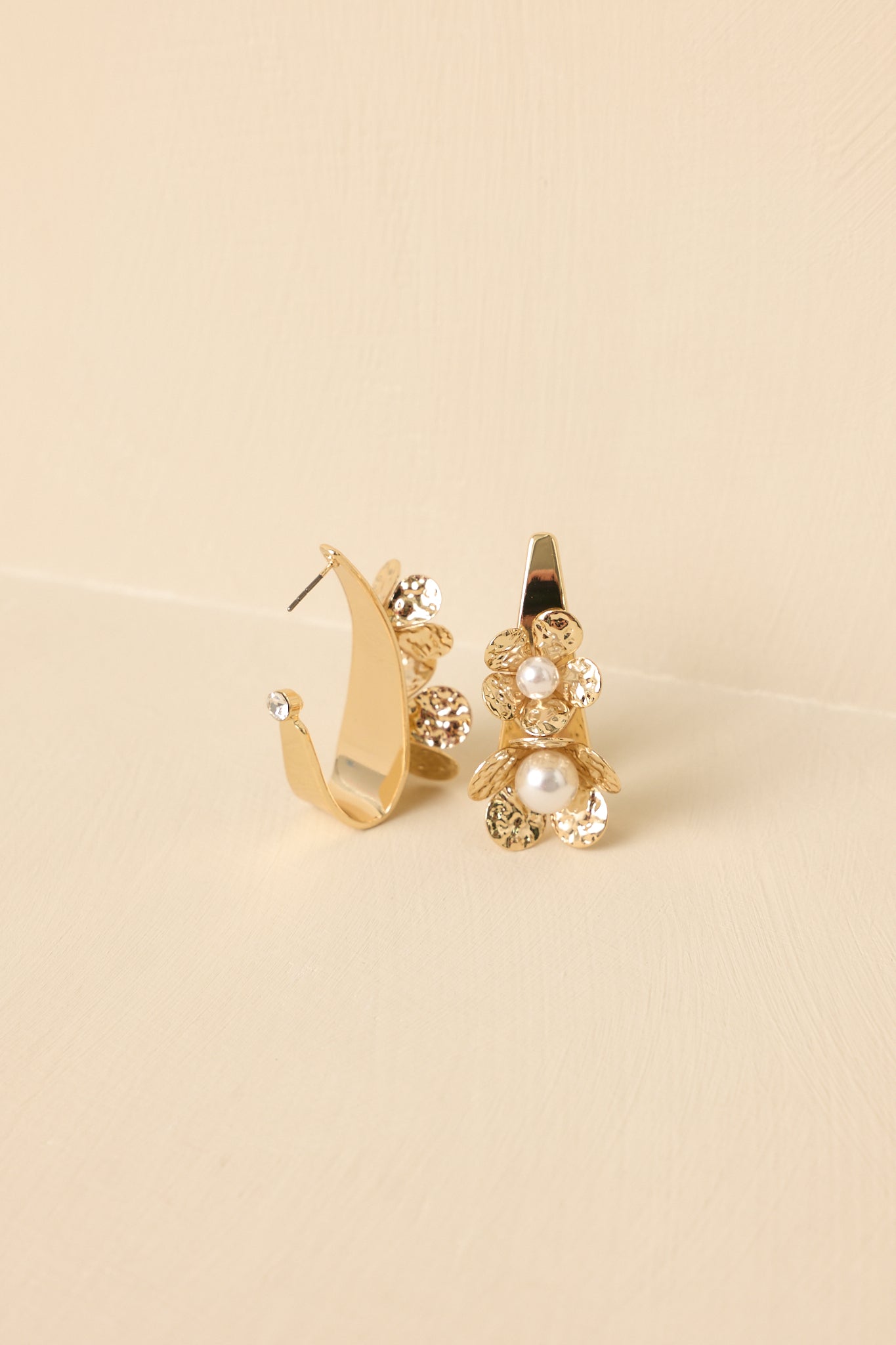 The Golden Petals Gold & Pearl Sculpted Floral Hoop Earrings bring a soft. romantic touch to any look. Designed with sculpted gold-tone petals and luminous pearl accents. these earrings feel equal parts timeless and artful. The open oblong hoop silhouette adds structure and visual interest. making them an easy statement whether you're dressing up a simple blouse or finishing an occasion-ready outfit. These gold-tone floral hoop earrings feature a sculpted floral design with textured petal detailing and pearl accents. Designed with a lightweight feel for comfortable wear. they secure with a post-back closure.