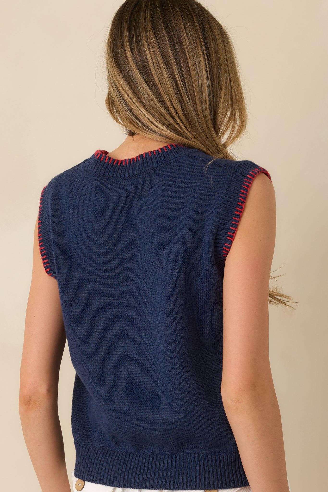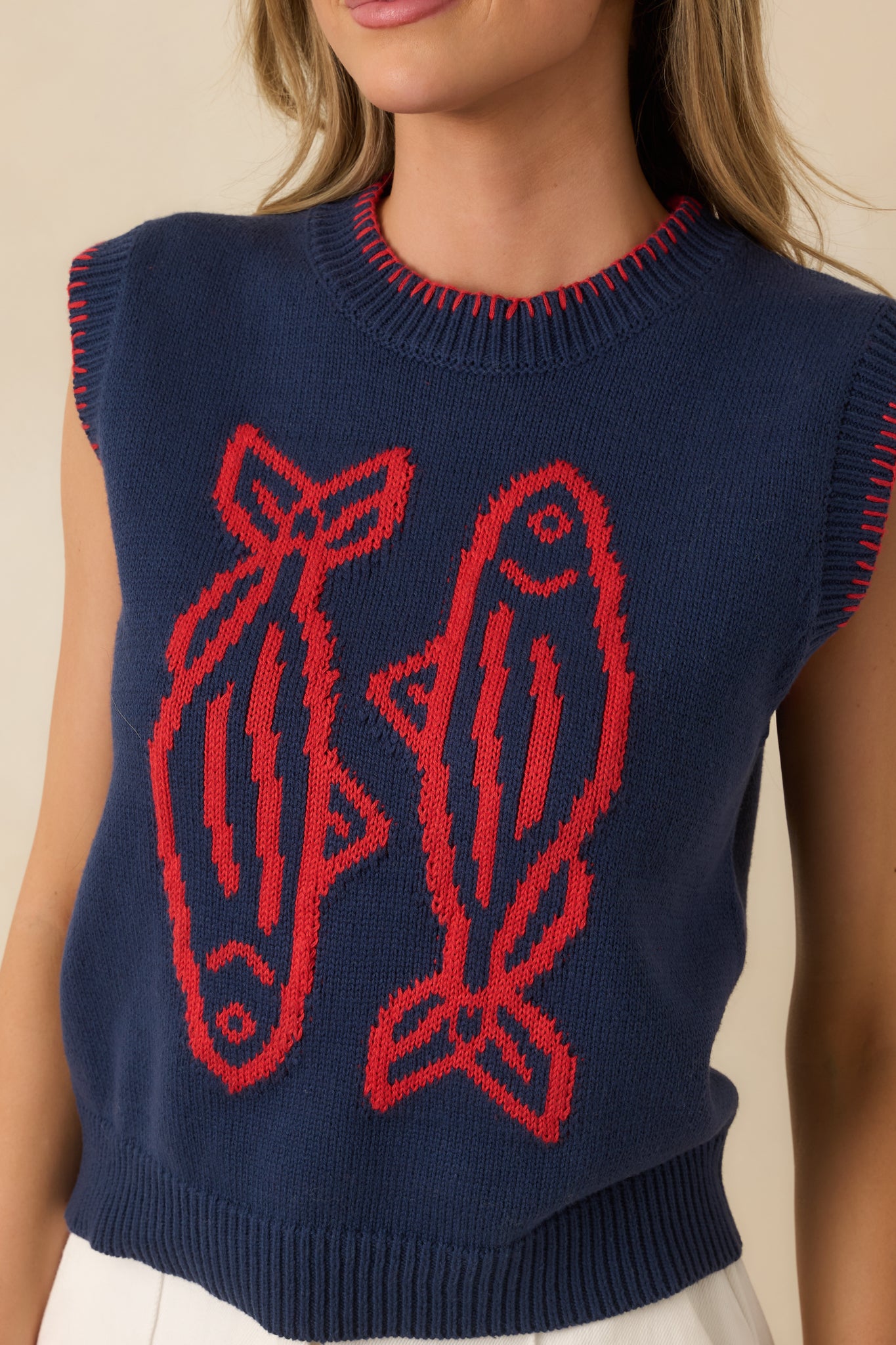 Playful meets polished in the Hooked On You Navy Knit Contrast Stitch Sweater Vest. The bold contrast stitching and twin fish motif add just the right amount of personality. while the classic navy knit keeps things grounded and easy to style. It's one of those pieces that sparks conversation without trying too hard—perfect layered over a crisp button-up or worn solo for a modern. off-duty feel that still looks intentional. This navy knit contrast stitch sweater vest features a sleeveless silhouette with a mock neckline. ribbed trim. and bold contrast edging. Designed with a statement fish graphic at the front and a relaxed. easy fit for comfortable layering.