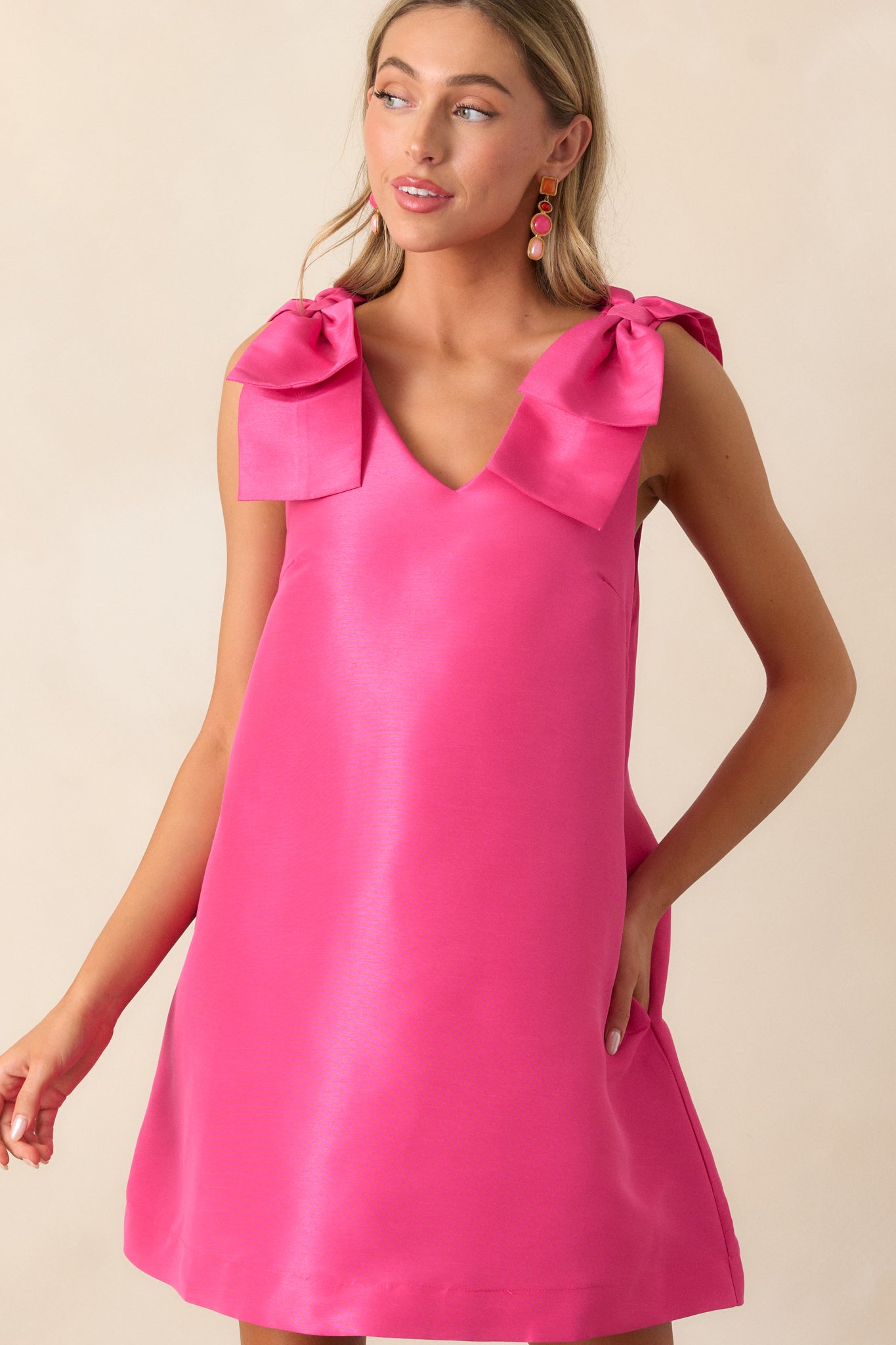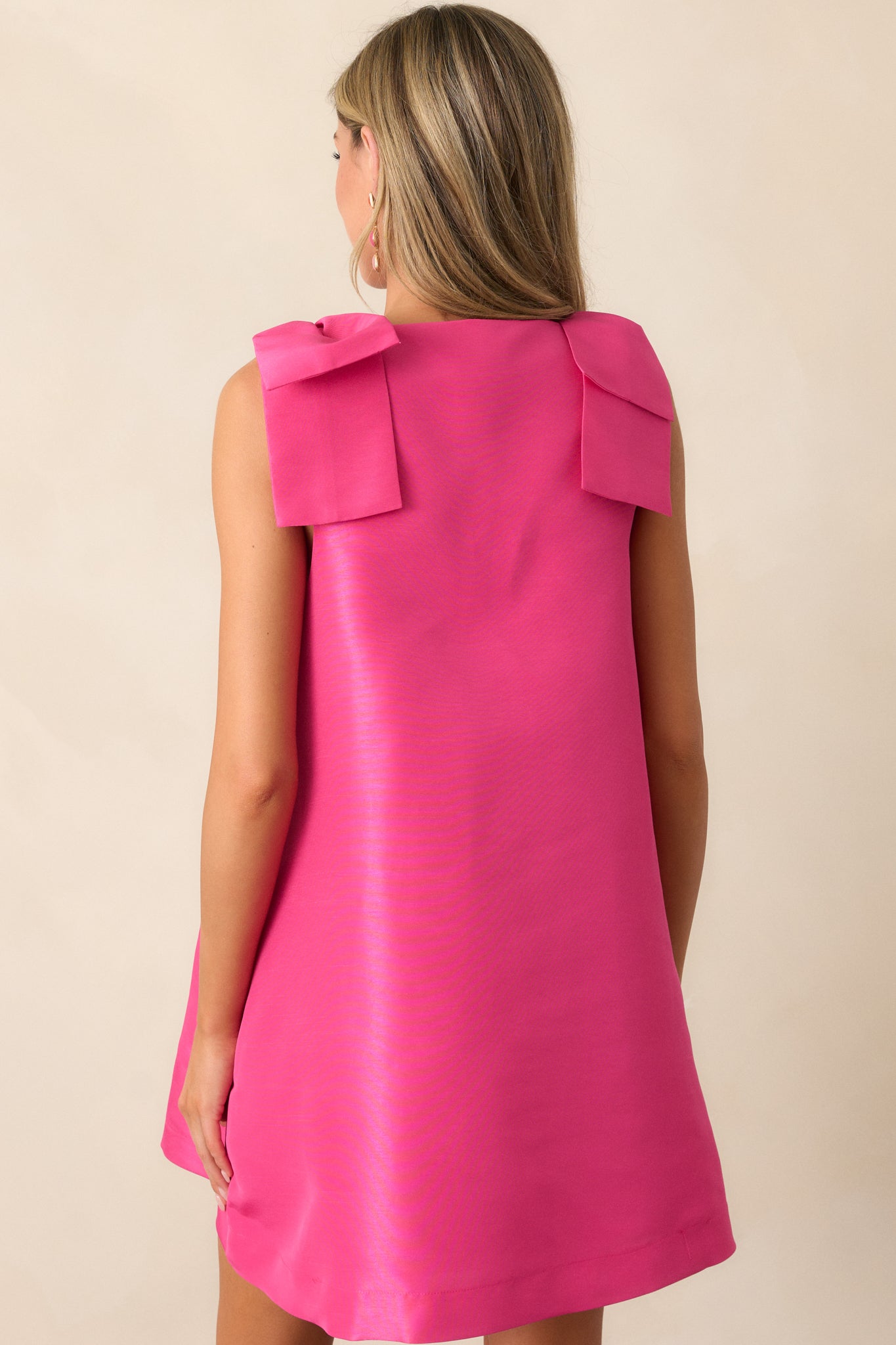 This How Can It Be dress is perfect for any occasion. Its vibrant fuchsia color and sleeveless design make it a stylish and comfortable choice. Whether you're headed to a party or a casual day out. this dress will keep you looking and feeling your best. Embrace its versatility and add it to your wardrobe today. This fuchsia mini dress features a v-neckline. a relaxed shift design. and bow detailing on both shoulders.
