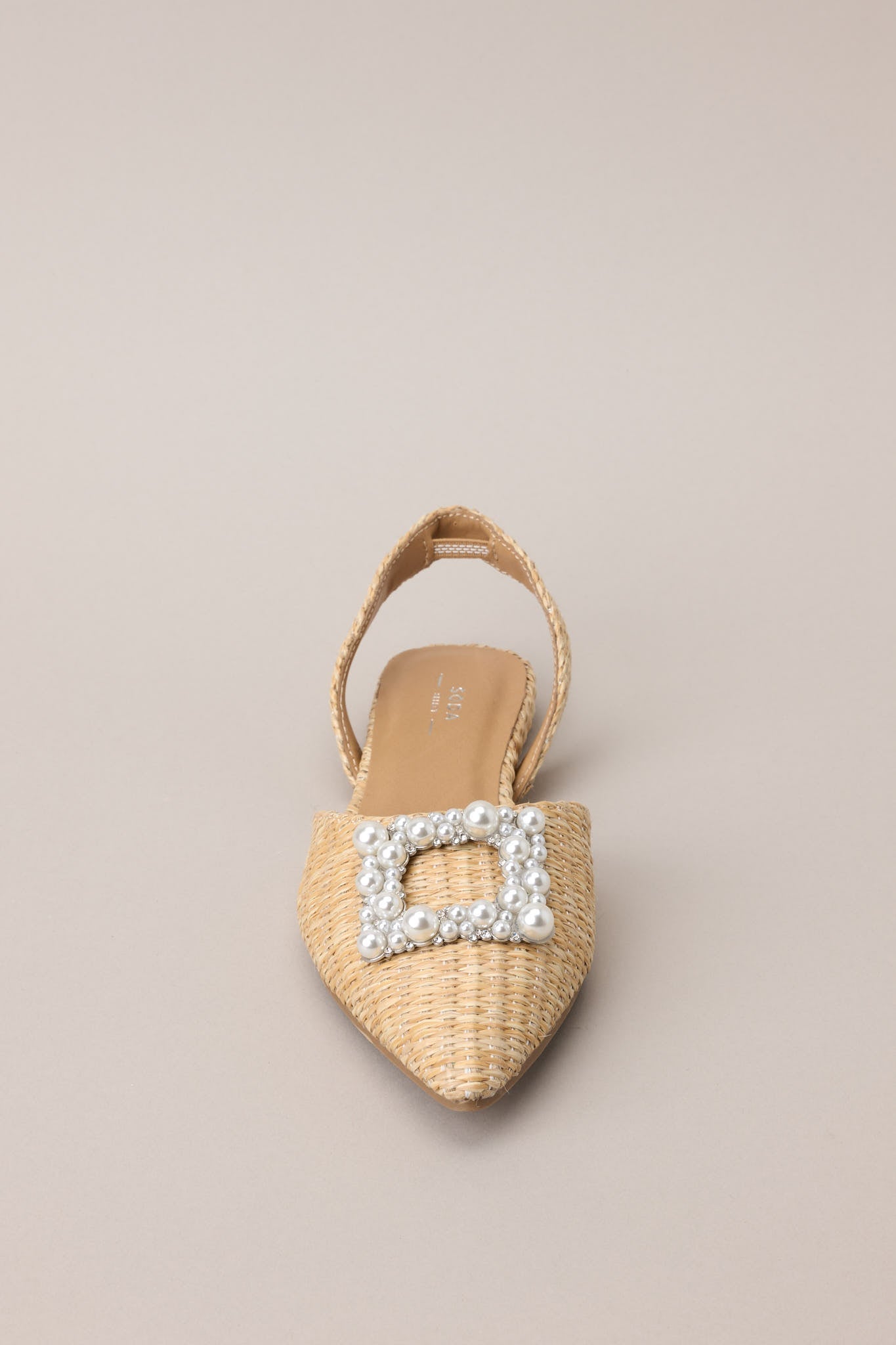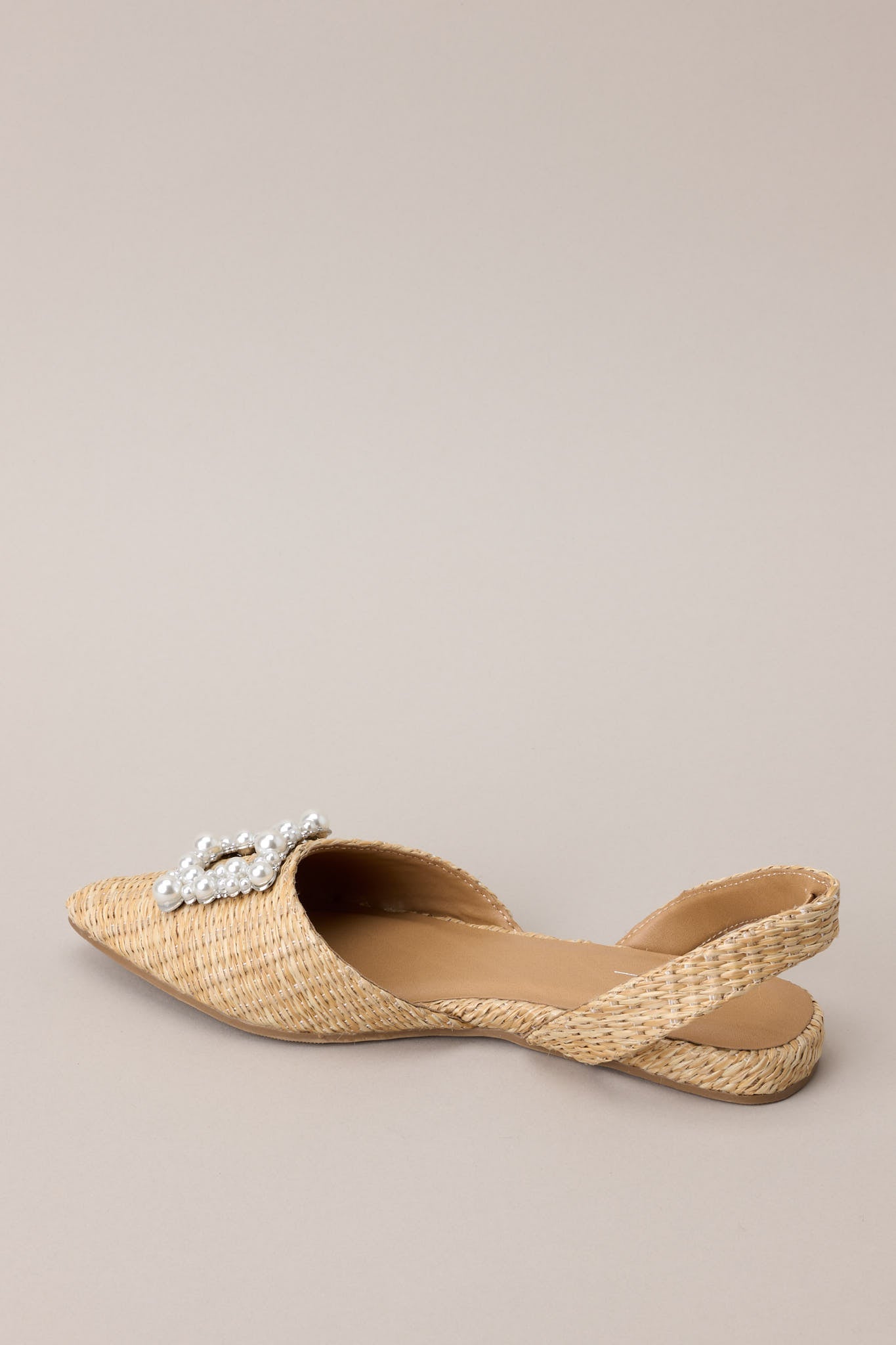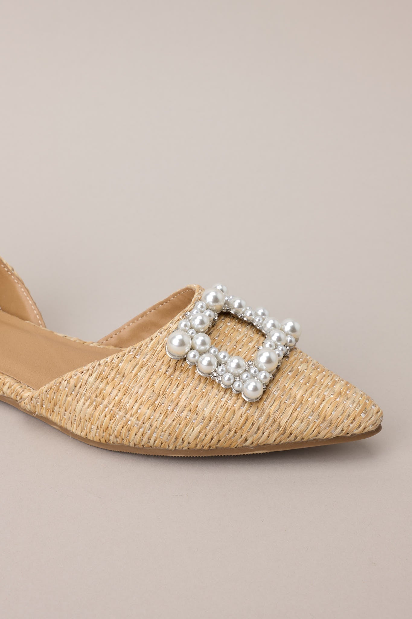 Introducing the Island Elegance Raffia Pearl Flats - the perfect combination of style and comfort! Crafted from high-quality raffia. these flats add a touch of elegance to any outfit. Plus. the pearl accents add a unique twist to the classic design. These Raffia flats feature a slip on design. a pointed toe. and a pearl encrusted accent.