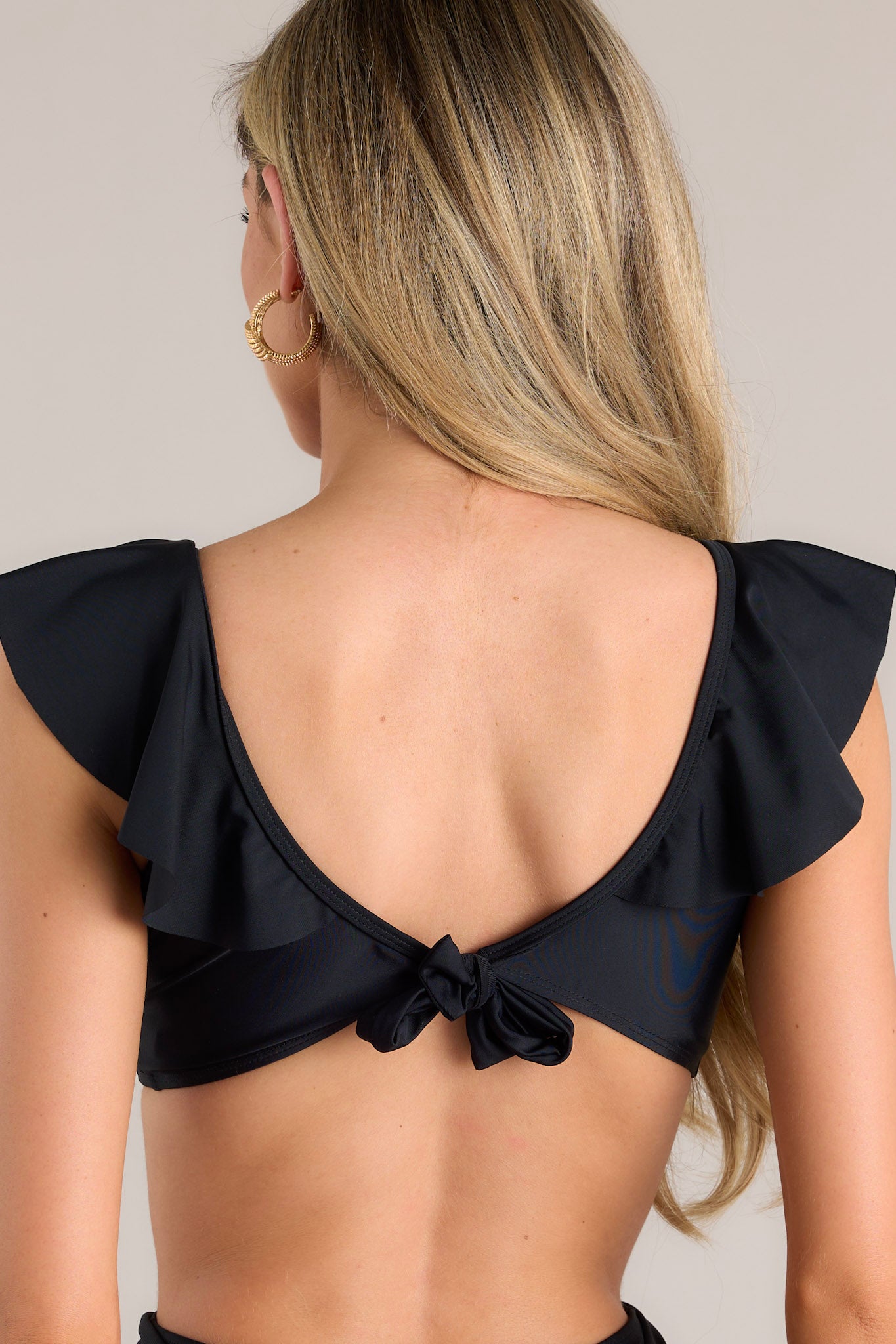 Discover your inner adventure with our Journey Within Black Bikini Top! This playful and quirky top is perfect for anyone looking to make a splash. With its sleek design and comfortable fit. you'll feel confident and ready for any journey that comes your way. This bikini top features a v-neckline. removable padding. gathering in the center. self-tie feature in the back. and ruffled sleeves.