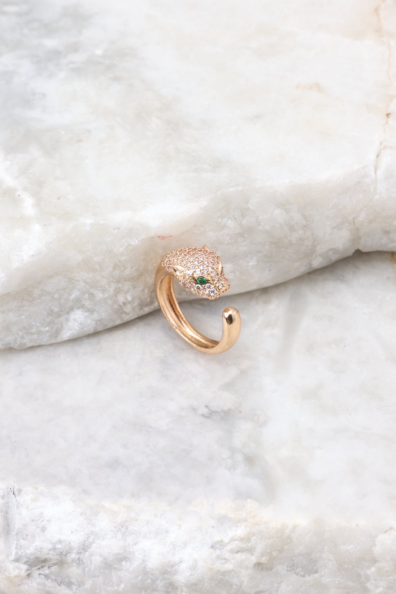 Add a hint of sparkle to your stacked ring collection with this dazzling gold rhinestone ring! A perfect balance of classy and cool. Don't miss your chance to snag this eye-catching bling--it's just a bite of luxurious style! This ring features a gold and rhinestone jaguar design and a slip on style and can be adjustable.